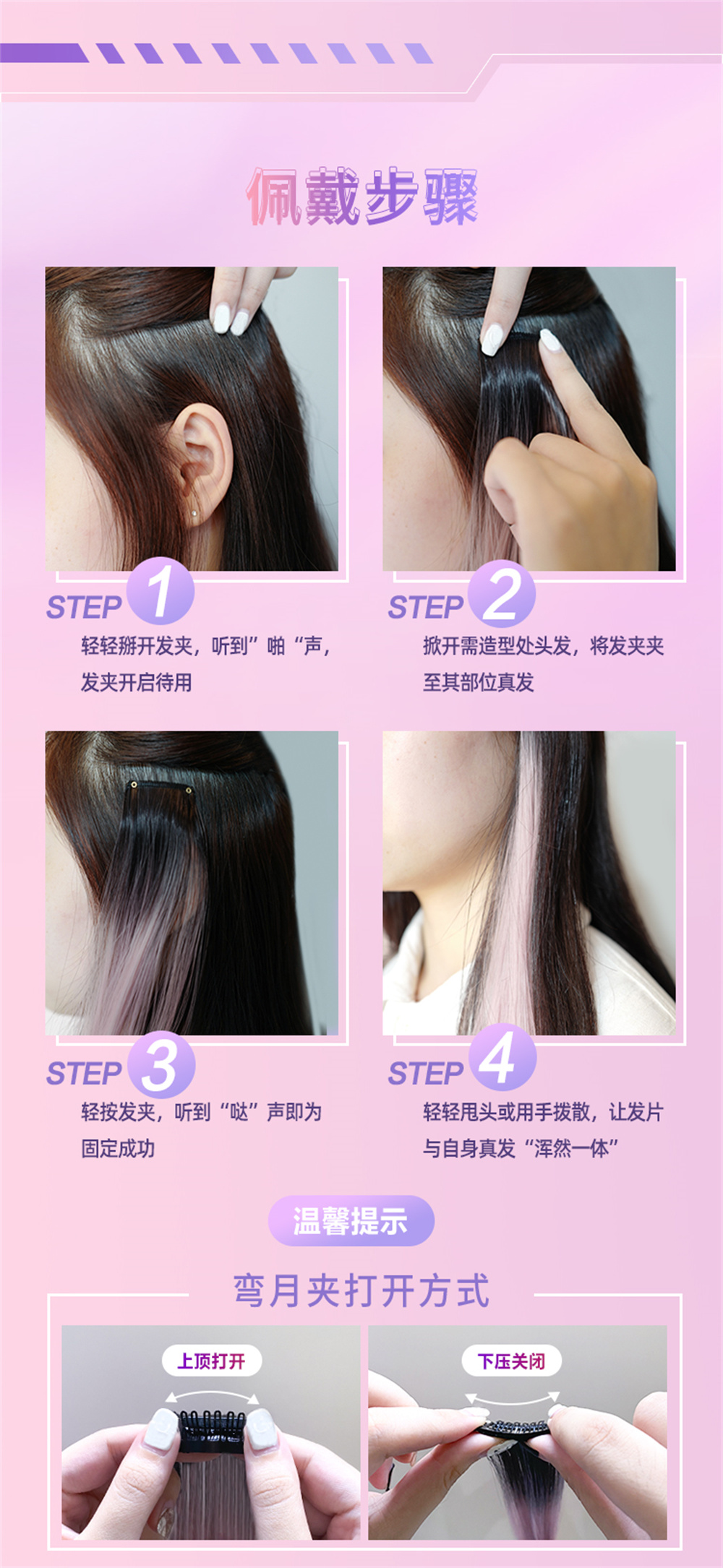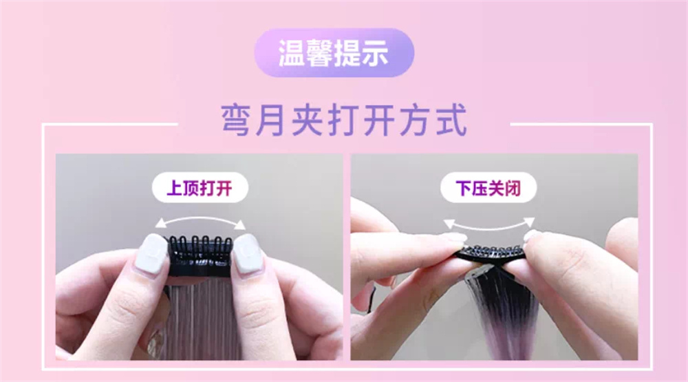 3:发夹是定制的弯月夹,在用的时候,发夹是挺贴头皮的,一整天也不会往下掉,取下来时也不会拉扯头发