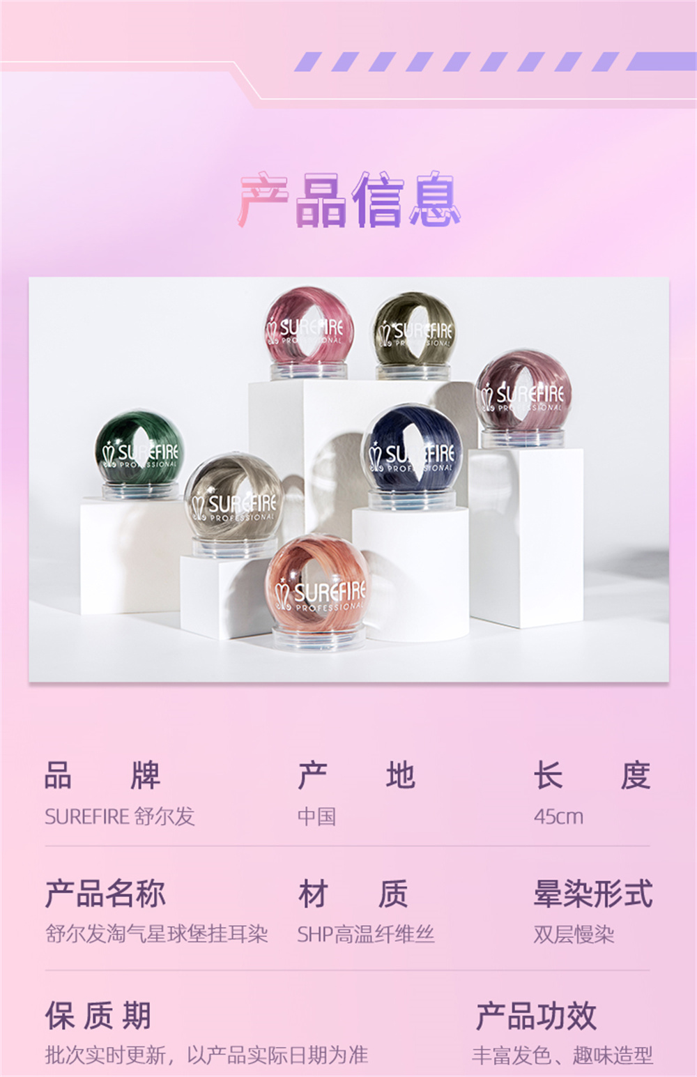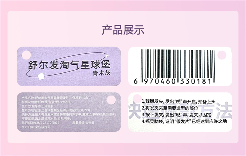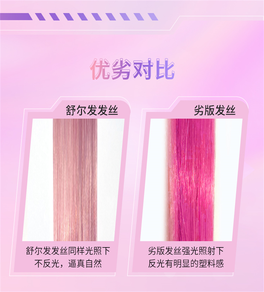 1:舒尔发的假发片材质是“SHP高温纤维丝”,完全就是真发质感,而且一梳到底,不会打结。