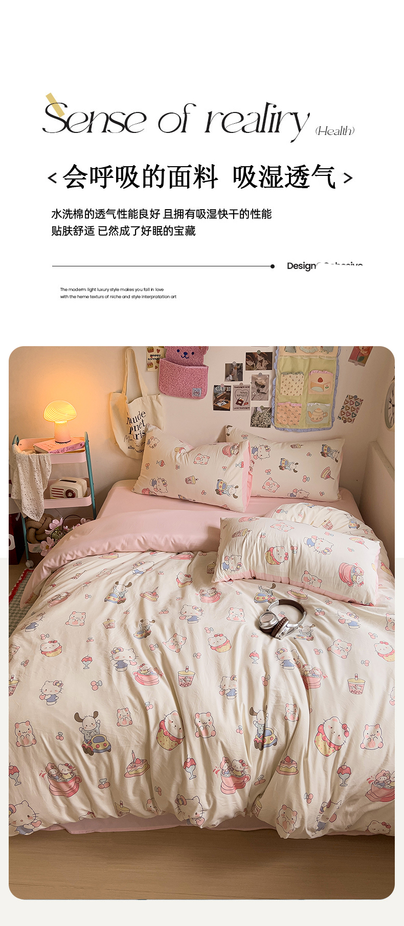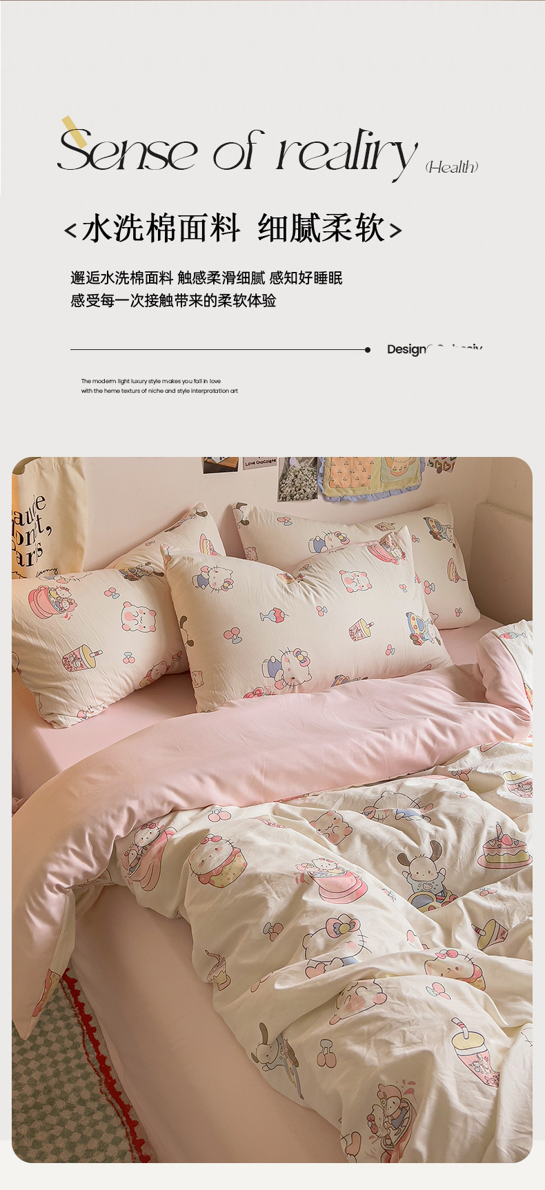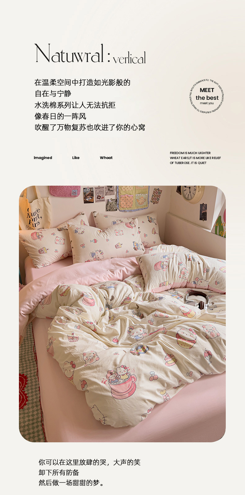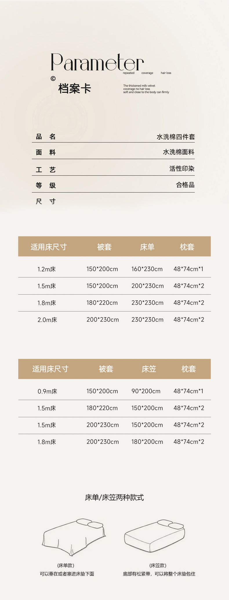 本商品为化纤水洗棉,由涤纶(聚酯纤维)制成,模仿纯棉水洗后的质感,更耐磨、抗皱。