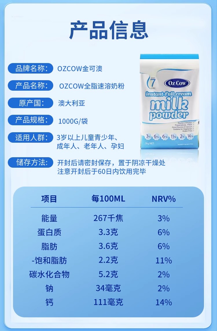 1kg OZCOW速溶全脂奶粉 澳大利亚进口 金可澳奶粉 正品保证