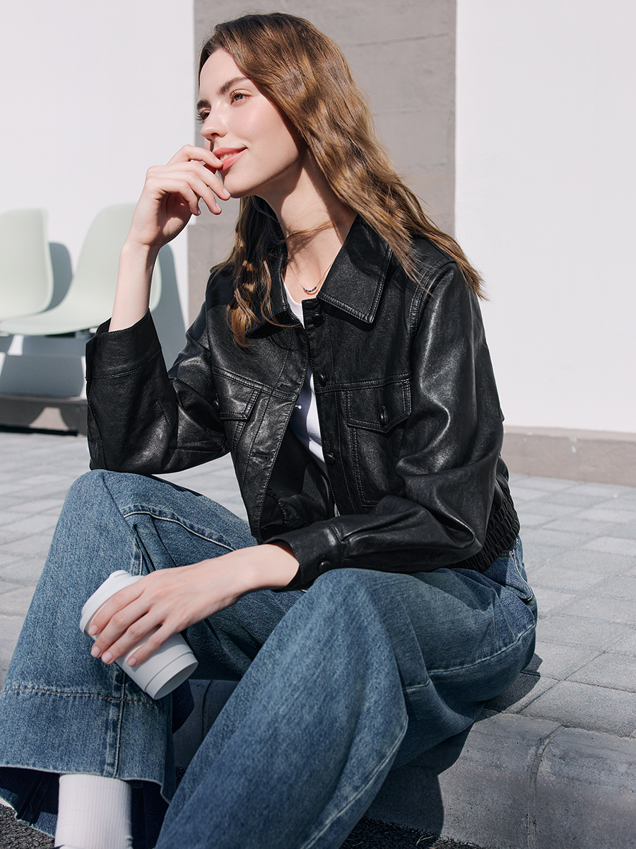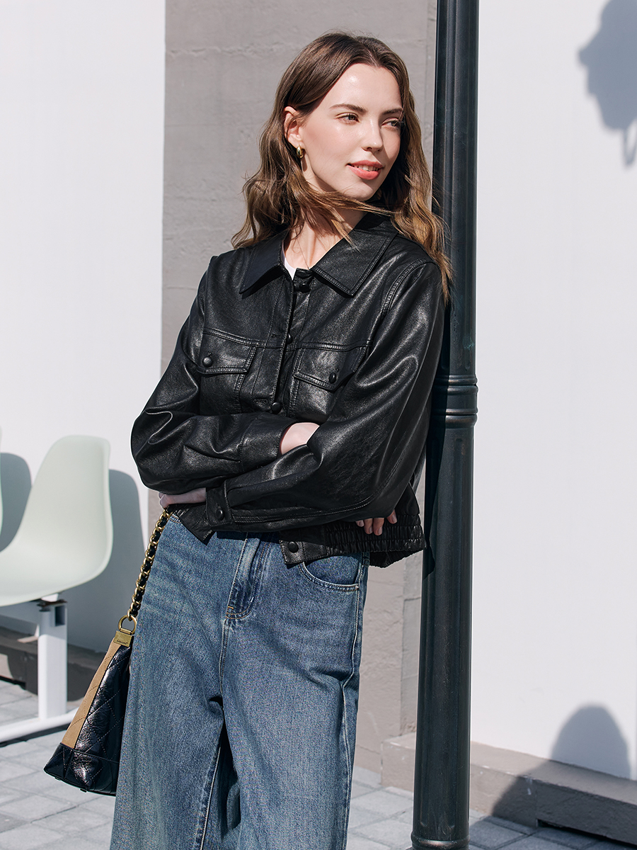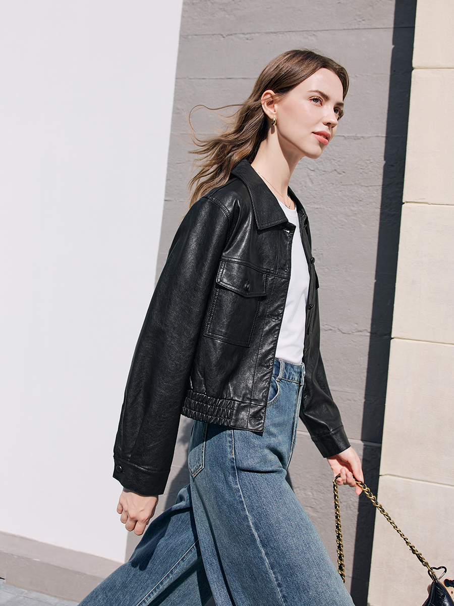 粘纤垂坠感强,做短款翻领 + 弹力下摆特别合适,