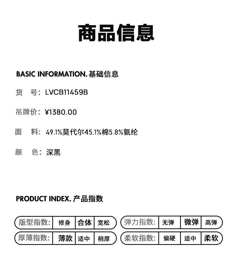 | 版型: 标准 | 材质成分: 莫代尔纤维(莫代尔)49.1% 棉45.1% 聚氨酯弹性纤维(氨纶)5.8% |