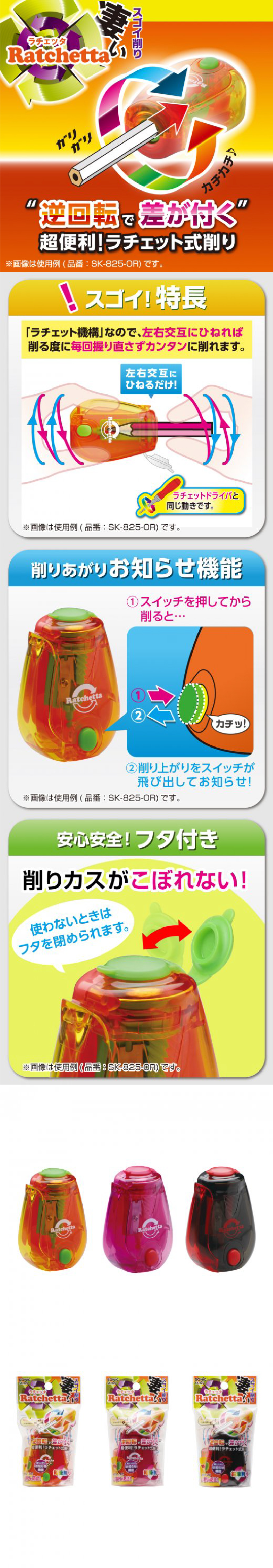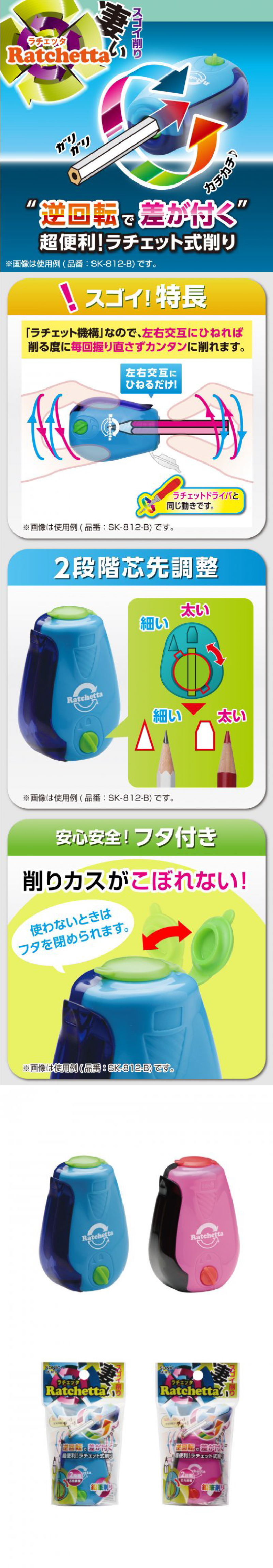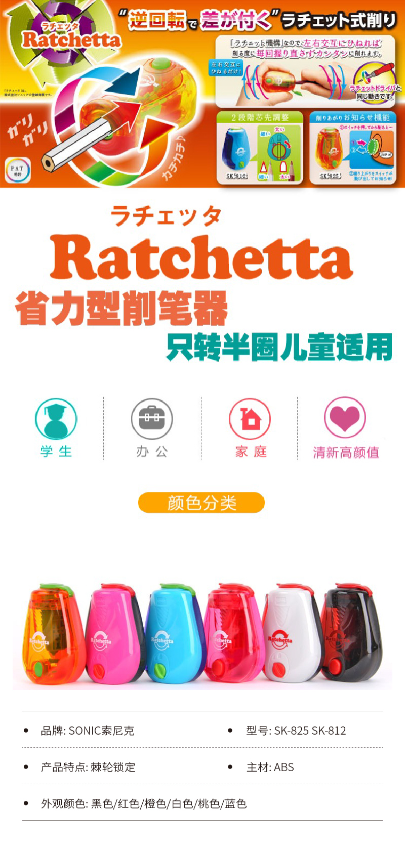日本SONIC索尼克Ratchetta棘轮两档回转/自动回弹卷笔刀削笔器