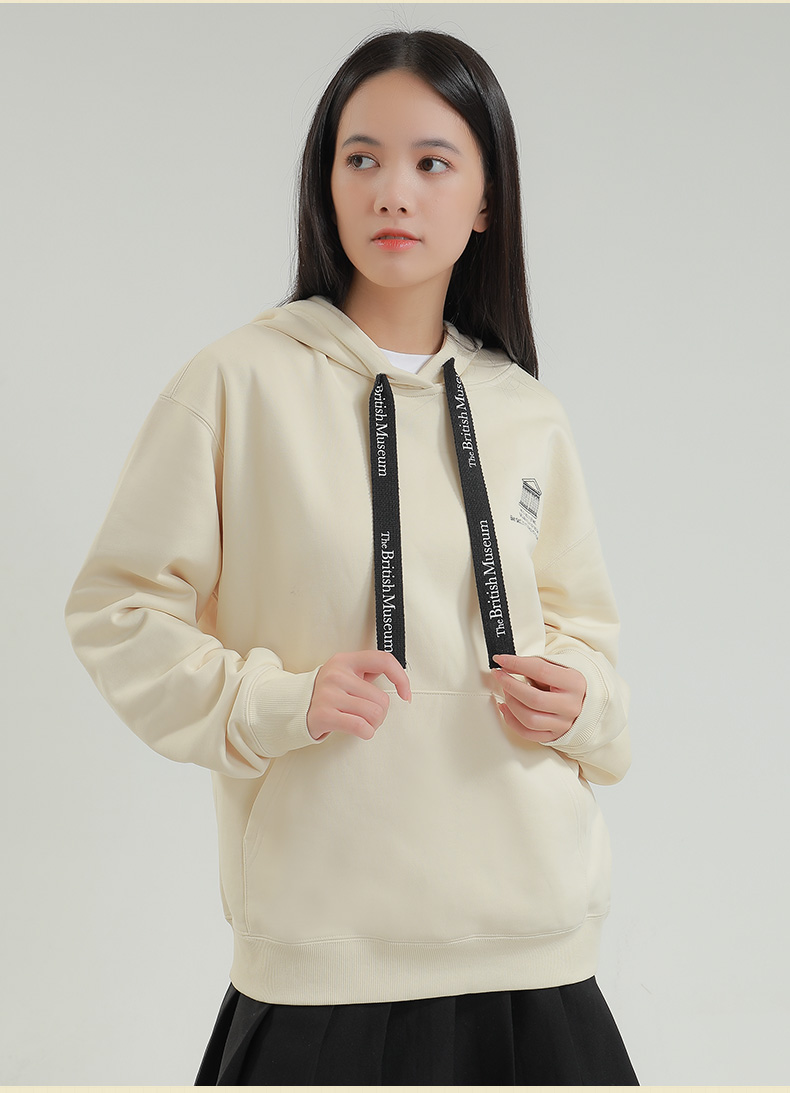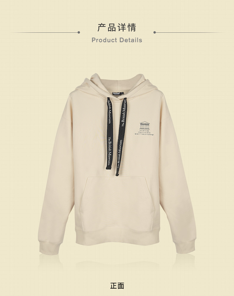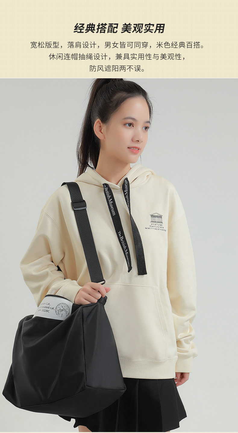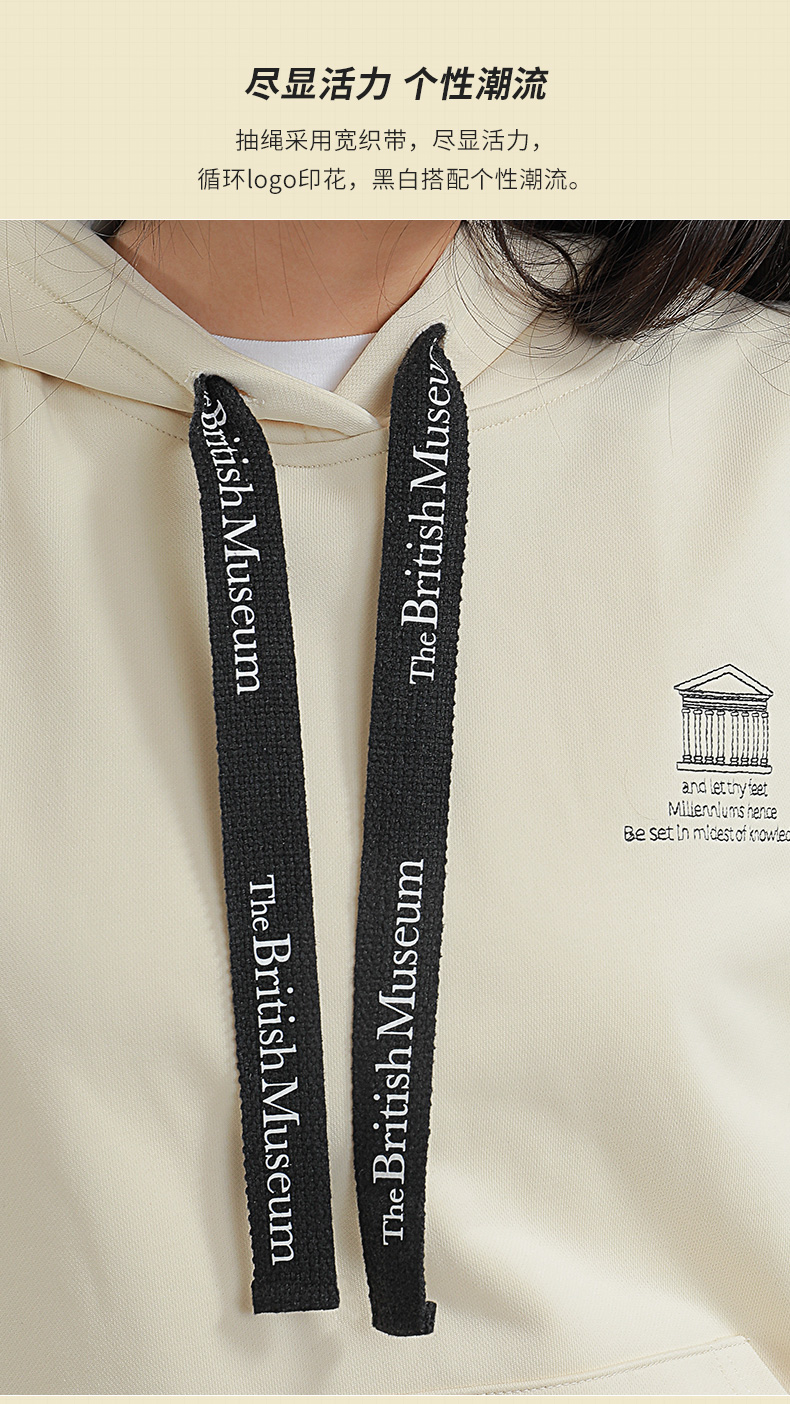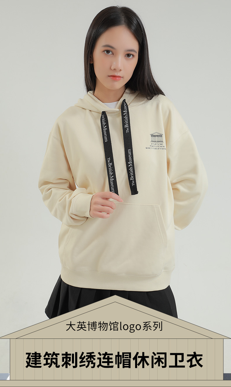 大英博物馆logo系列建筑刺绣男女同款米色连帽街头潮流休闲卫衣