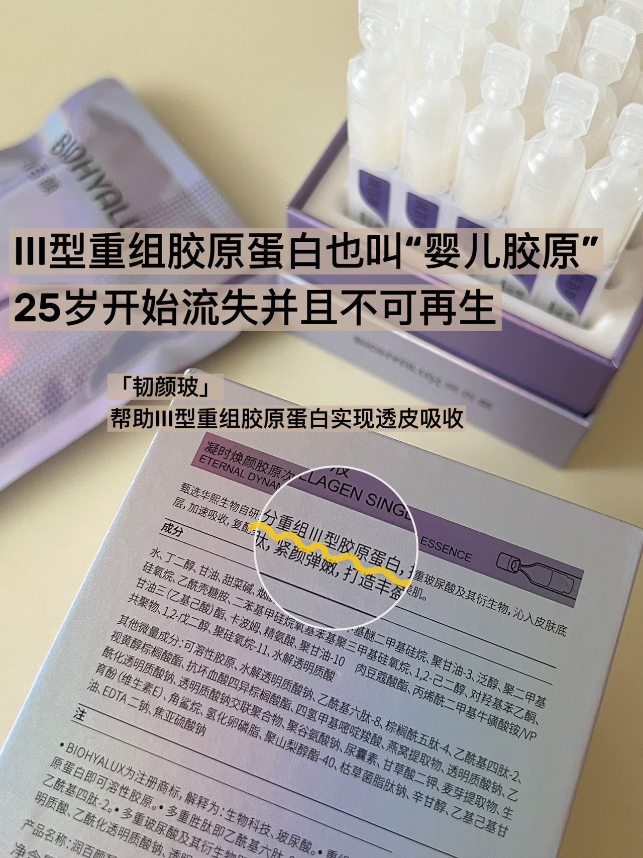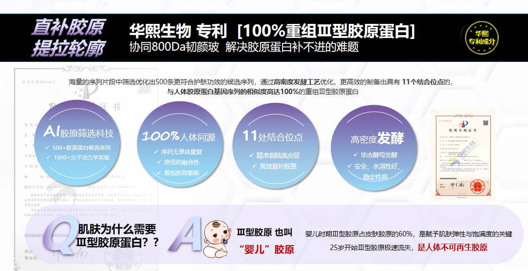 玻胶闪充科技➕最前沿的AI抗衰科技➕华熙自研的当家Ⅲ型重组胶原蛋白➕抗老双巨头:黄金双肽&A醇