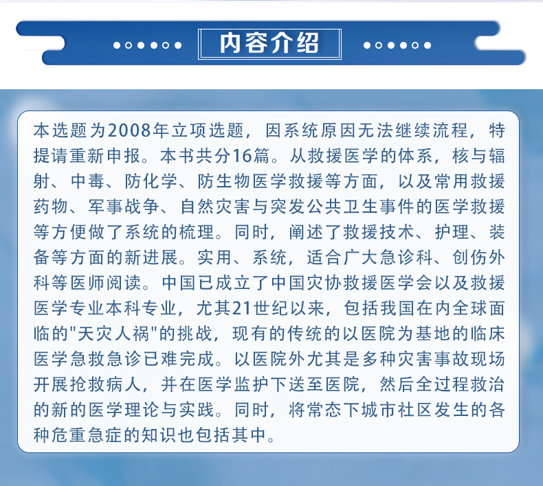 本选题为2008年立项选题,因系统原因无法继续流程,特提请重新申报。 本书共分16篇。从救援医学的体系,核与辐射、中毒、防化学、防生物医学救援等方面,以及常用救援药物、军事战争、自然灾害与突发公共卫生事件的医学救援等方便做了系统的梳理。同时,阐述了救援技术、护理、装备等方面的**进展。实用、**、系统,适合广大急诊科、创伤外科等医师阅读。国家已成立了中国灾协救援医学会以及救援医学专业本科专业,尤其21世纪以来,包括我国在内全球面临的"天灾人祸"的挑战,现有的传统的以医院为基地的临床医学急救急诊已难完成。以医院外尤其是多种灾害事故现场开展抢救病人,并在医学监护下送至医院,然后全过程救治的新的医学理论与实践。同时,将常态下城市社区发生的各种危重急症的知识也包括其中。