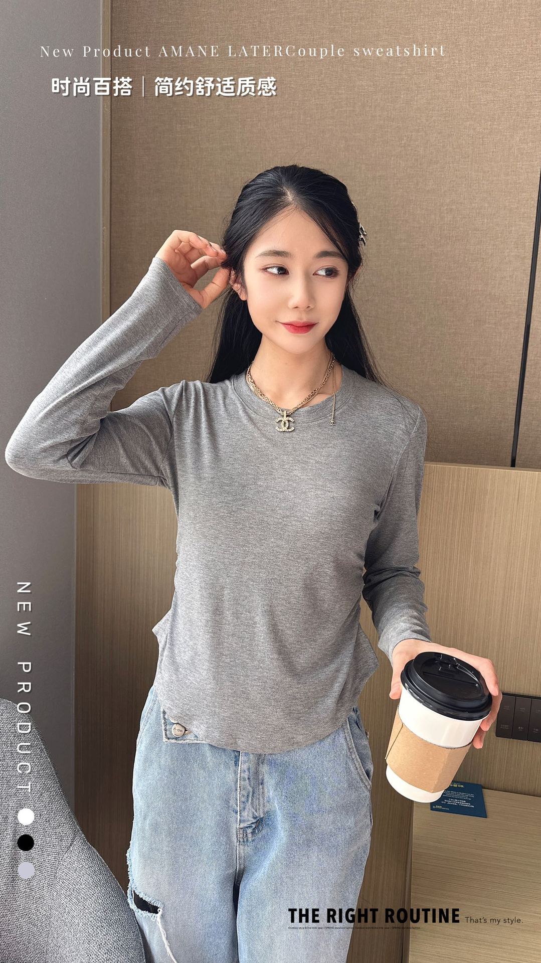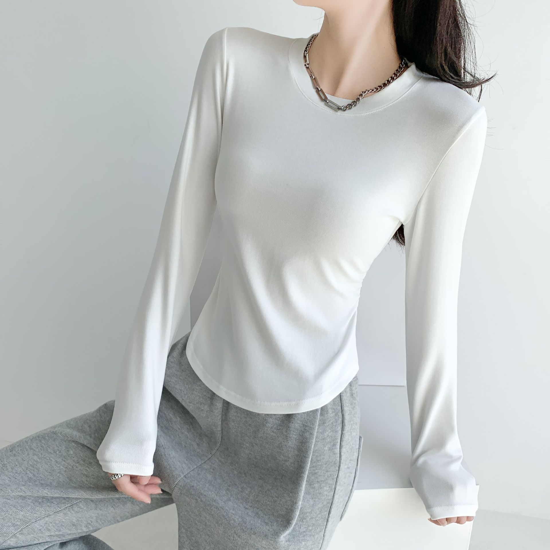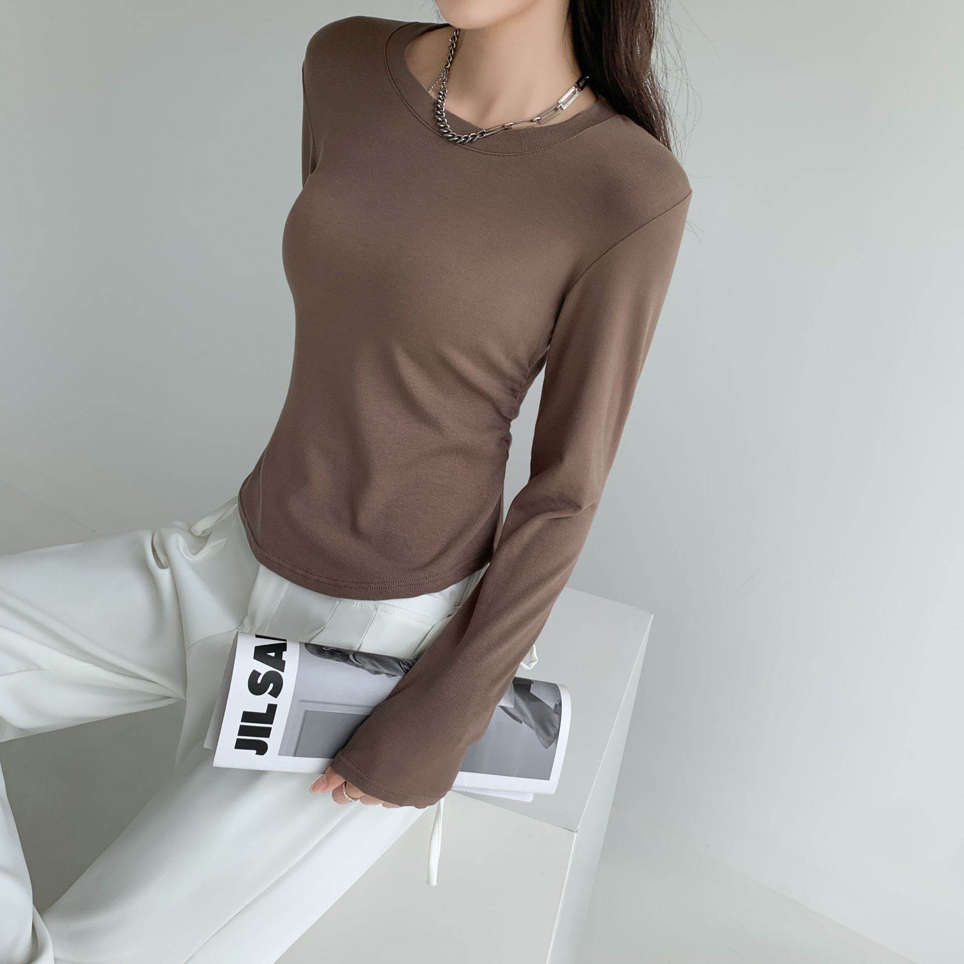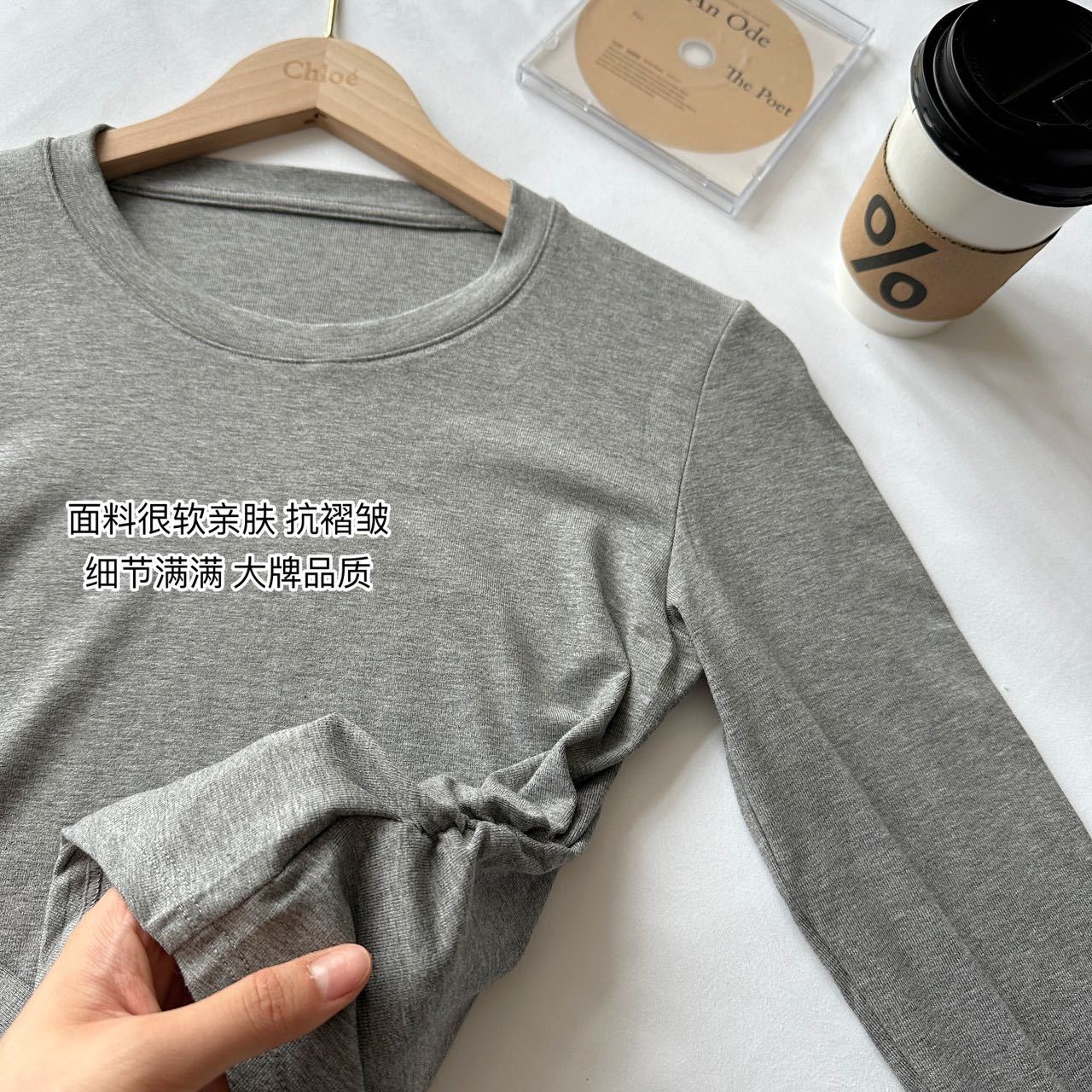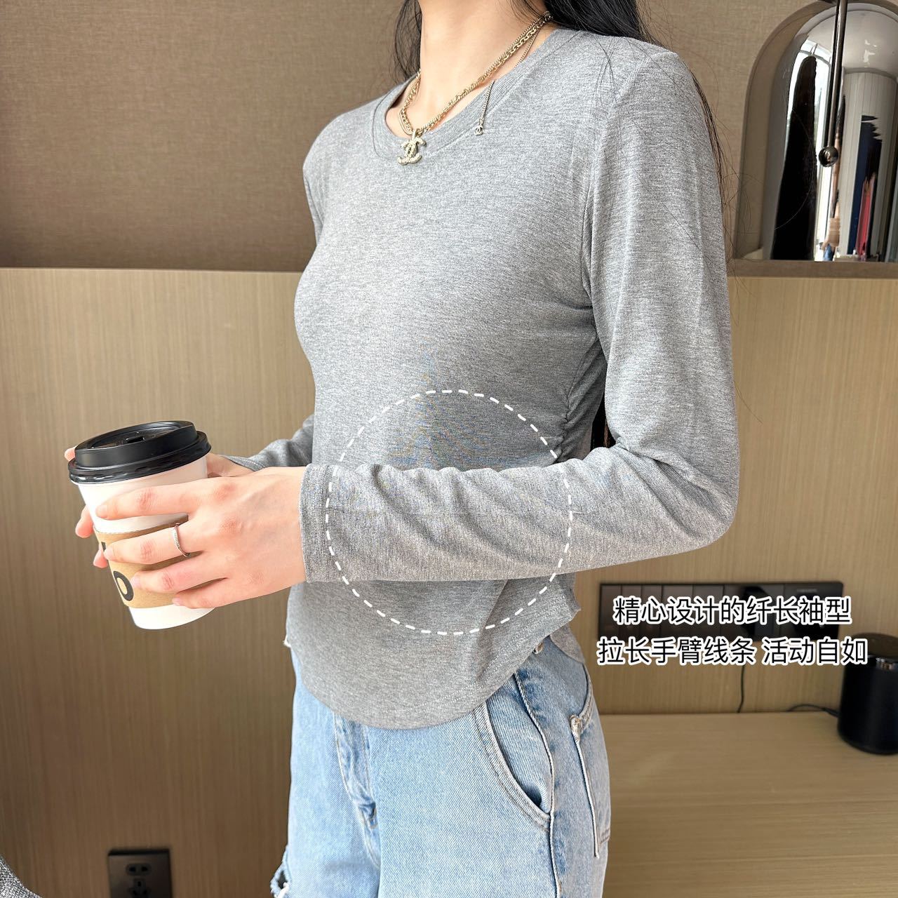圆领纯欲风松紧收腰 纯色正肩T恤女 设计感辣妹t修身小蛮腰上衣打底衫