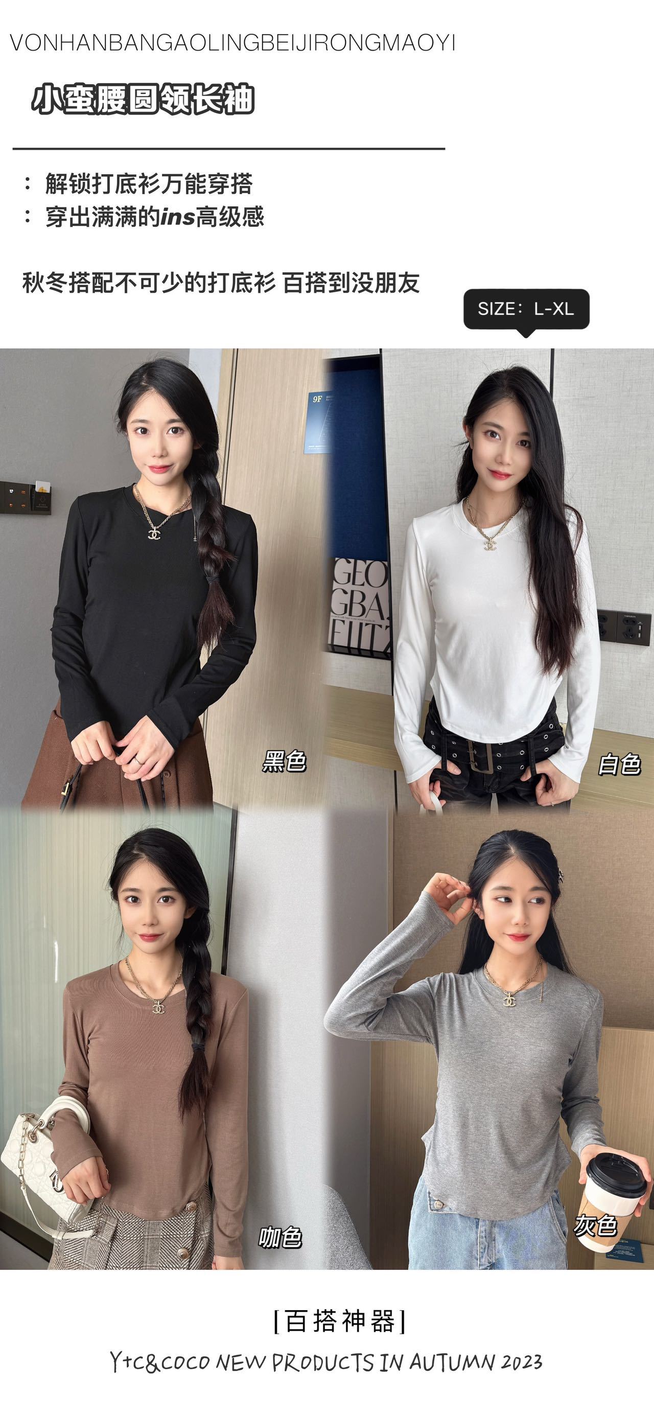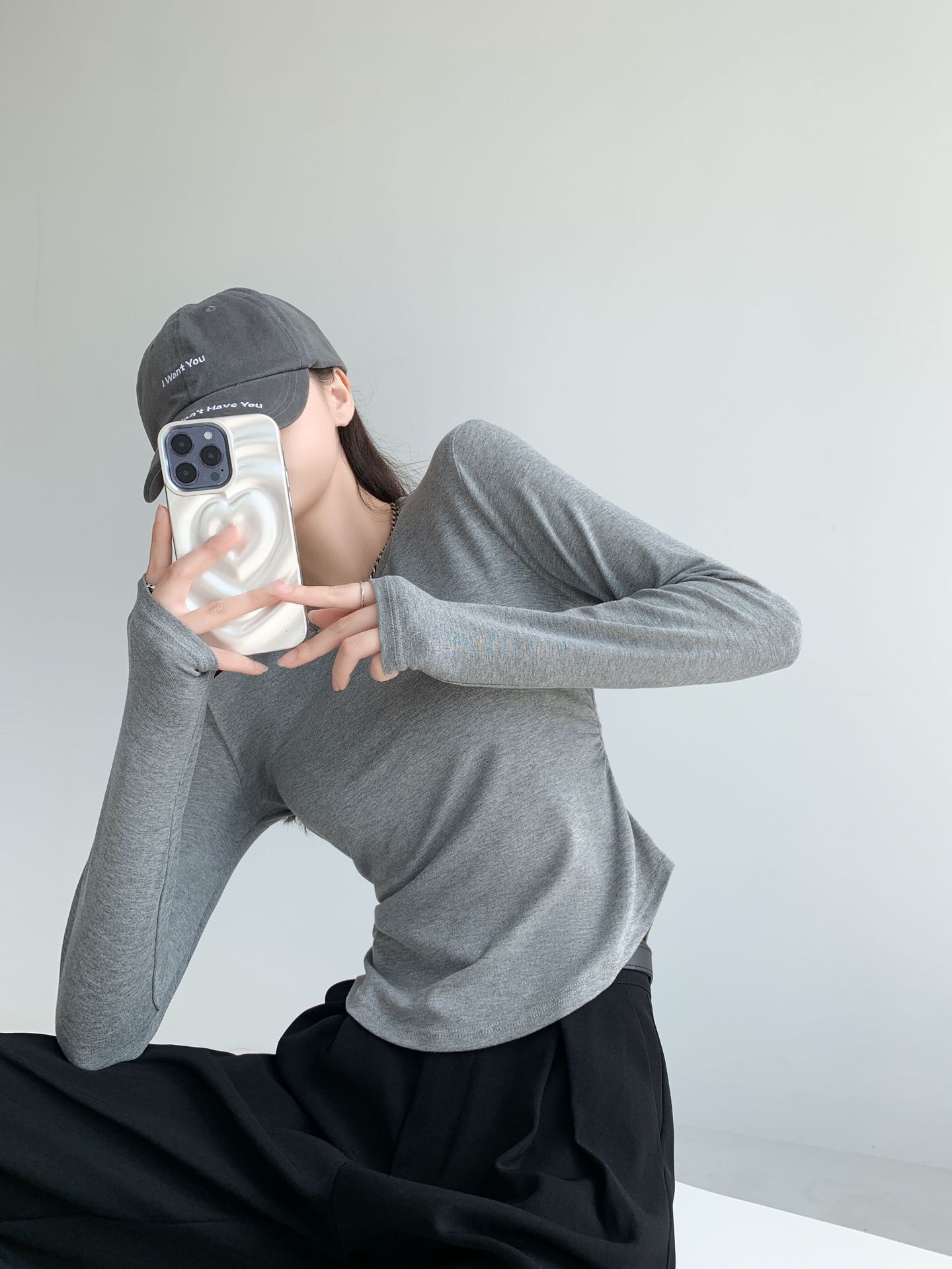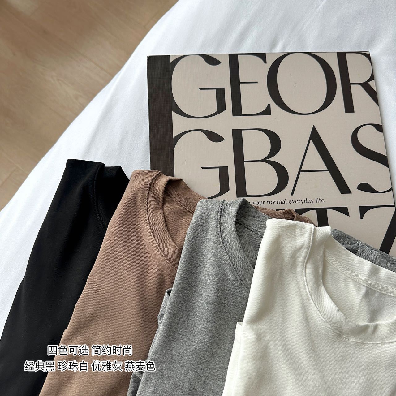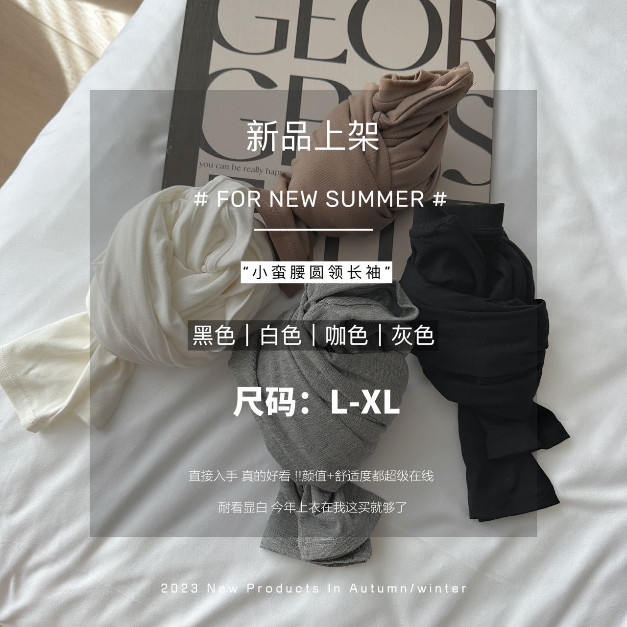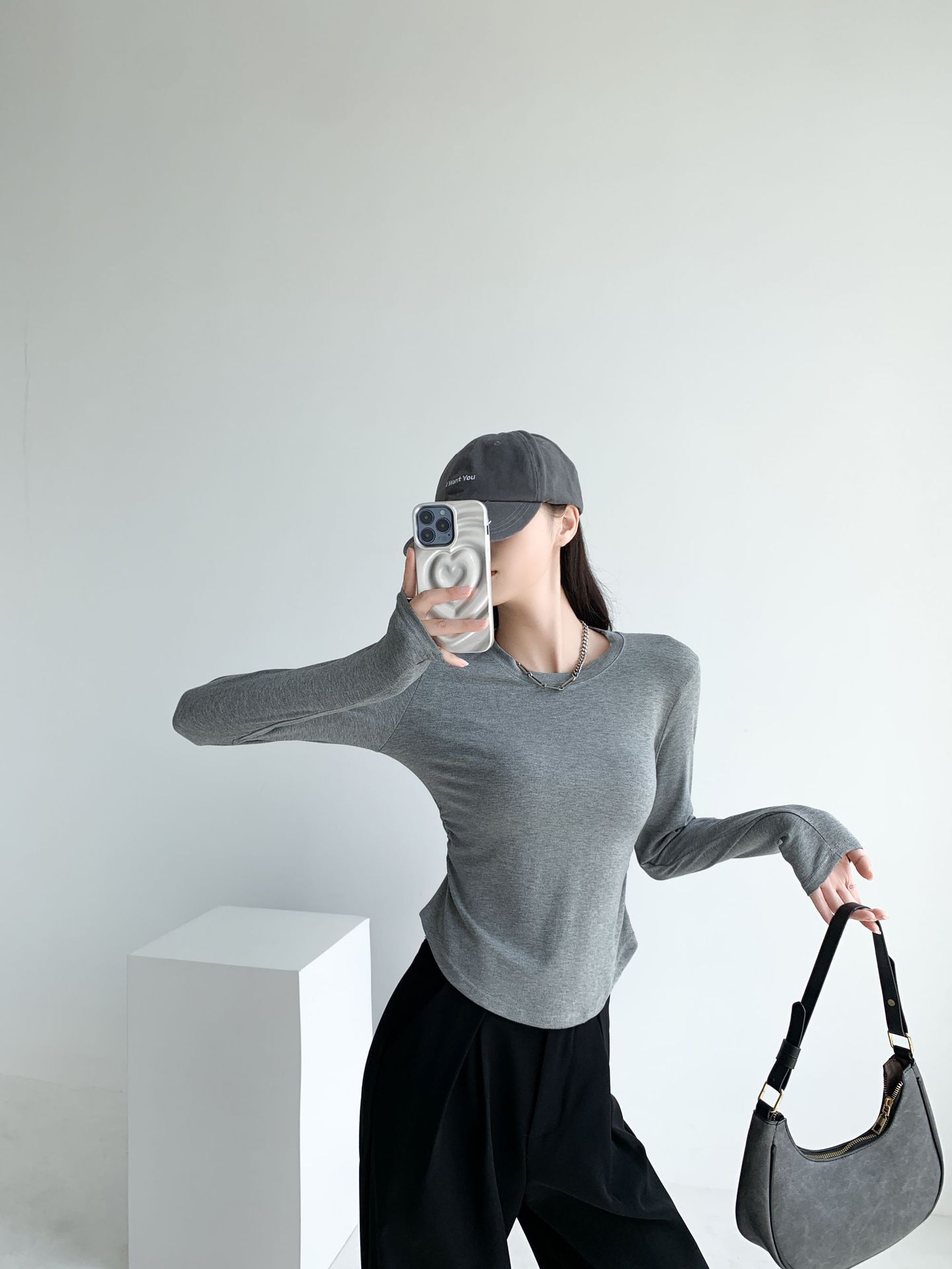 圆领纯欲风松紧收腰 纯色正肩T恤女 设计感辣妹t修身小蛮腰上衣打底衫