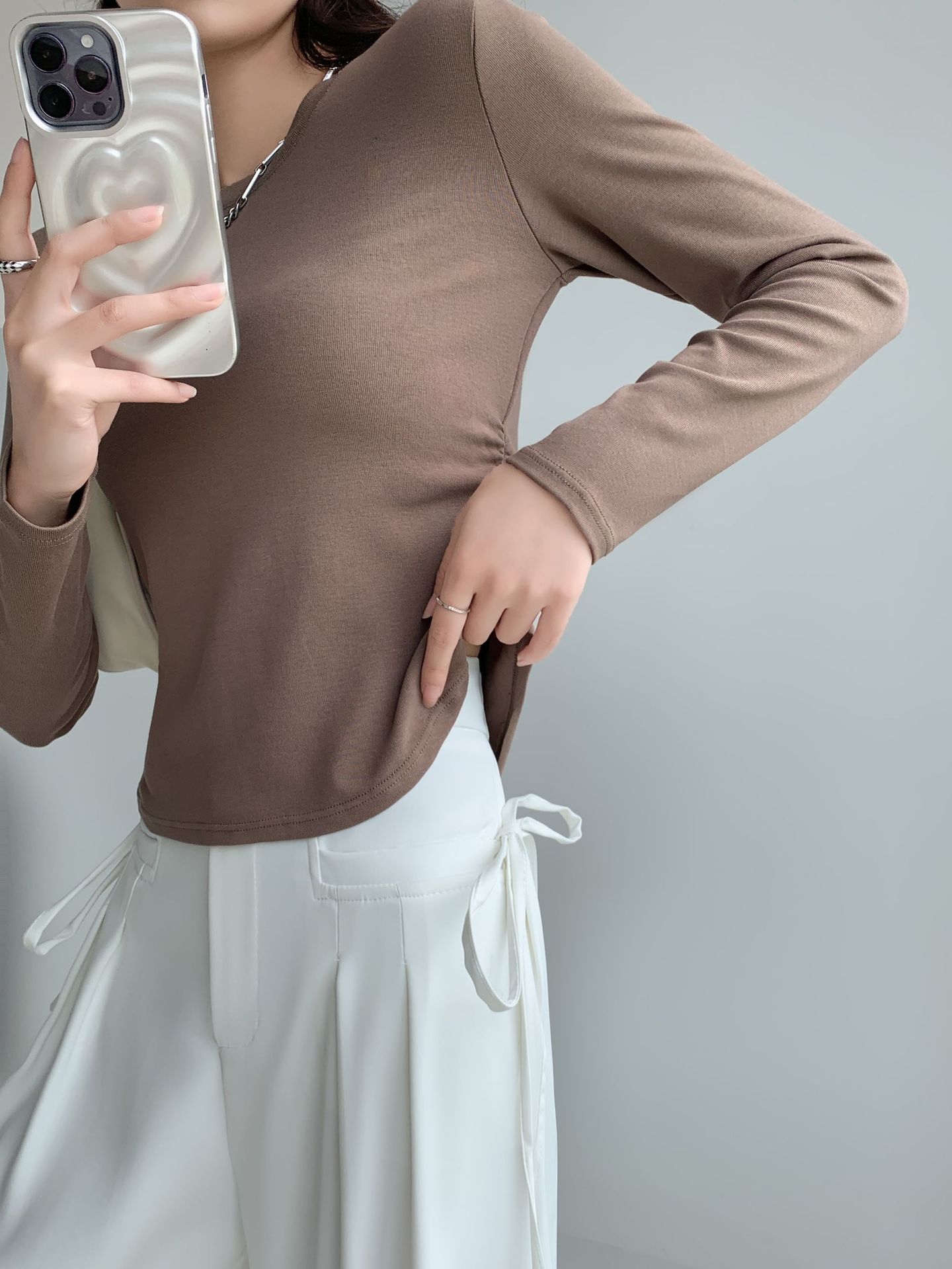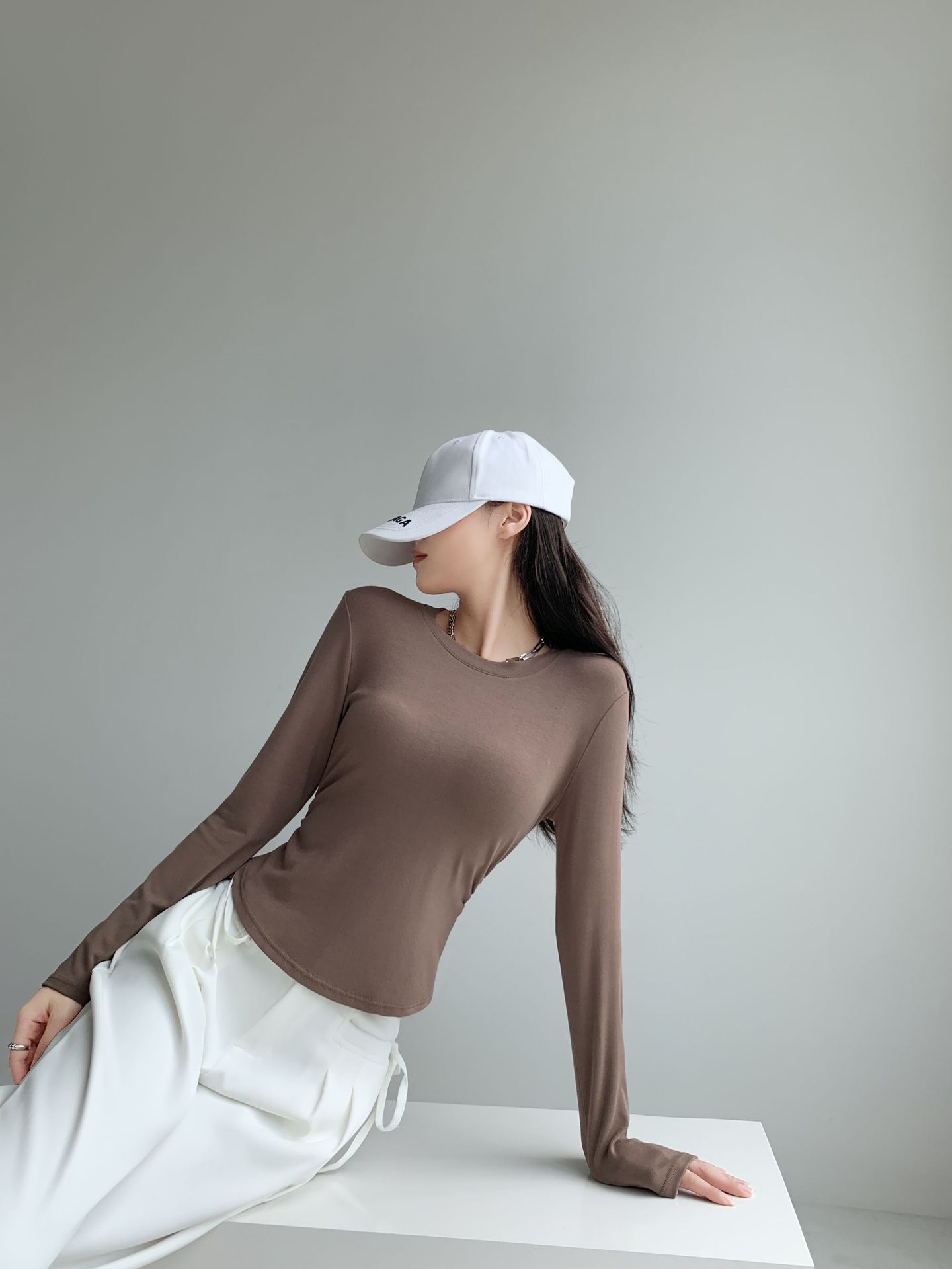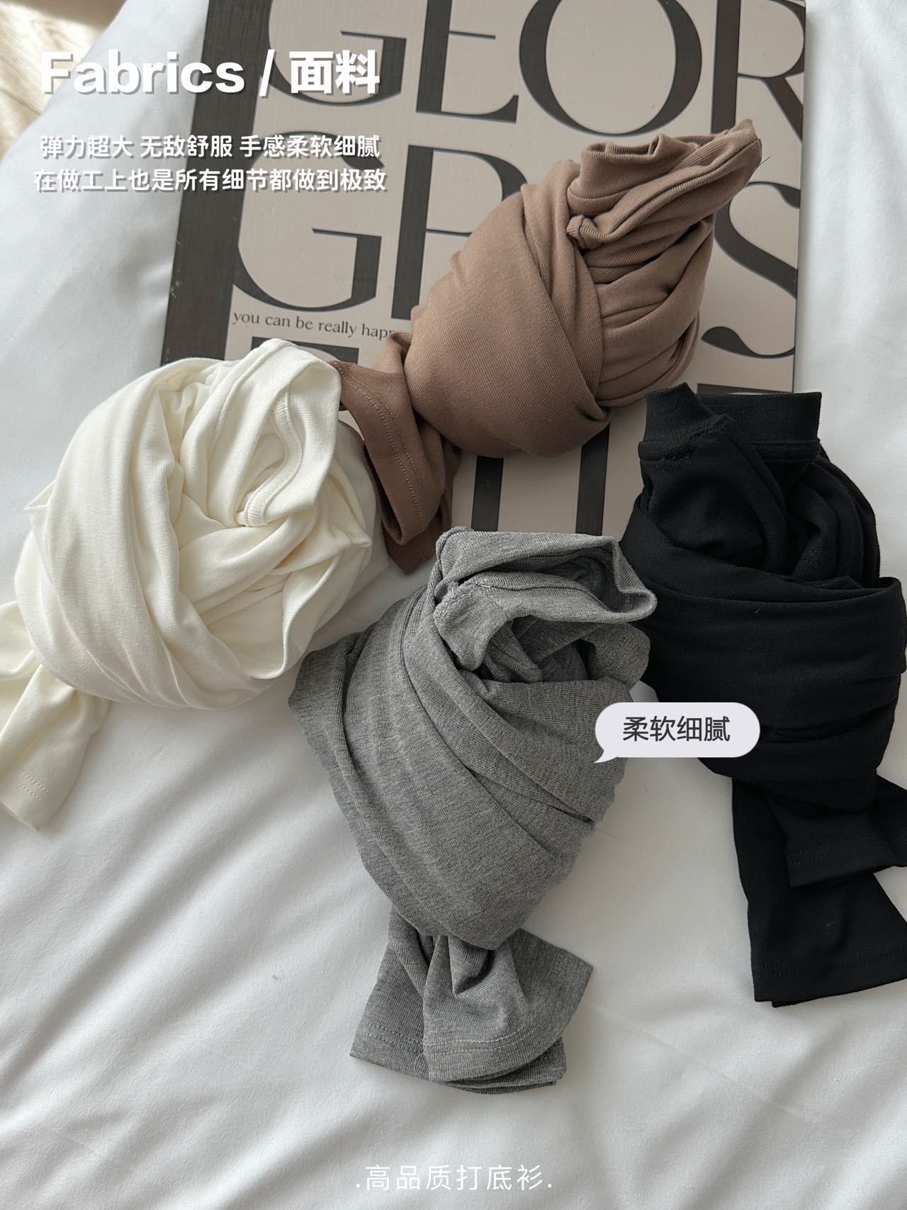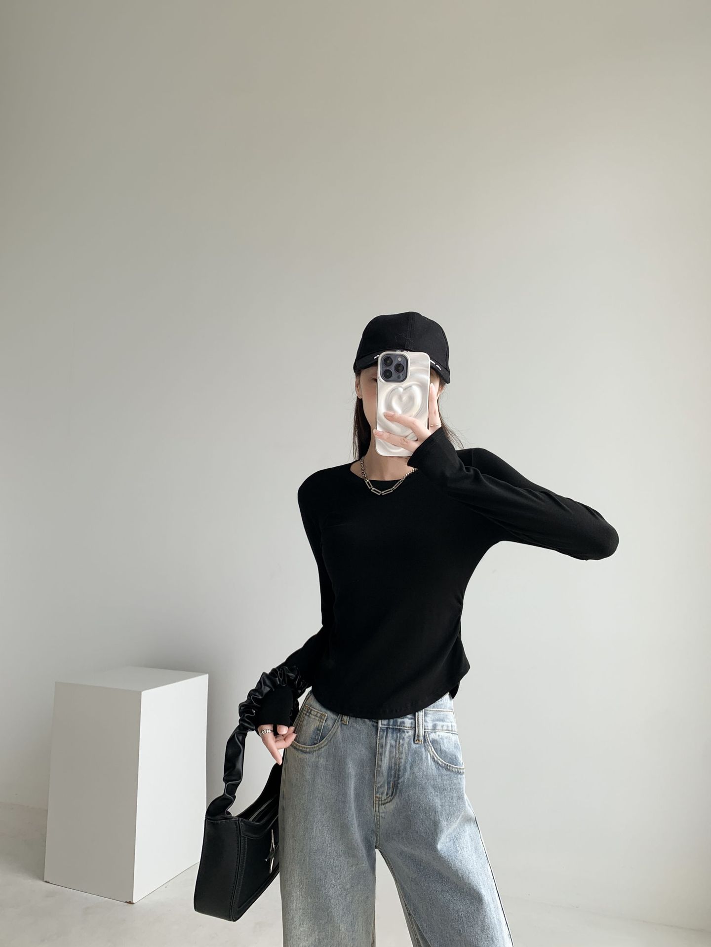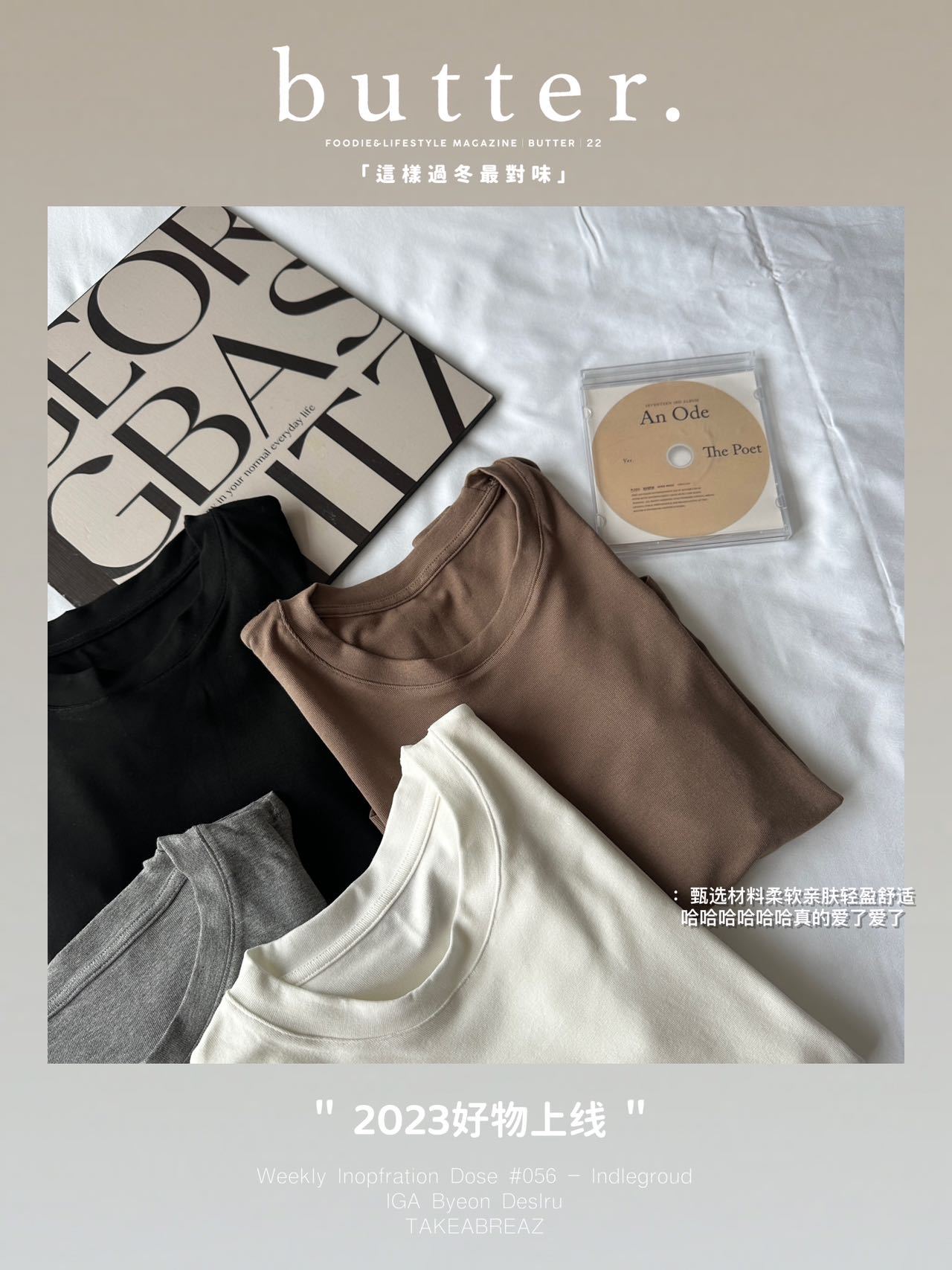 圆领纯欲风松紧收腰 纯色正肩T恤女 设计感辣妹t修身小蛮腰上衣打底衫