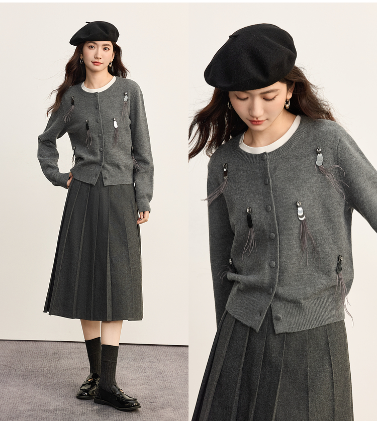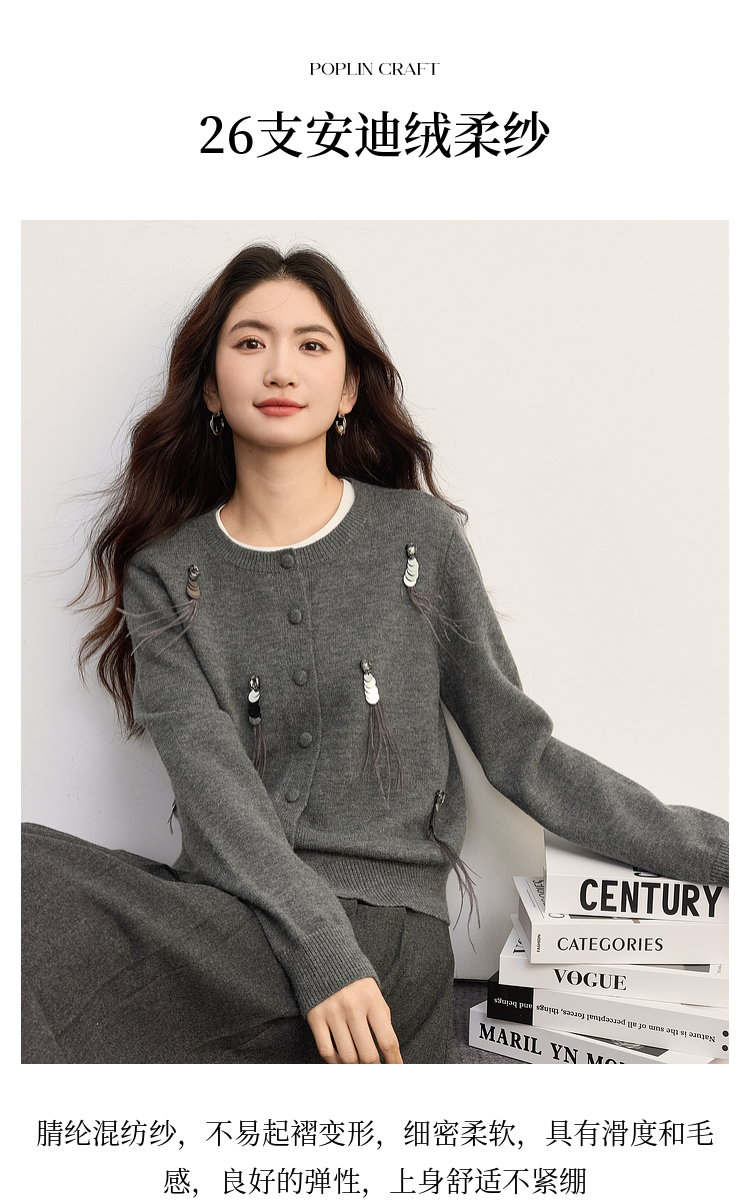 【09/10新品】熙世界亮片羽毛流苏针织衫开衫女设计感秋季安迪绒圆领毛衣短外套