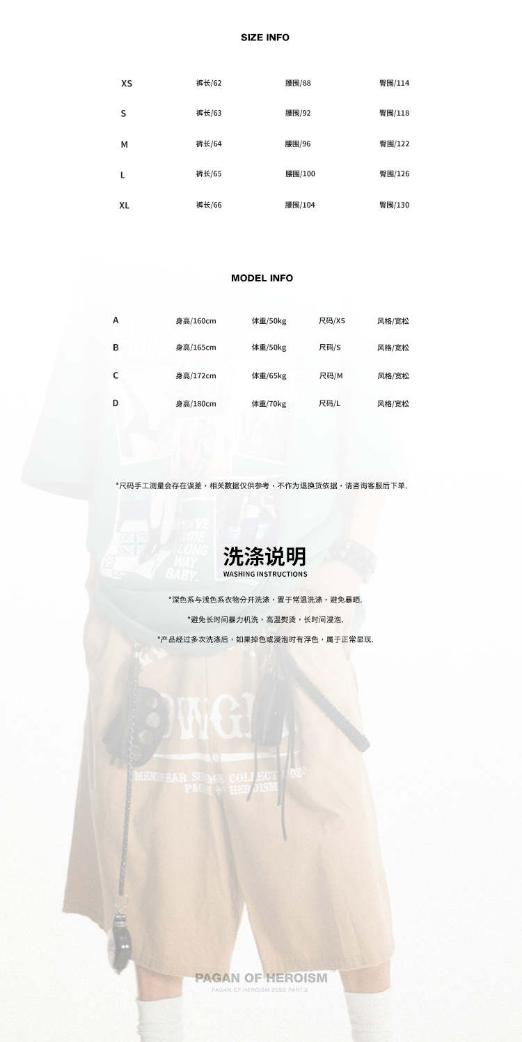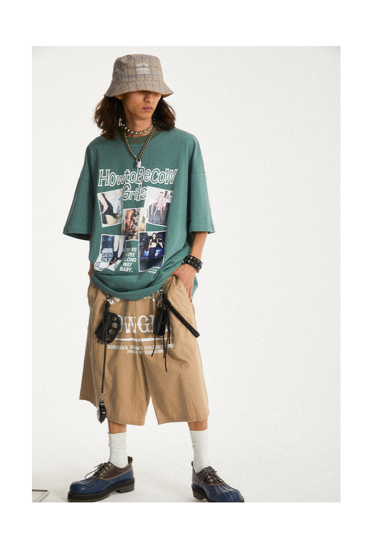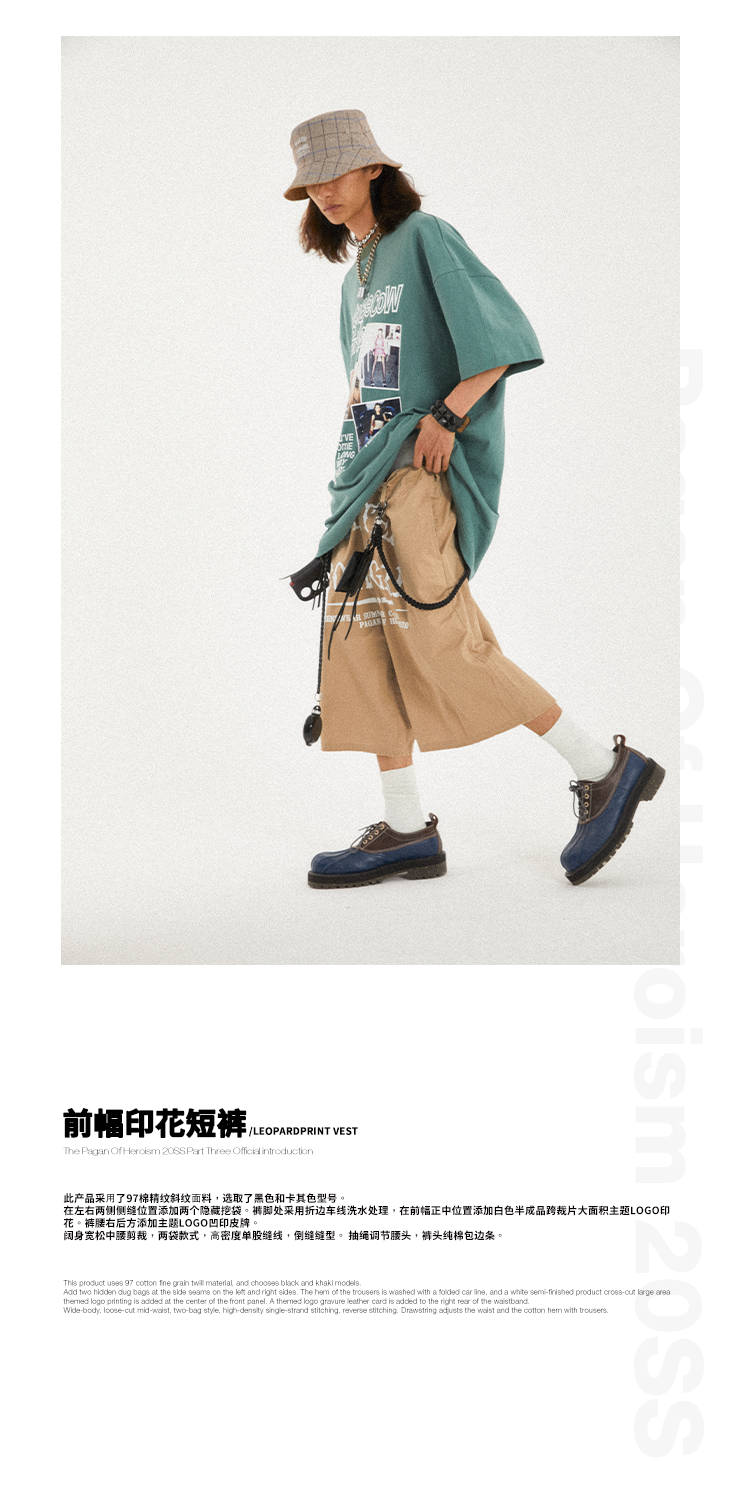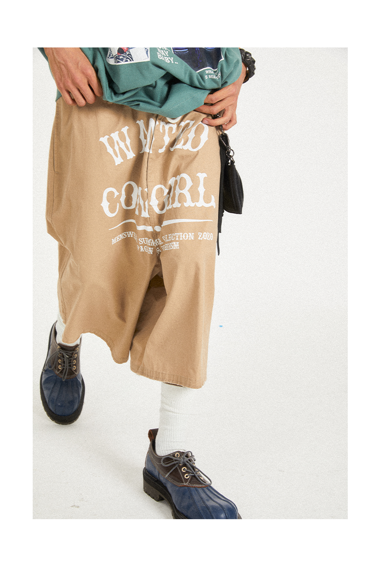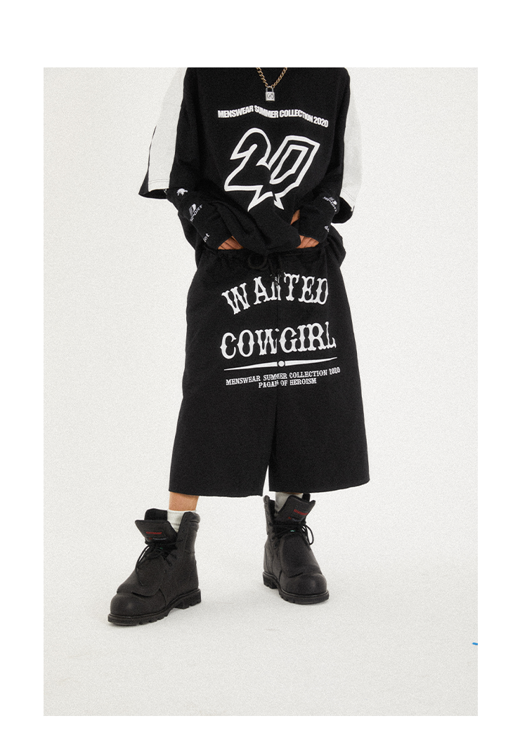 POH Cowgirl主题大印花宽松五分直筒中裤子朋克黑色卡其色短裤男
