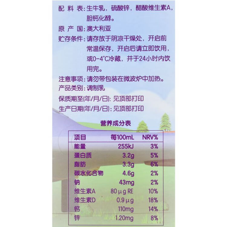 a2儿童全脂牛奶200ml*12/件