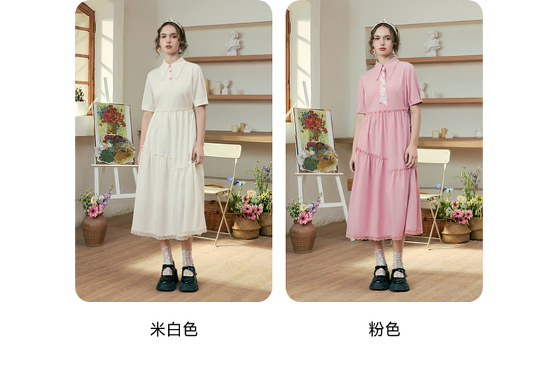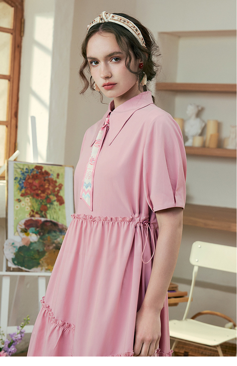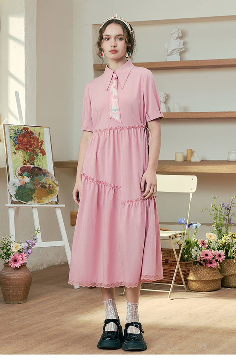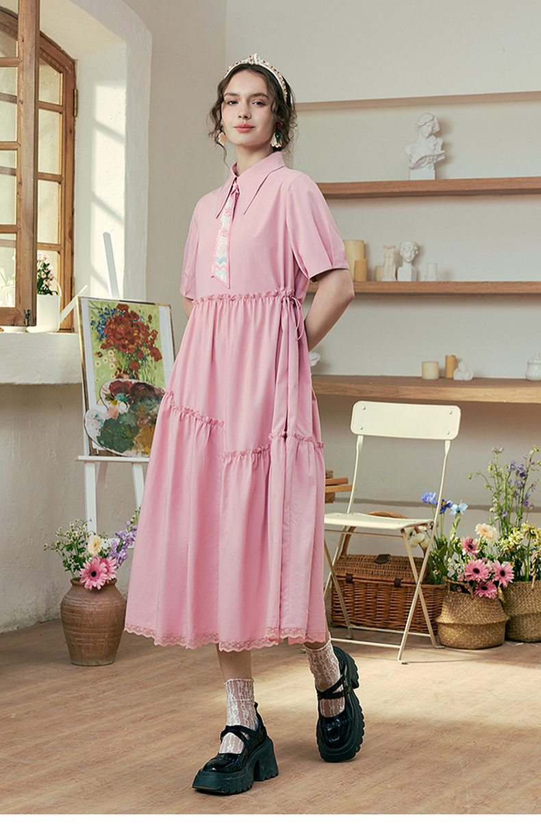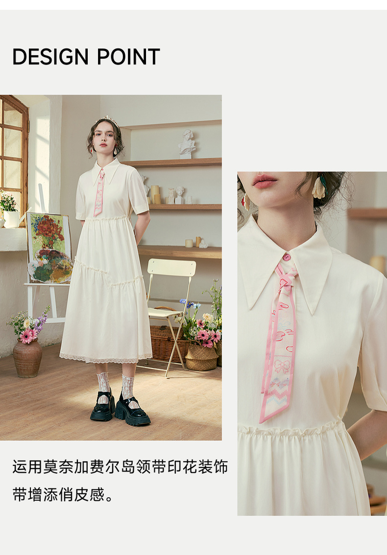 两三事 晨夕牵引 2025春季新款甜美印花领带荷叶边拼接连衣裙