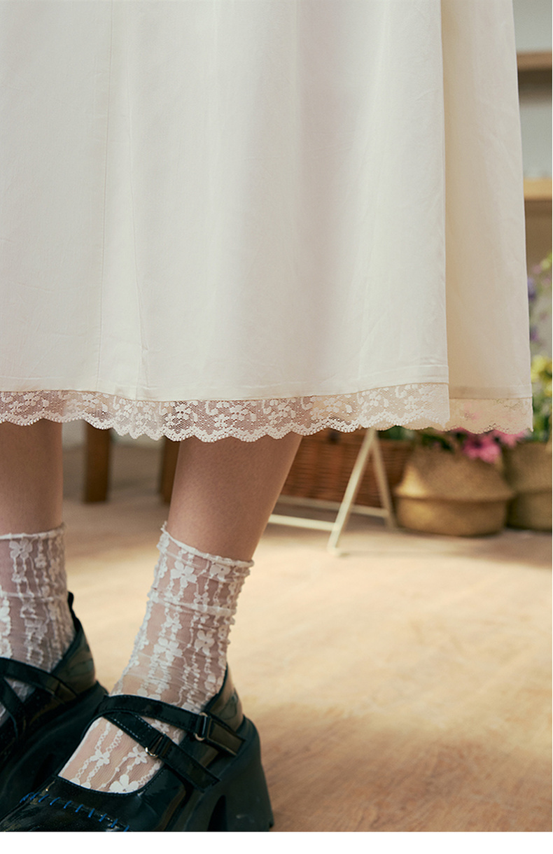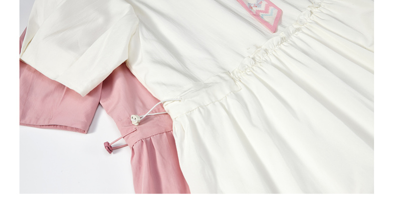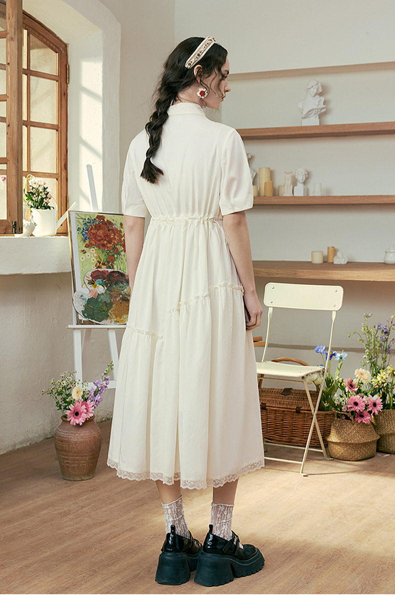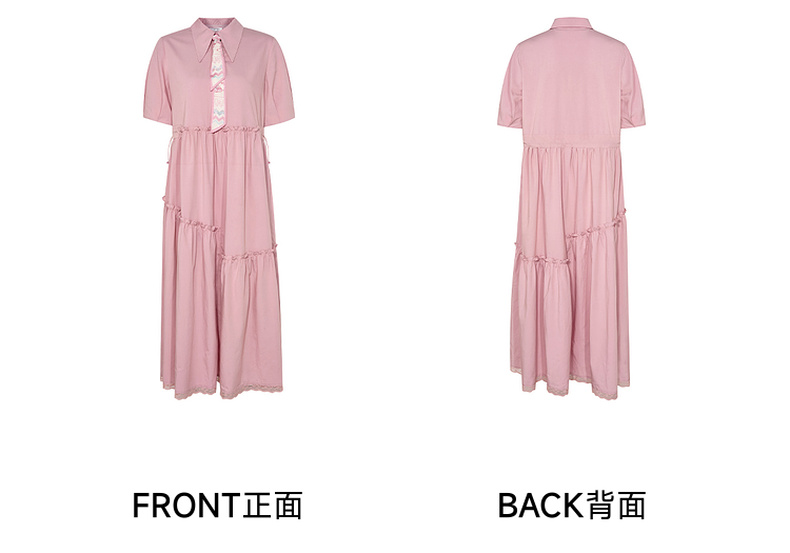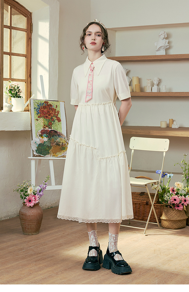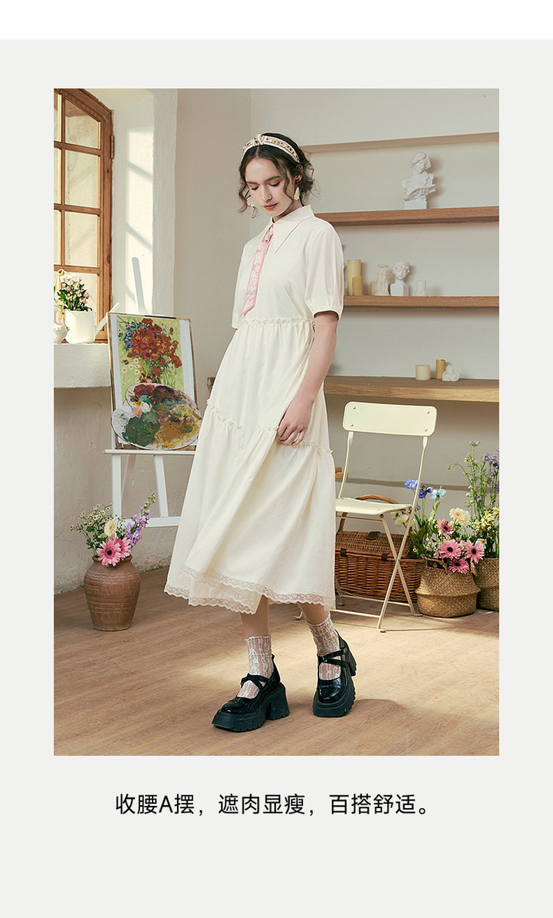 两三事 晨夕牵引 2025春季新款甜美印花领带荷叶边拼接连衣裙