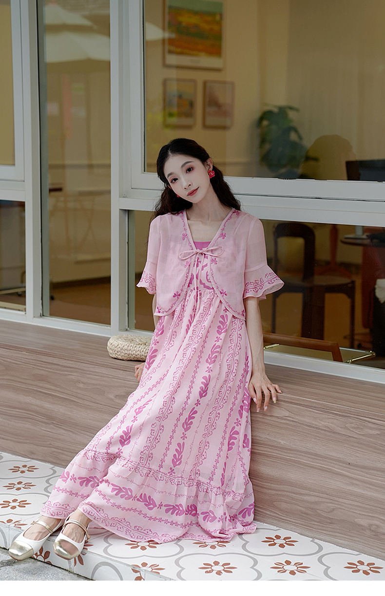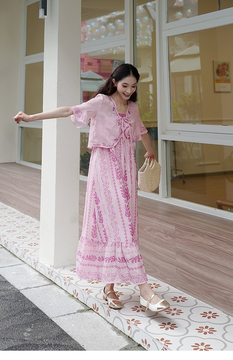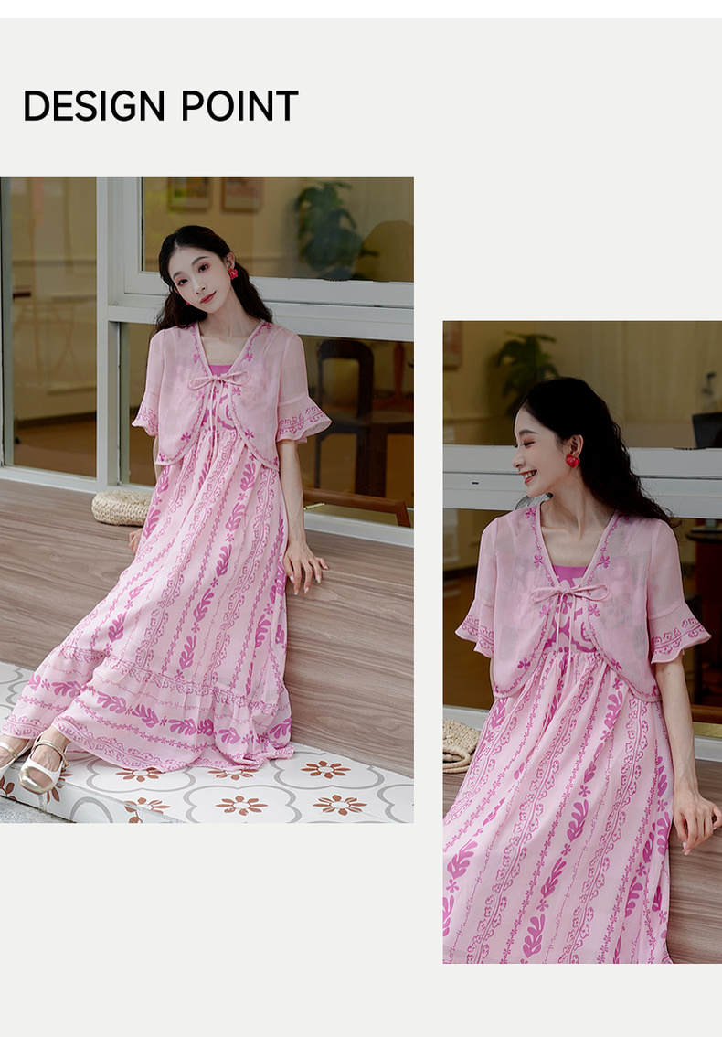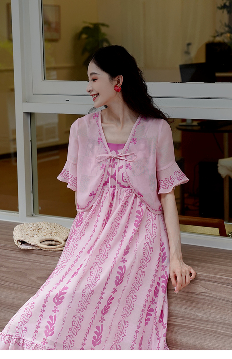 两三事粉色海滩2024夏季新款印花刺绣开衫吊带裙两件套女时尚套装