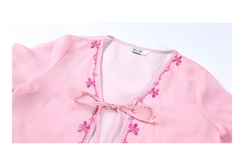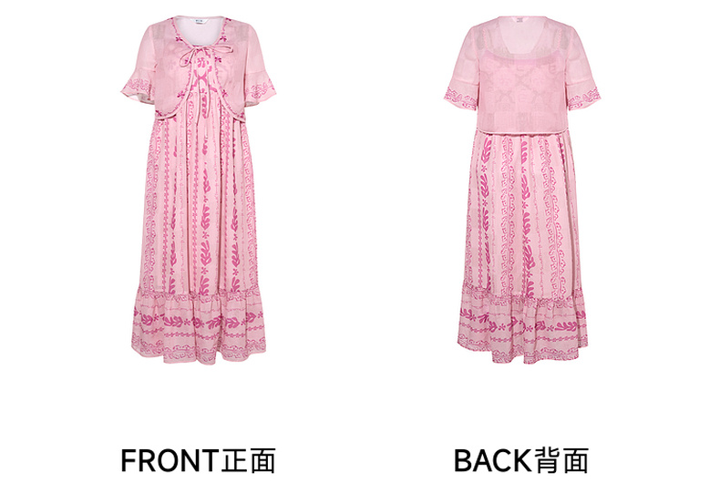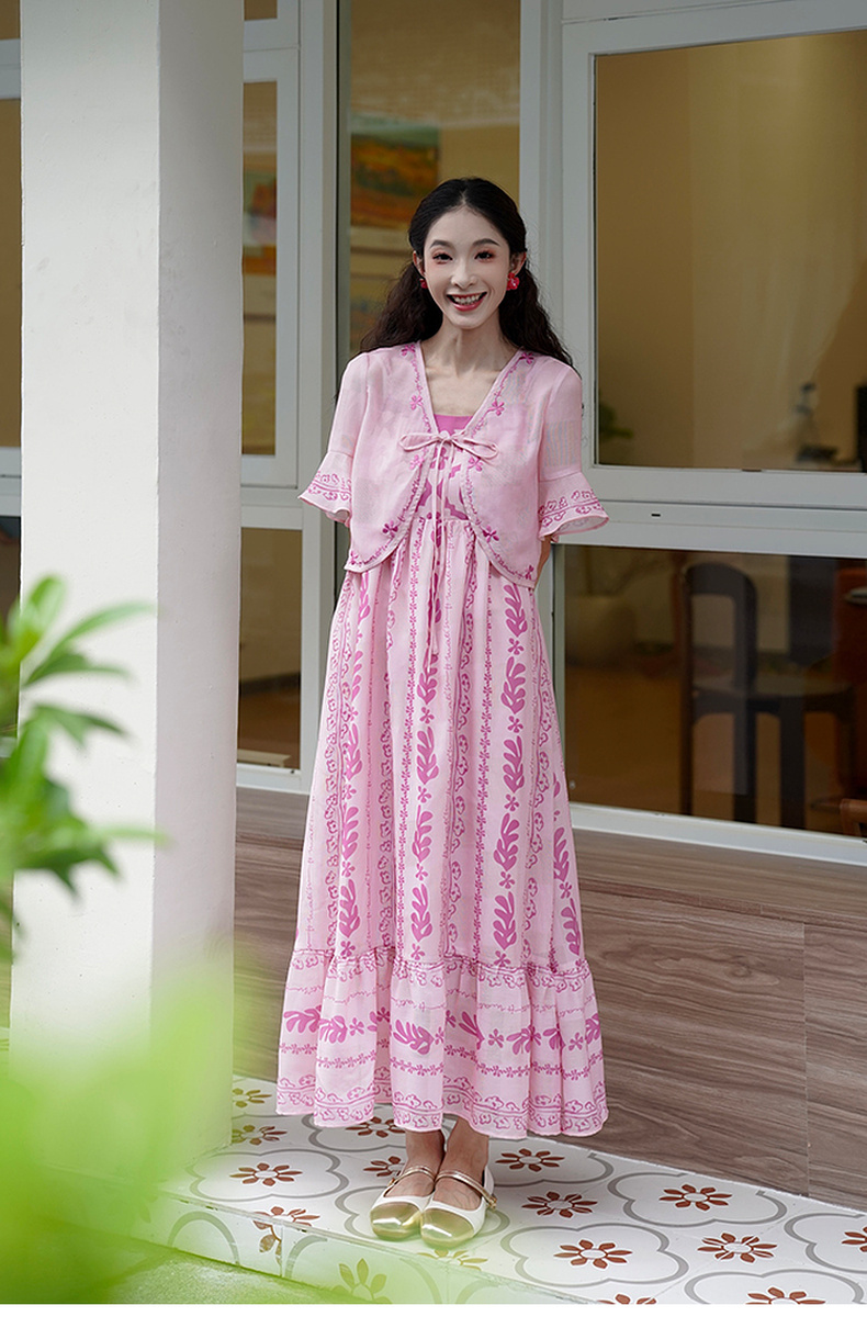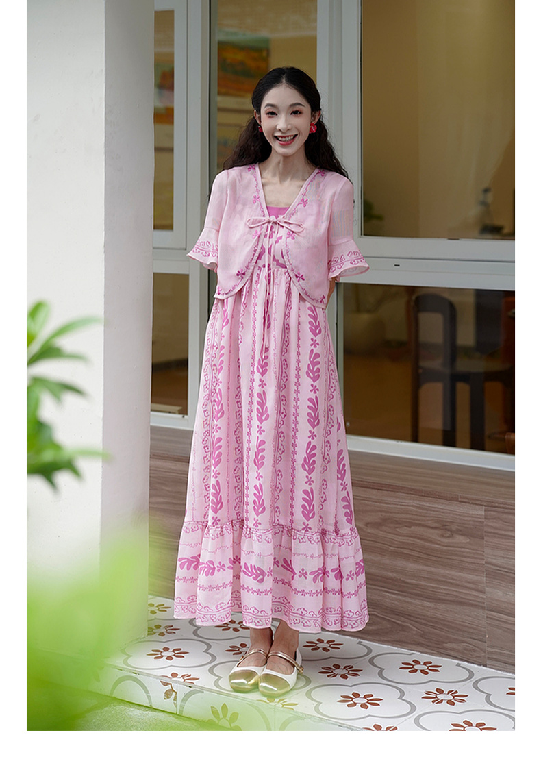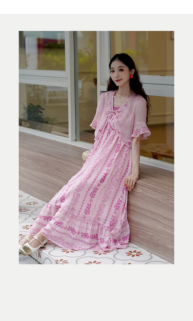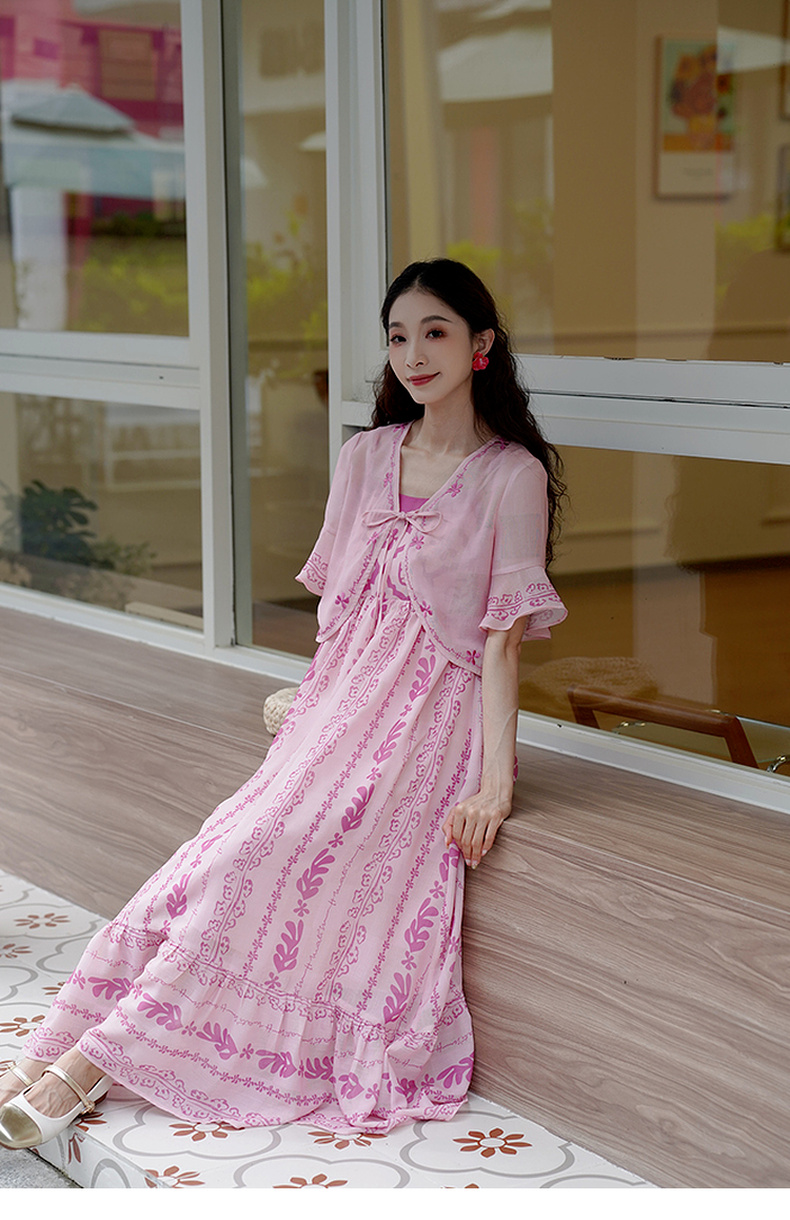 两三事粉色海滩2024夏季新款印花刺绣开衫吊带裙两件套女时尚套装