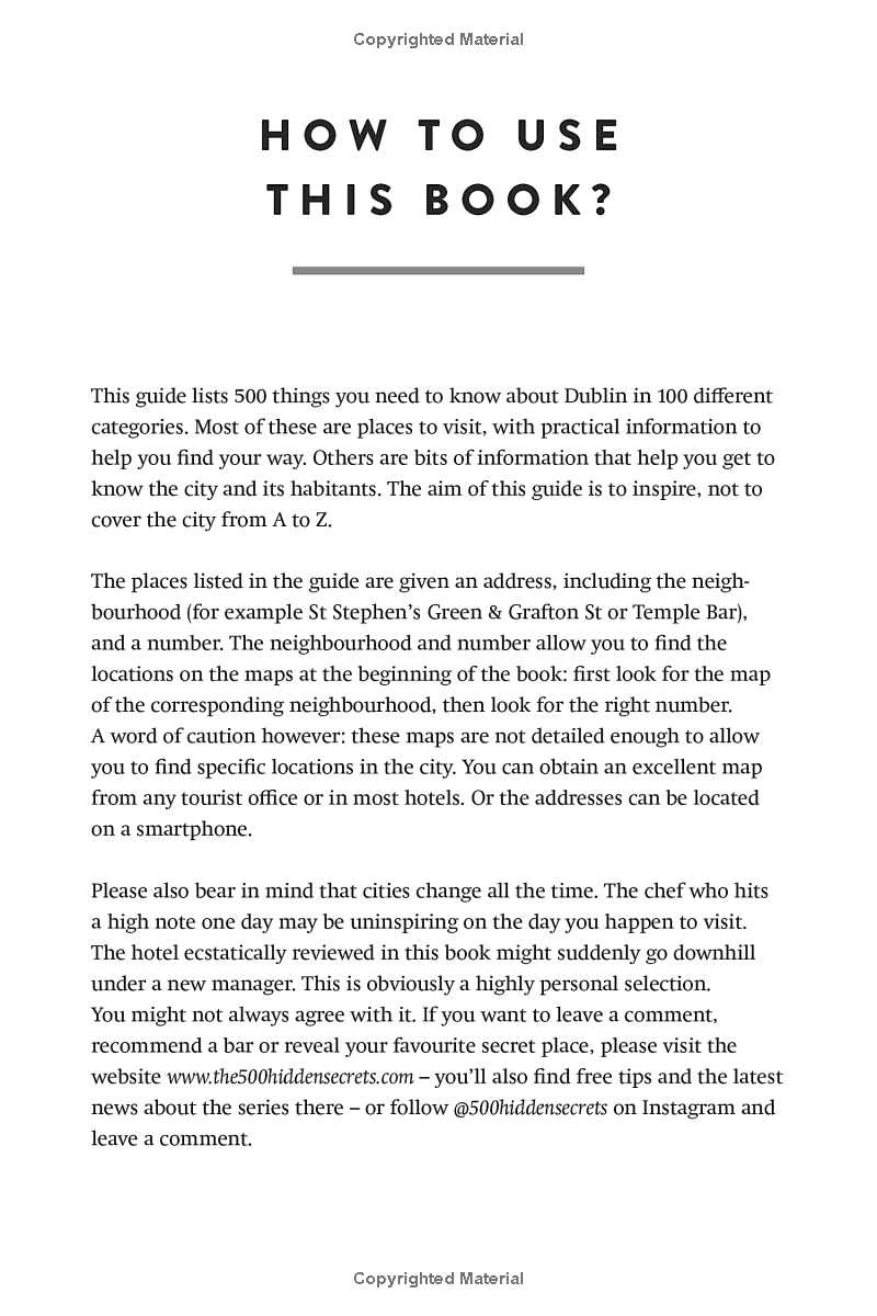 What are the 5 most stunning restaurants? Where can you discover the 5 most secret streets? Which are the 5 best bars for a local beer? The 500 Hidden Secrets of Dublin reveals these good-to-know addresses and many more."