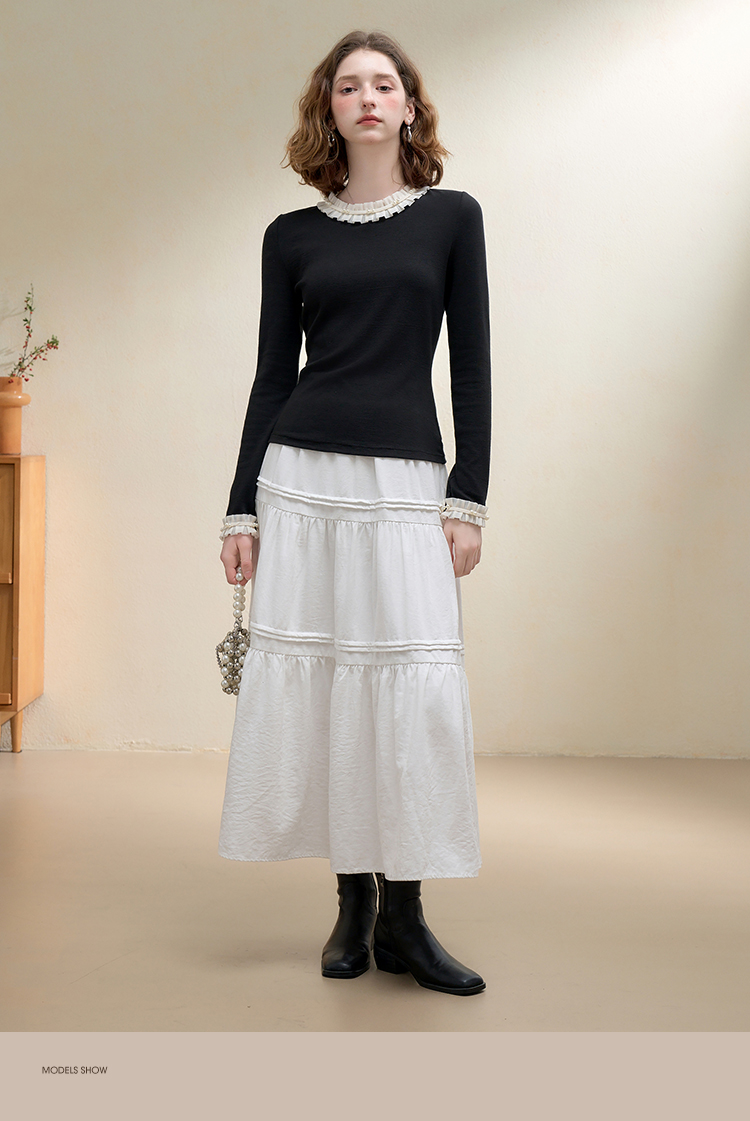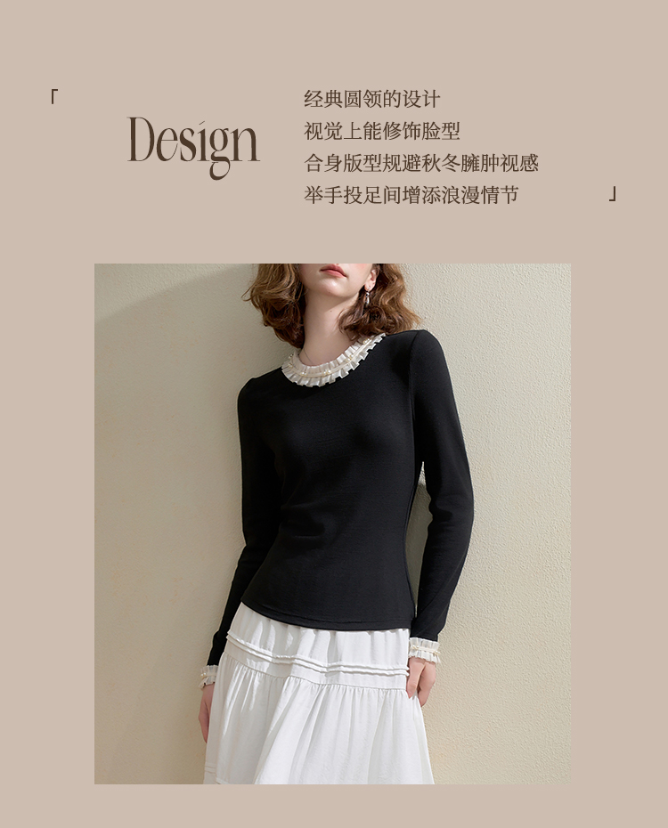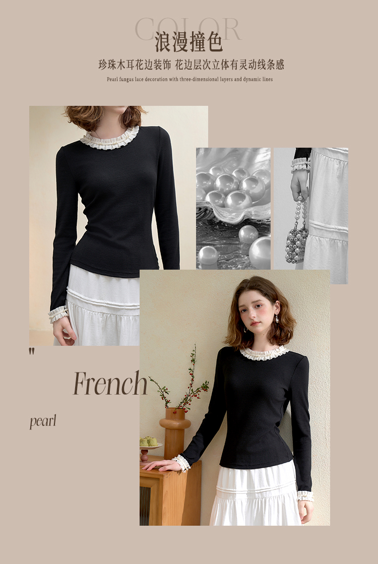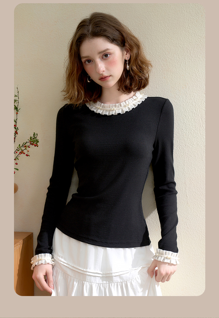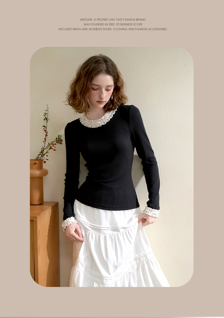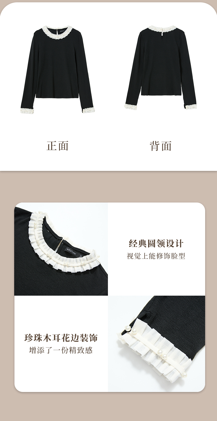 西遇珍珠点缀花边针织衫T恤女秋季修身显瘦内搭长袖打底衫V3151290