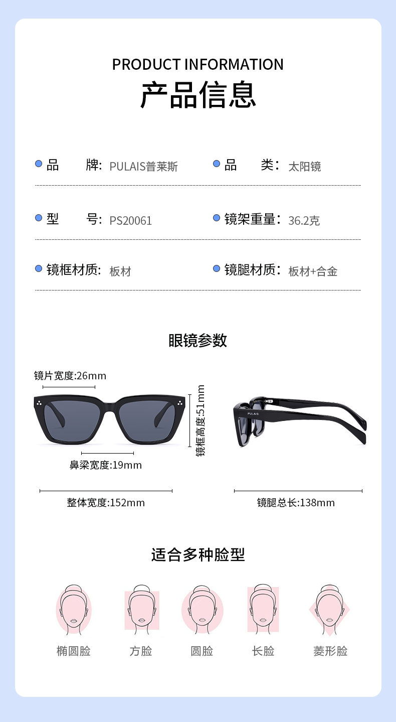 普莱斯板材太阳镜PS20061 多边形全框 板材+合金 男女同款 五色可选