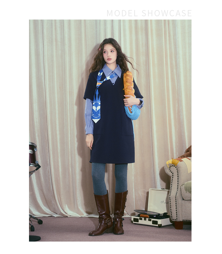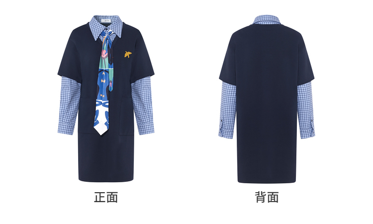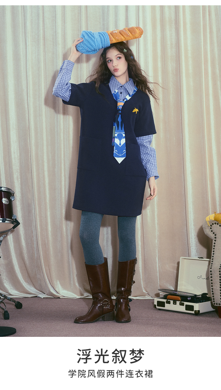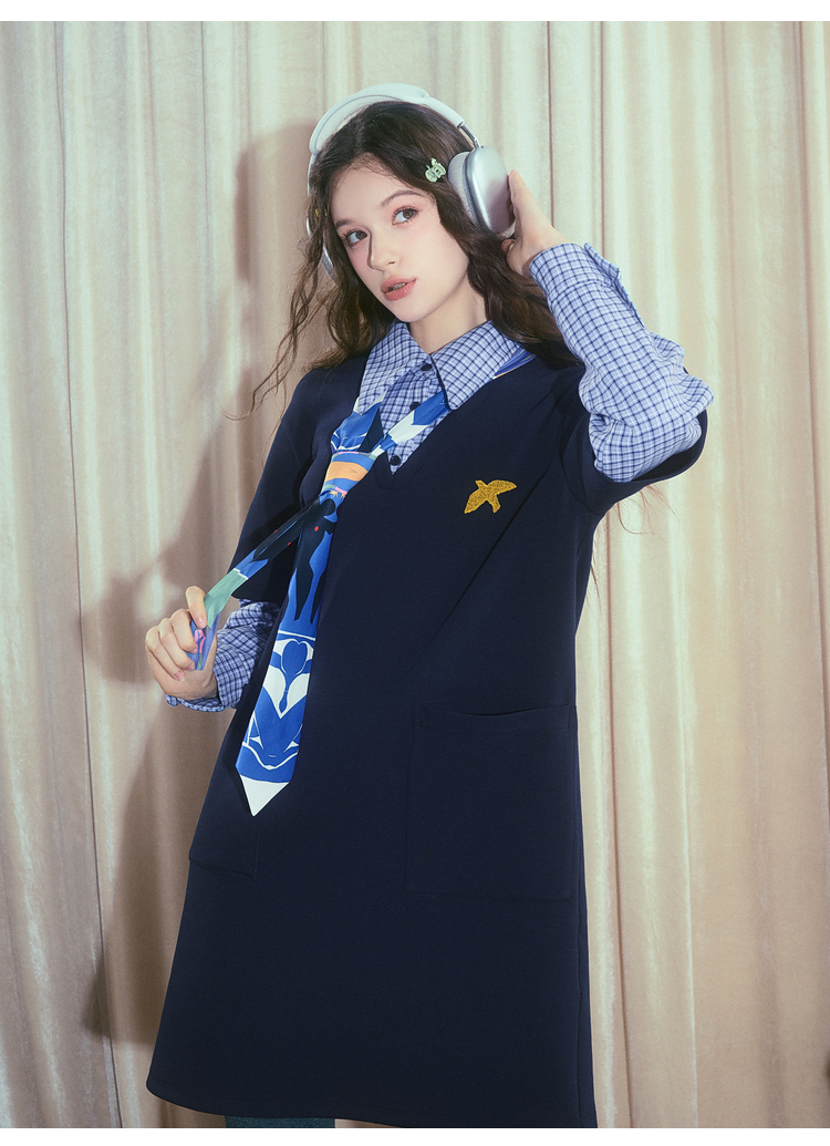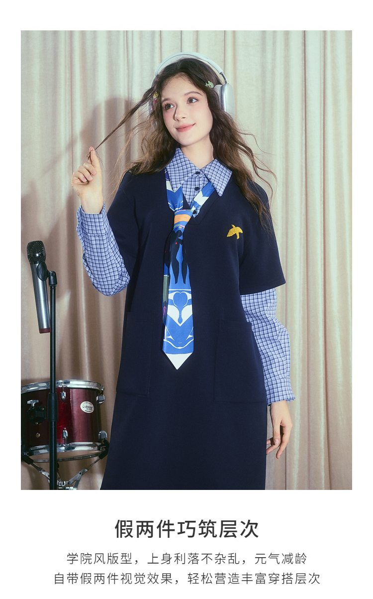 两三事浮光叙梦2025冬季新款印花领带毛巾绣格子拼接假两件连衣裙
