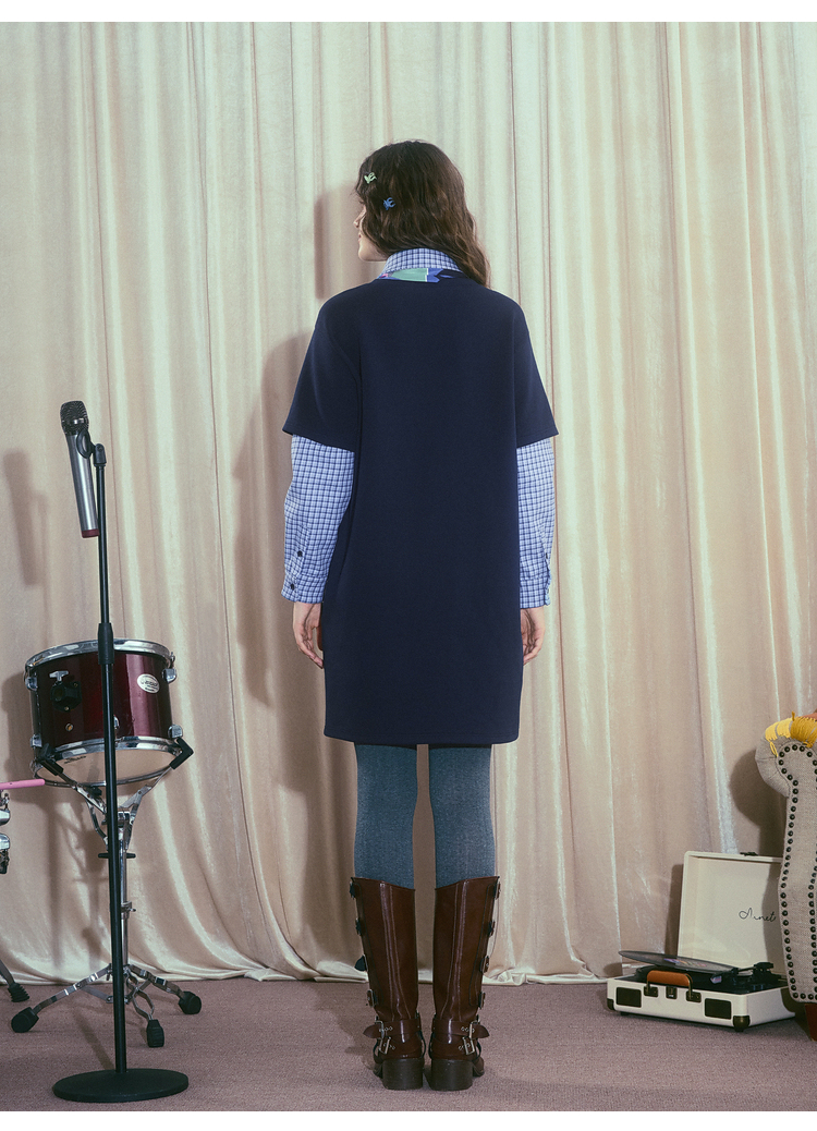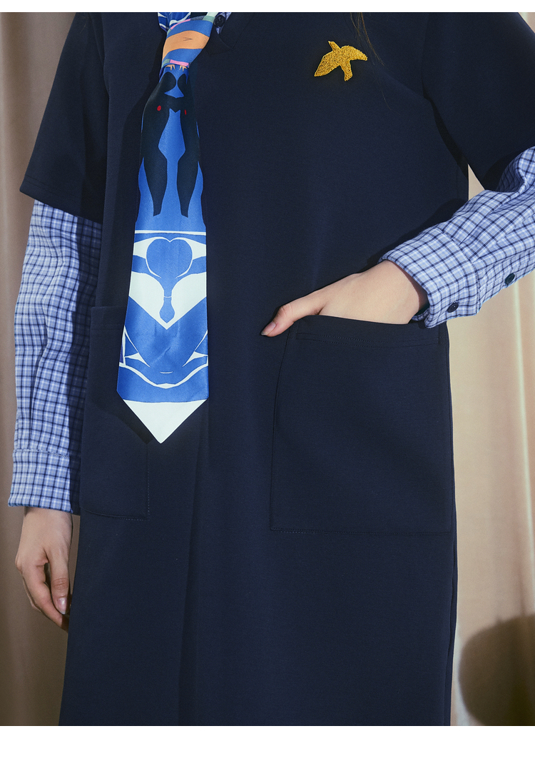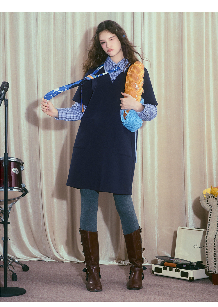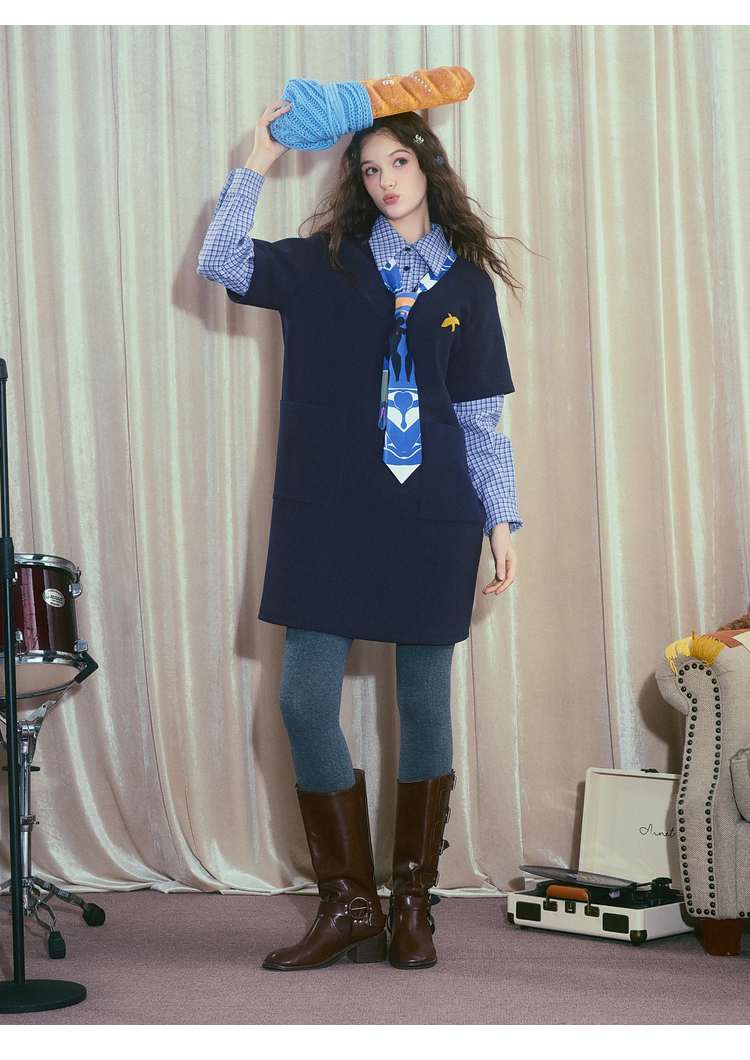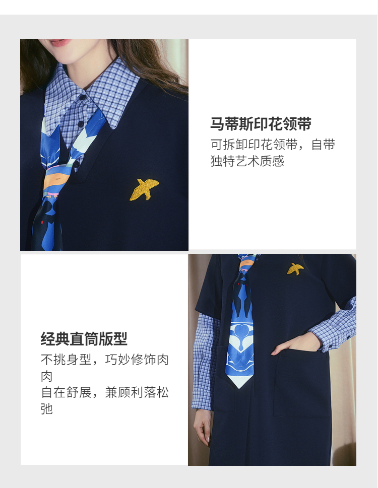 两三事浮光叙梦2025冬季新款印花领带毛巾绣格子拼接假两件连衣裙