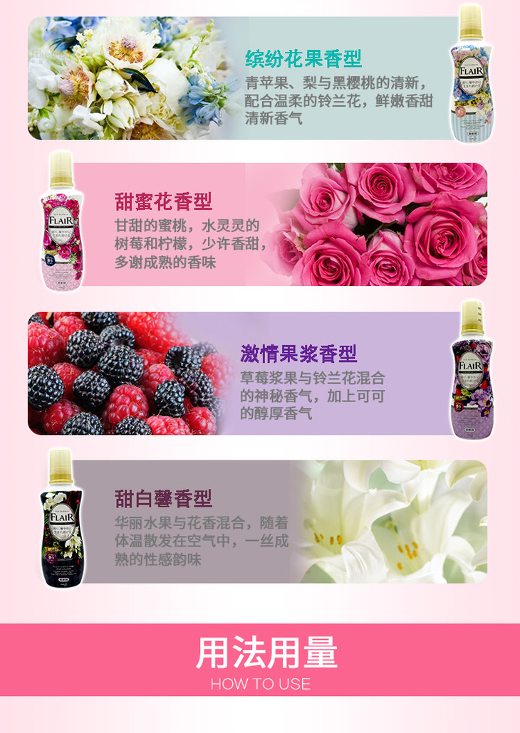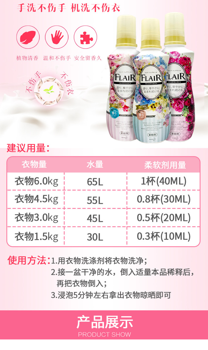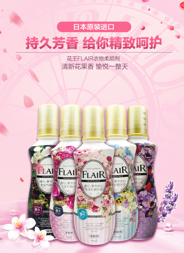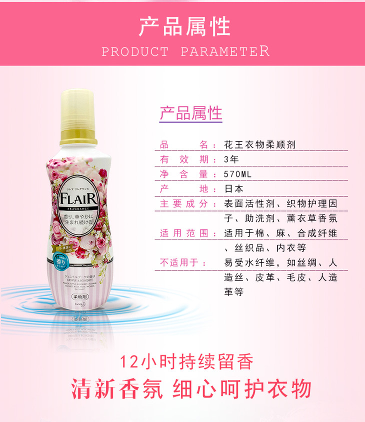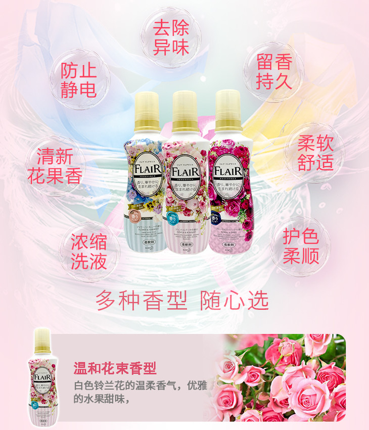 日本进口 花王flair柔顺剂衣物蓬松抗菌除臭除皱防静电柔软剂 百花香味 540ML(377777)