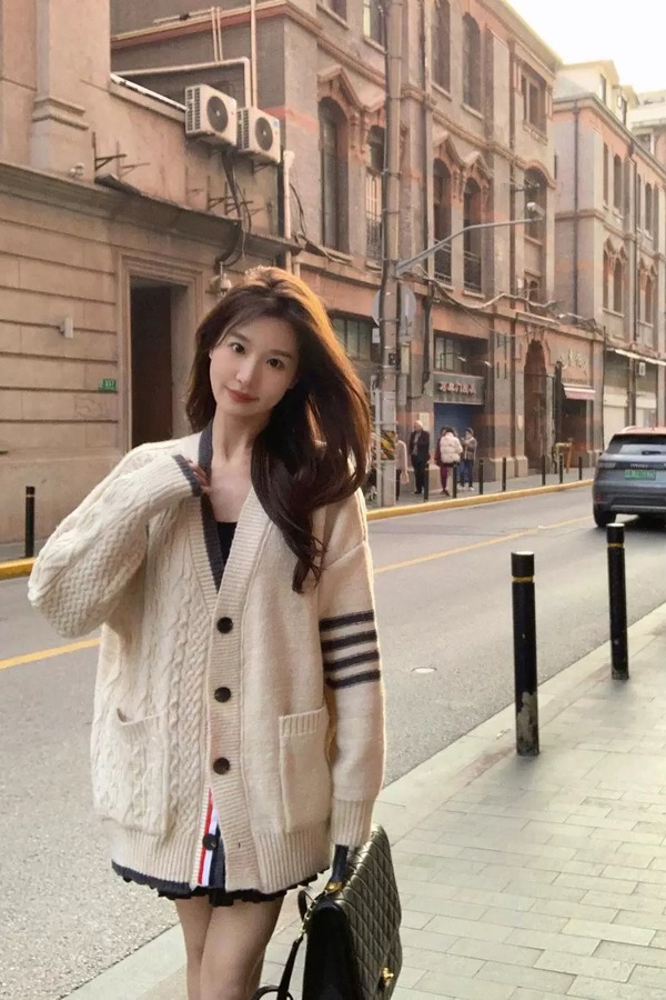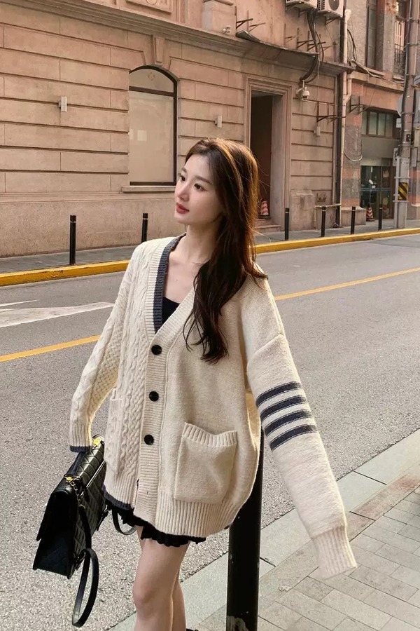 Kai & Kiera 减龄学院风撞色慵懒宽松针织开衫外套 21436
