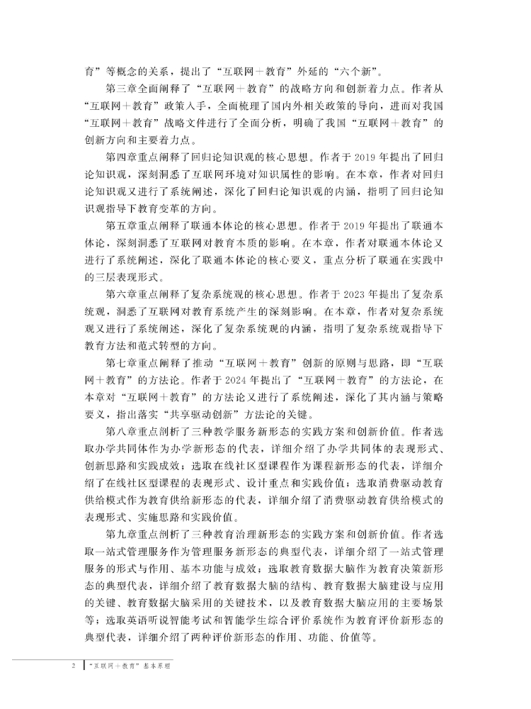 本书立足教育数字化转型大背景,面向教育高质量发展新要求,结合“互联网+教育”实践中的困惑和问题,从政策视角诠释“互联网+教育”战略的要义,从教育学视角阐释“互联网+教育”内涵与外延,从实践视角剖析“互联网+教育”典型创新案例,从研究视角介绍 “互联网+教育”的理论创新,系统阐释了互联网推动教育变革原理。本书主要内容包括:(1)互联网的本质特征与颠覆性作用、 (2)“互联网+教育”内涵与外延、(3)“互联网+教育”战略导向、(4)网络学习空间、(5)线上线下融合教与学、(6)在线学习新本质与新规律、(7)教育供给侧改革、(8)数字化治理体系、(9)“互联网+教育”的保障体系、(10)“互联网+教育”的哲学基础。