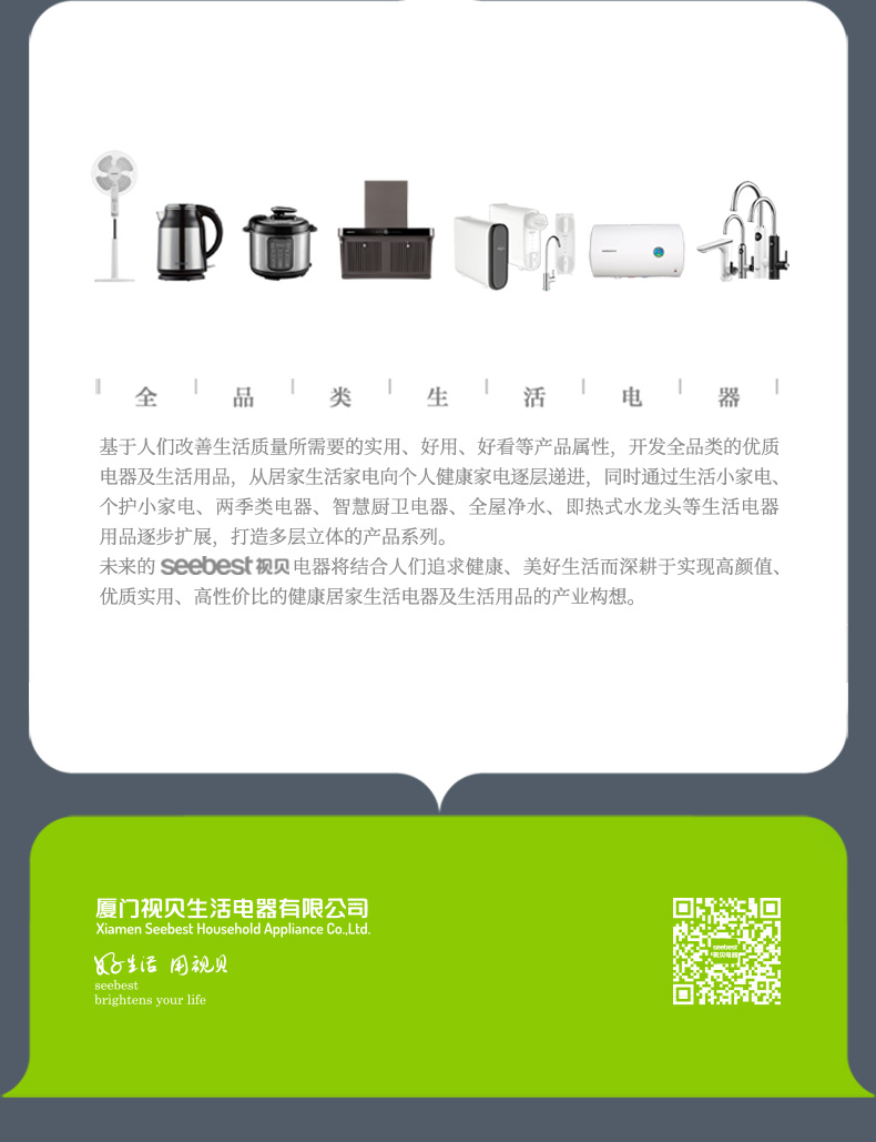 厦门视贝科技有限公司是集产品自主设计,研发,生产,销售于一体的高科技企业。拥有80000平方米的制造厂房,核心员工2000多人。产品线涵盖照明、电工,卫浴,线路,集成风暖等领域。