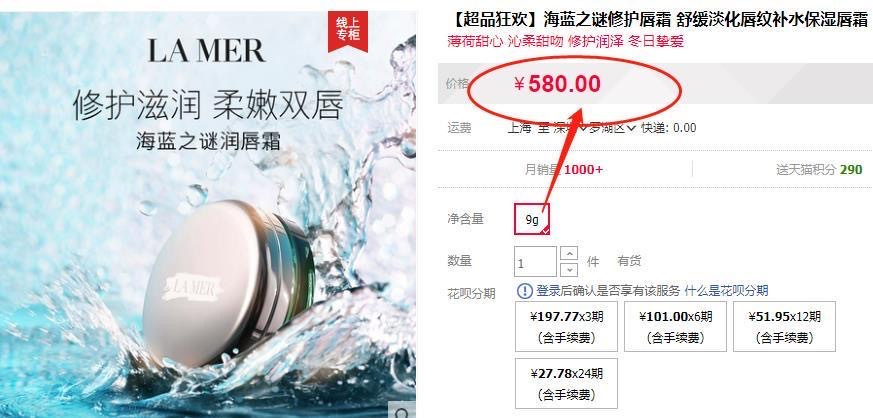 海蓝之谜产品有多好,不需要我再多介绍,当然,它的价格也是绝对的贵妇级,这款唇膜某猫去年双11正装9g的价格是580元↓