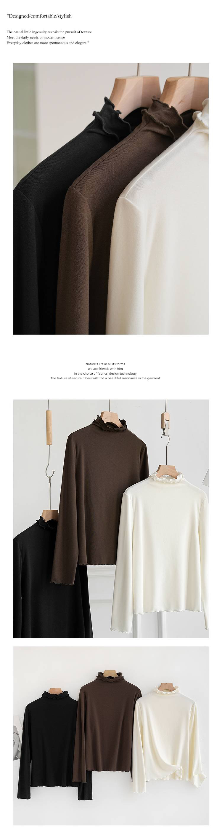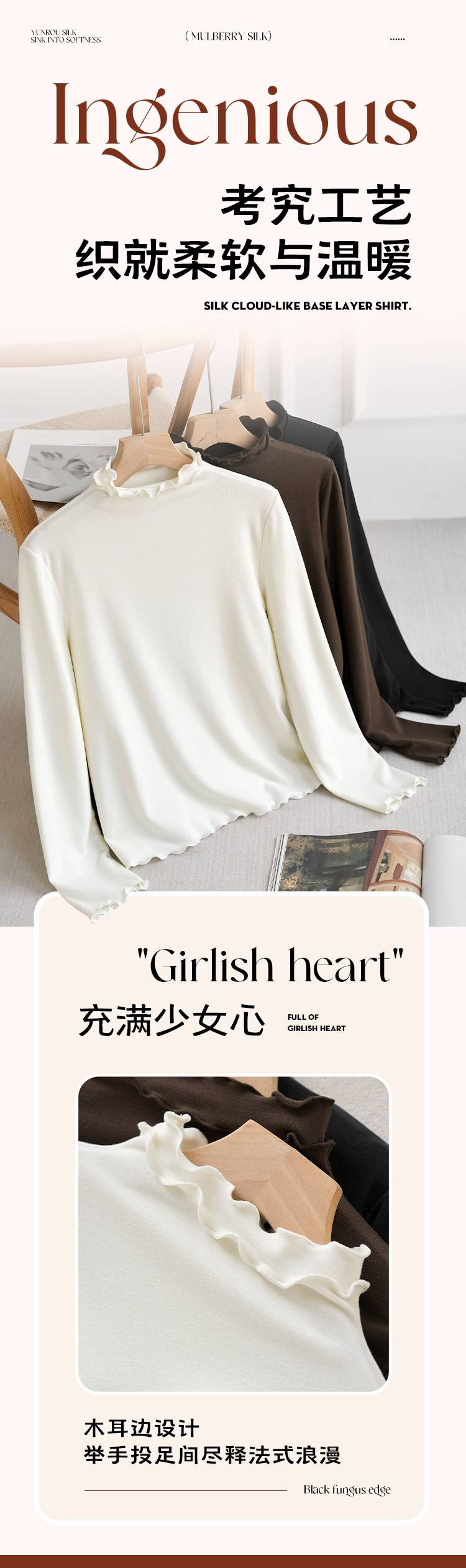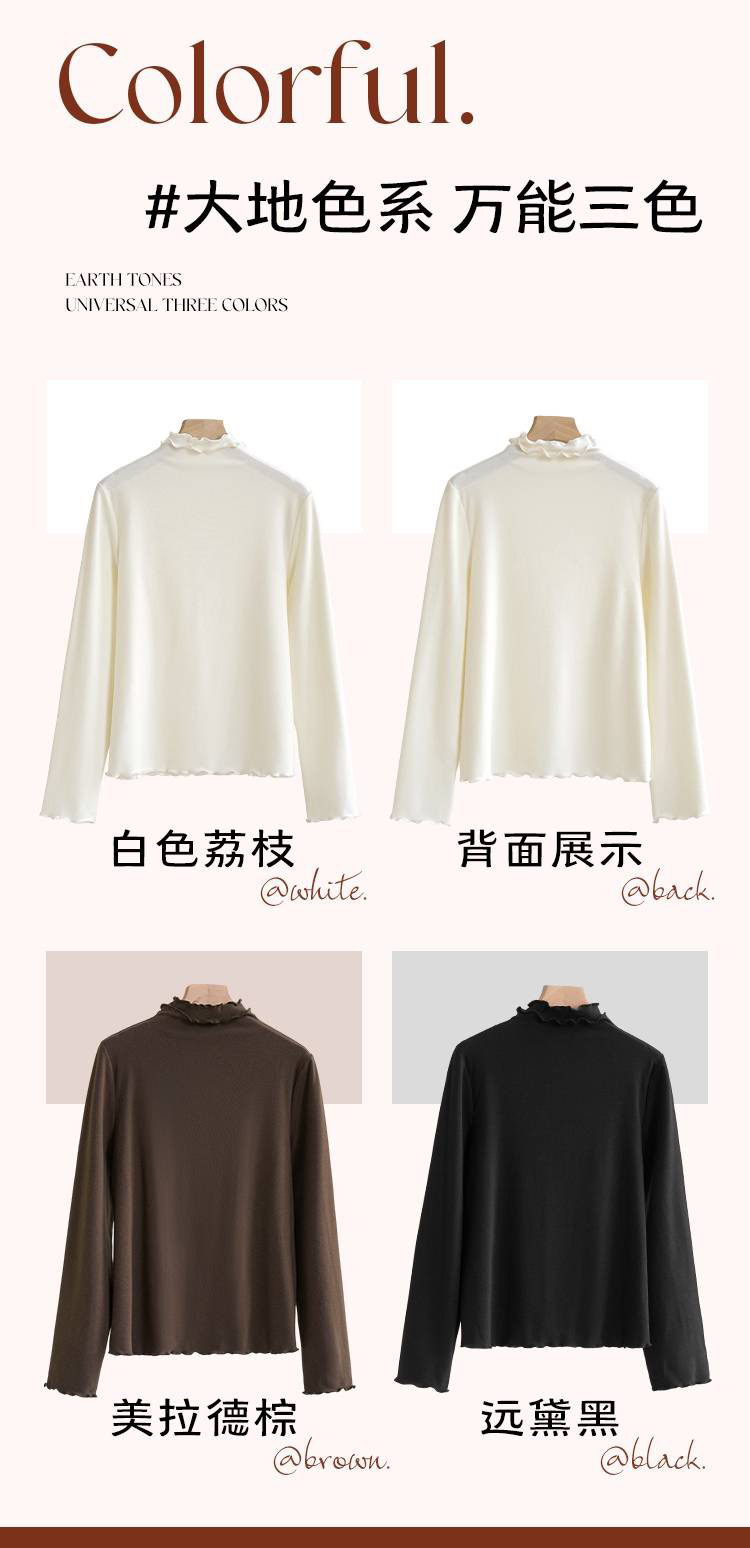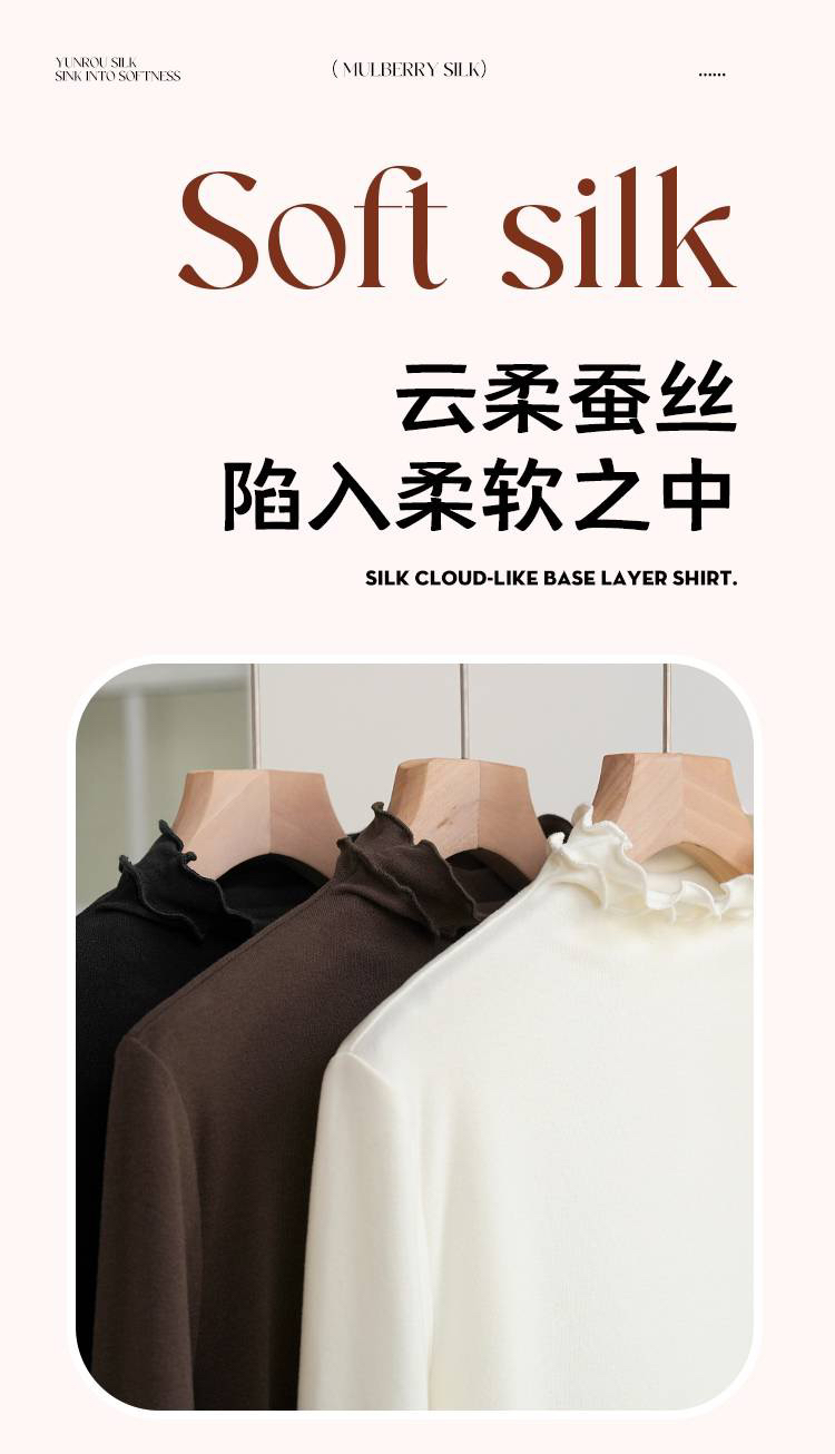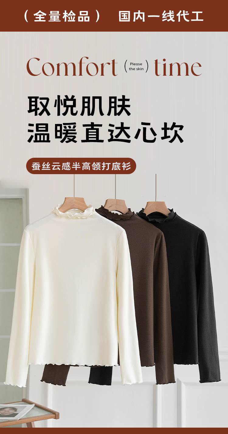 【4.0蚕丝云感】女士薄暖润肤木耳花边半高领打底衫003A007177