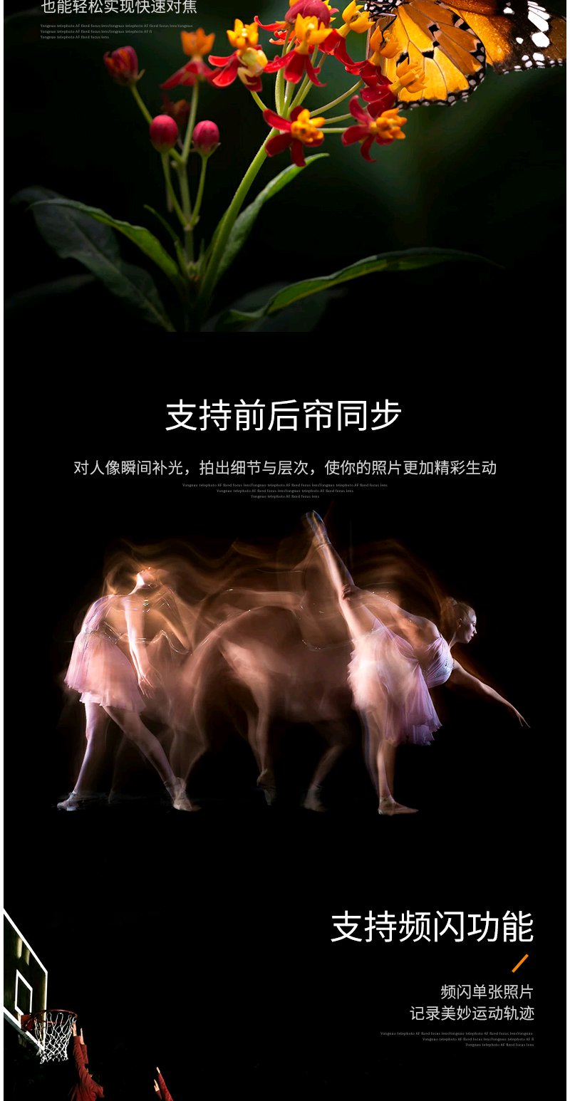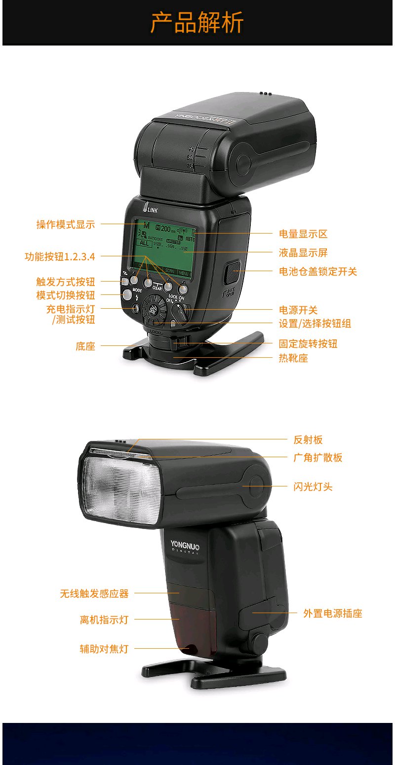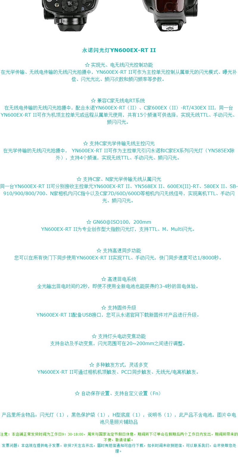 | 附加功能 | 主控闪光,离机闪光,高速同步,后帘同步,曝光补偿,曝光包围,曝光镇定,灯头电动变焦,声音提示,自动保存设置,PC同步,节电模式,过热保护,自定义功能,固件升级 |