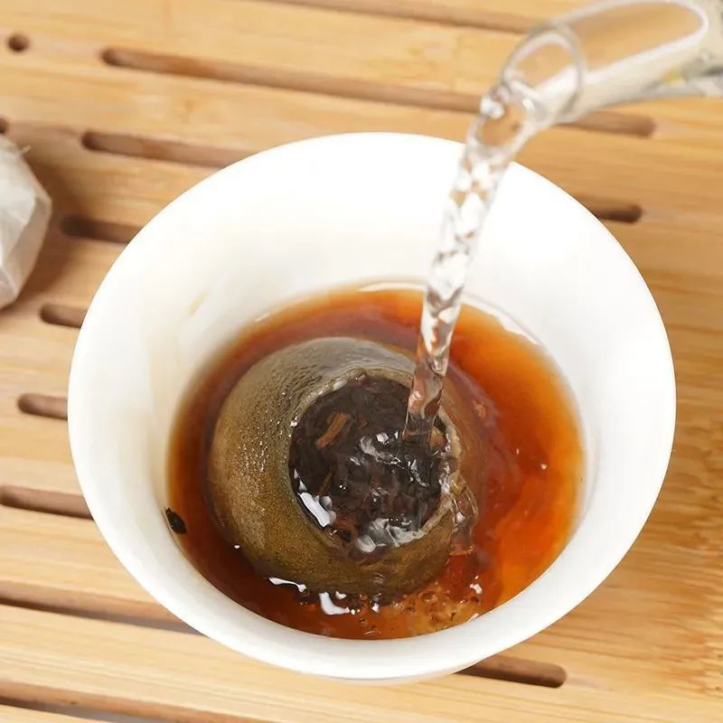 圆润饱满、柑香扑鼻,茶汤色泽红润透亮,柑皮独有果香和普洱茶醇厚茶香浑然一体,入口香滑,回味无穷,鲜香无比。