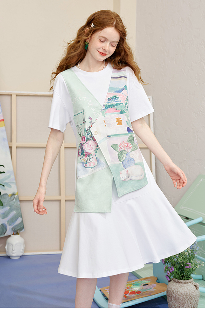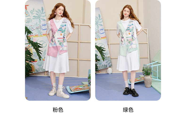 两三事 清恬假寐 2025夏季新款小清新印花拼接绑带假两件连衣裙