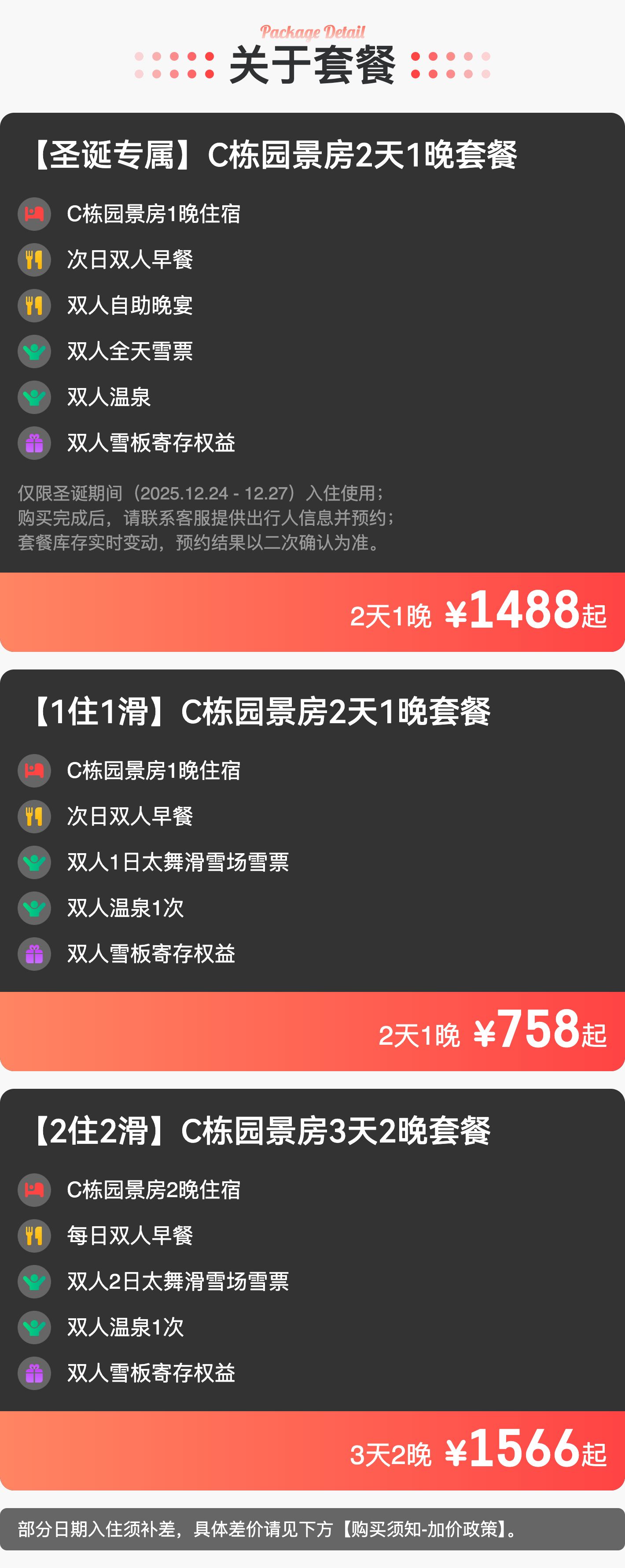 雪季套餐!1晚/2晚【崇礼太舞南山里酒店】圣诞专属套餐享自助晚宴+滑雪+温泉!雪季套餐含双人滑雪票、温泉票、雪具寄存权益,北京周边滑雪推荐~