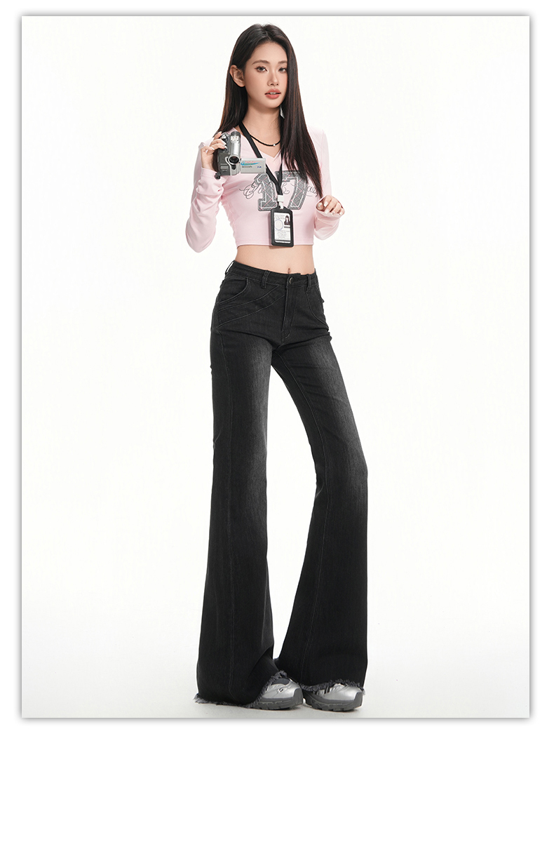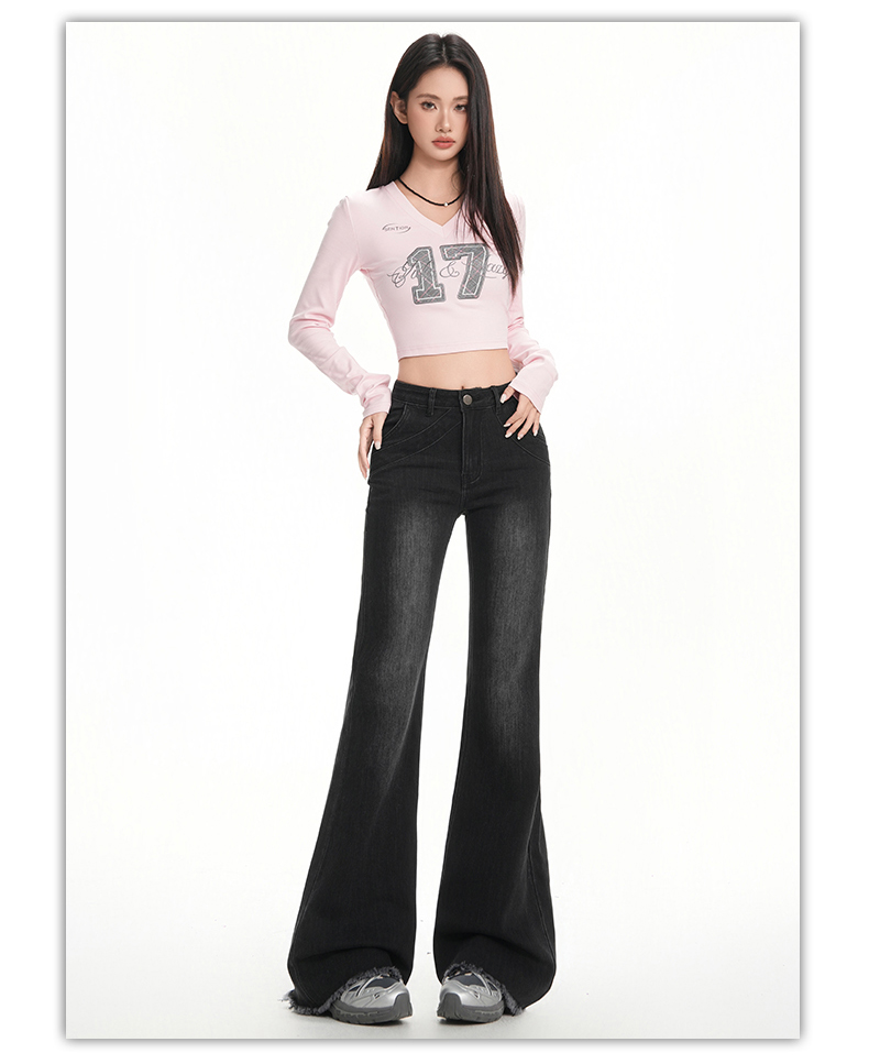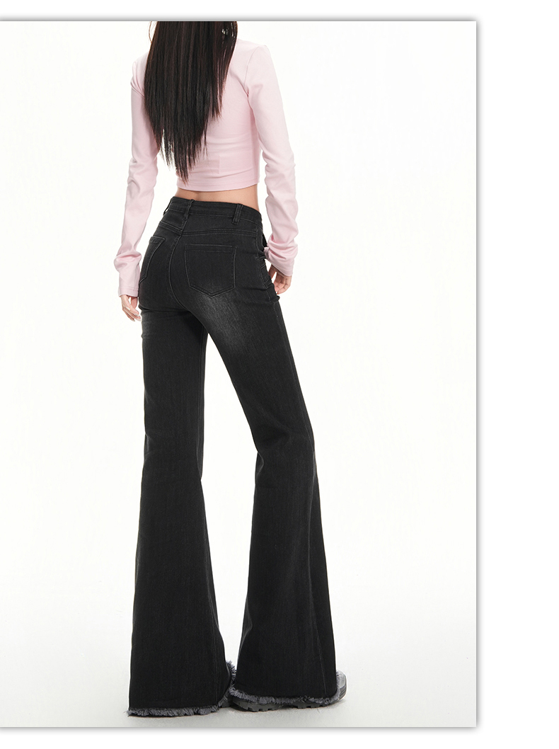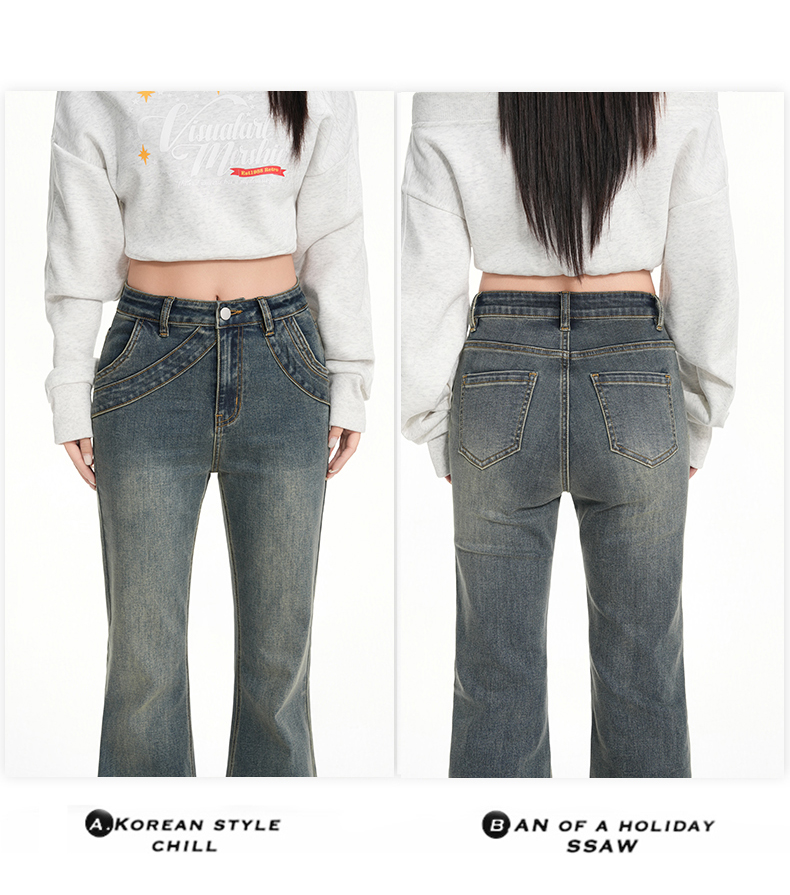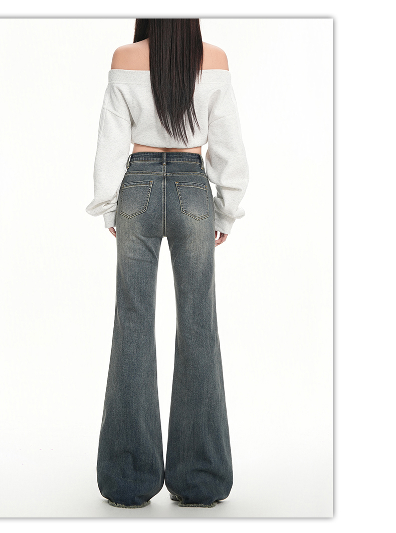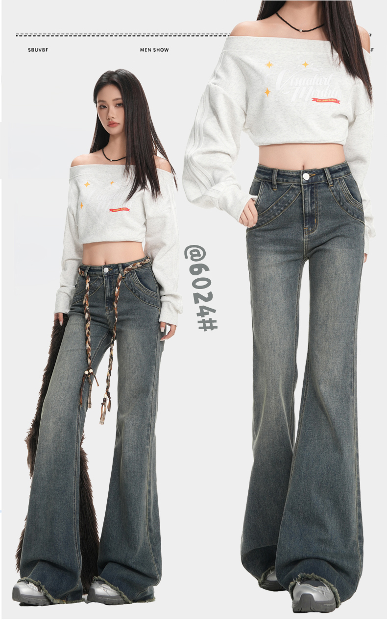 罗蒙秋冬女士复古牛仔裤浅色微喇修身马蹄喇叭高腰显瘦弹力拖地长裤
