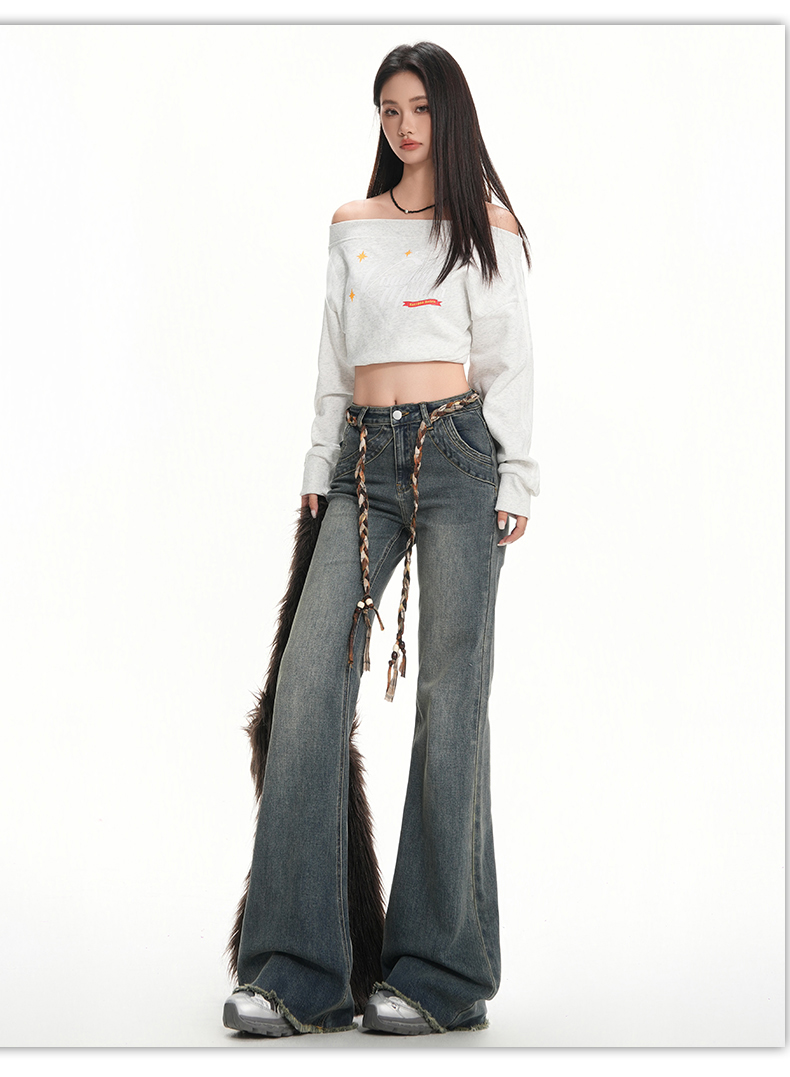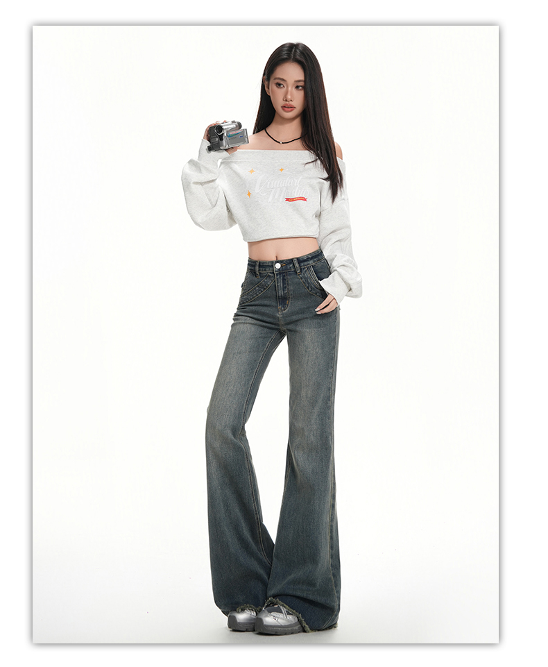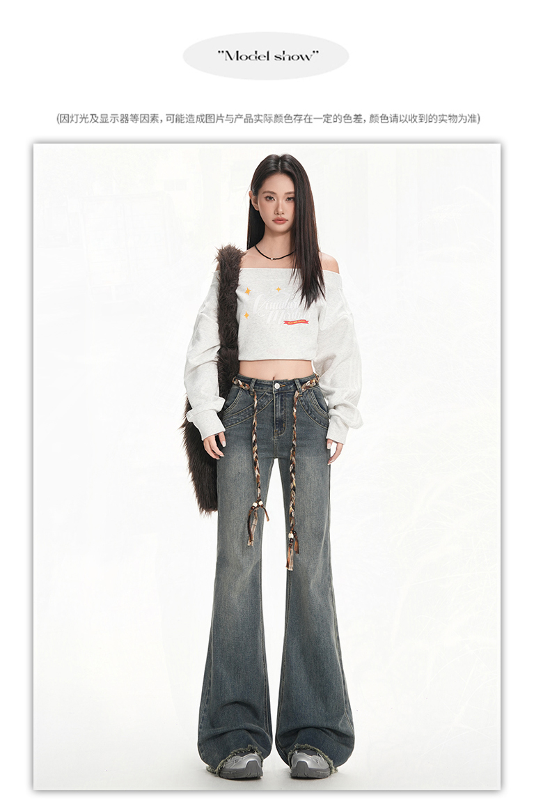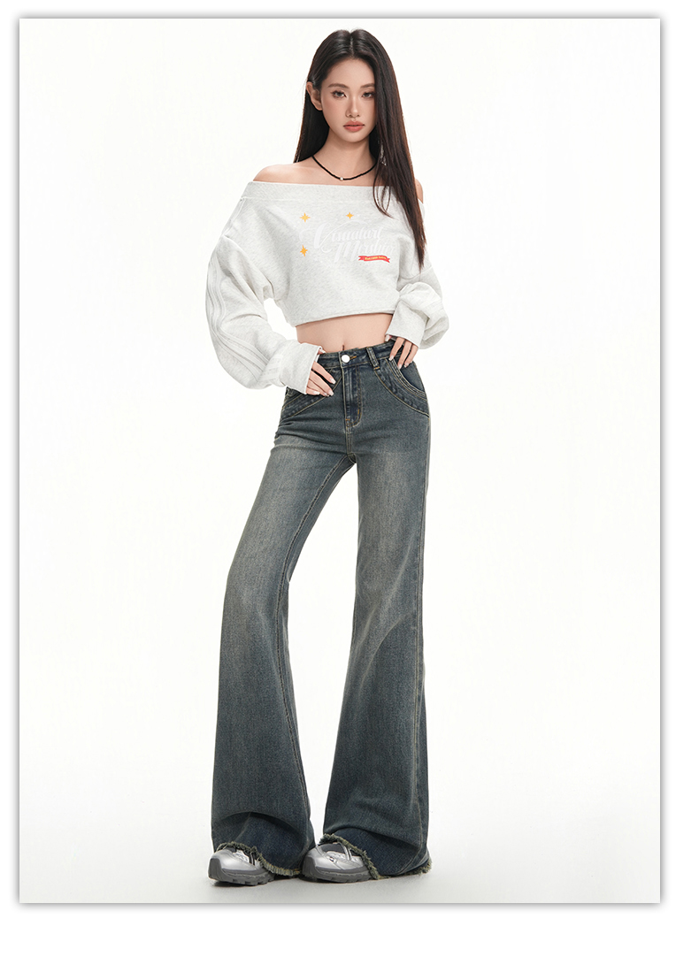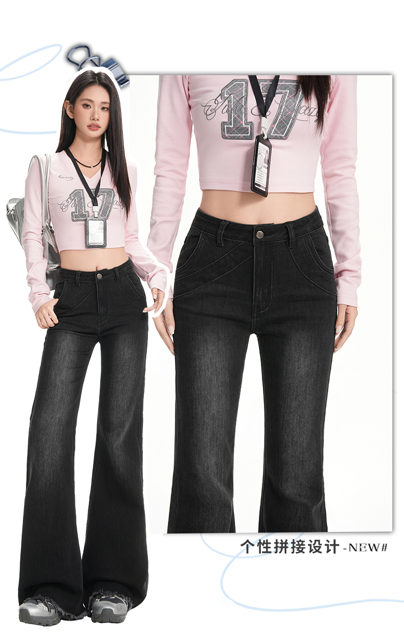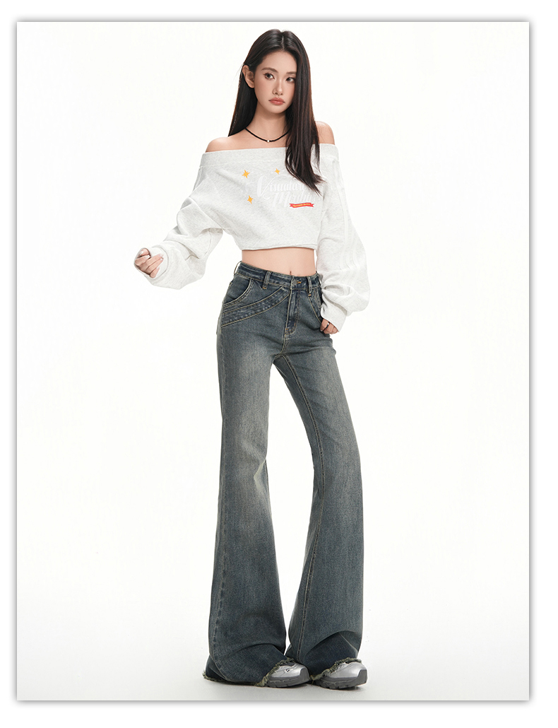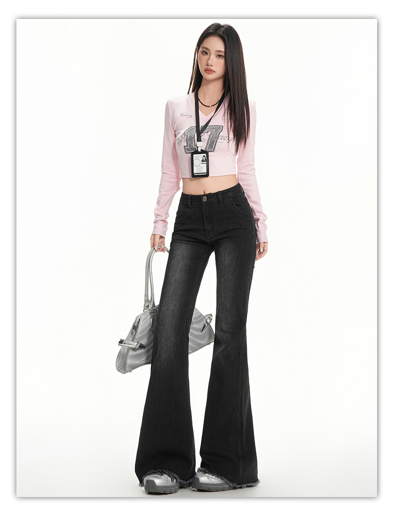 罗蒙秋冬女士复古牛仔裤浅色微喇修身马蹄喇叭高腰显瘦弹力拖地长裤
