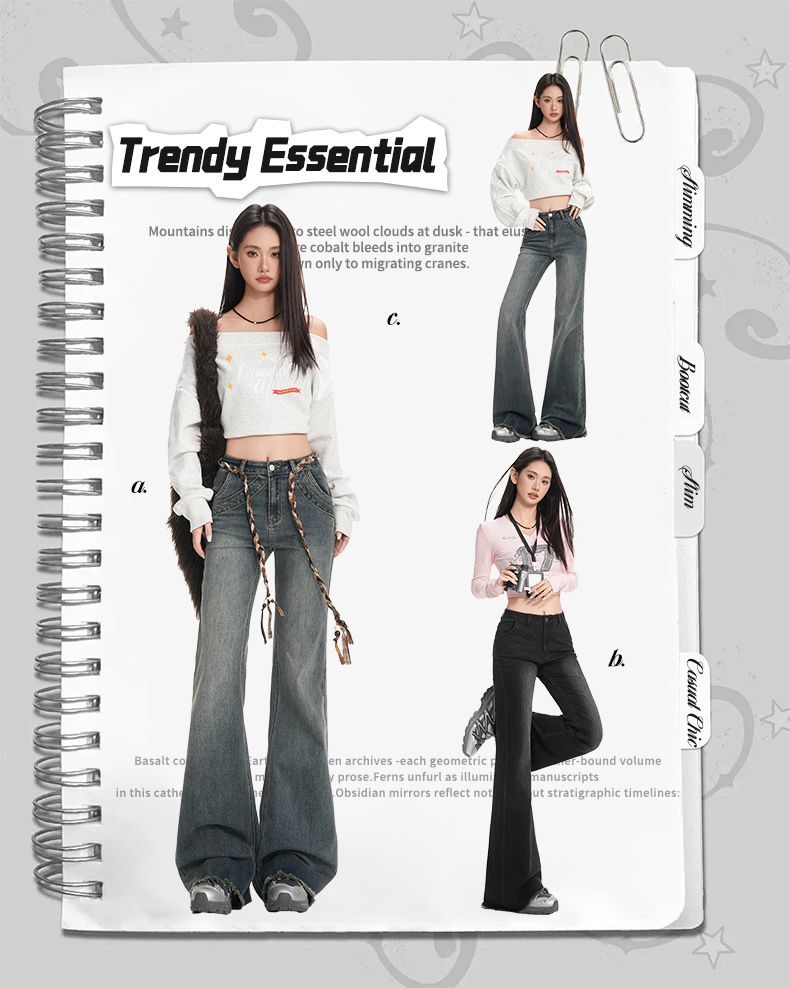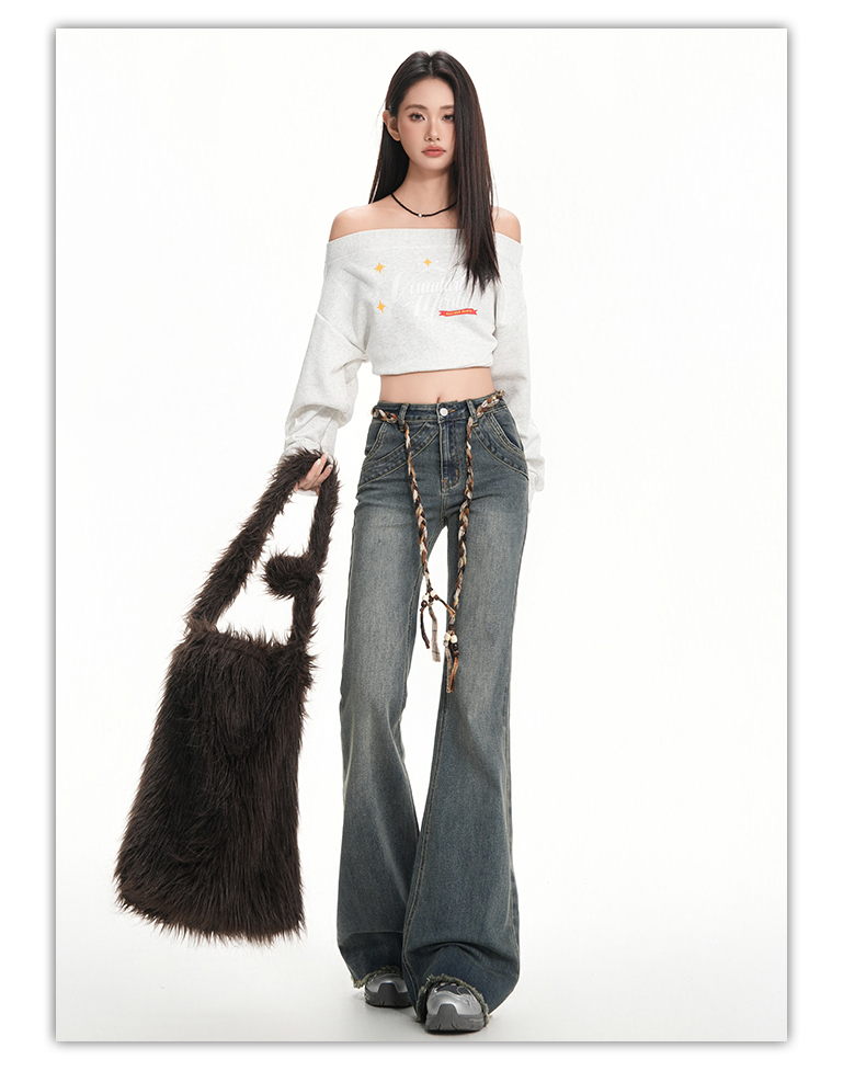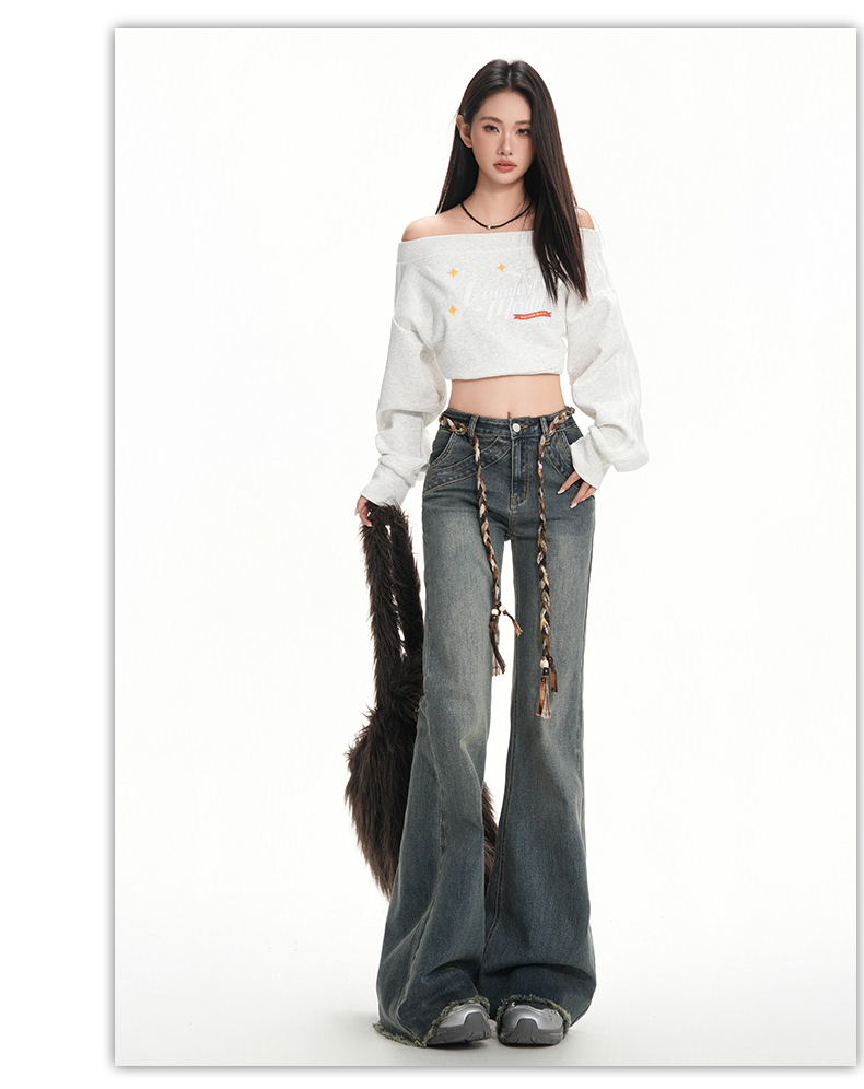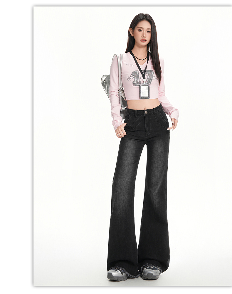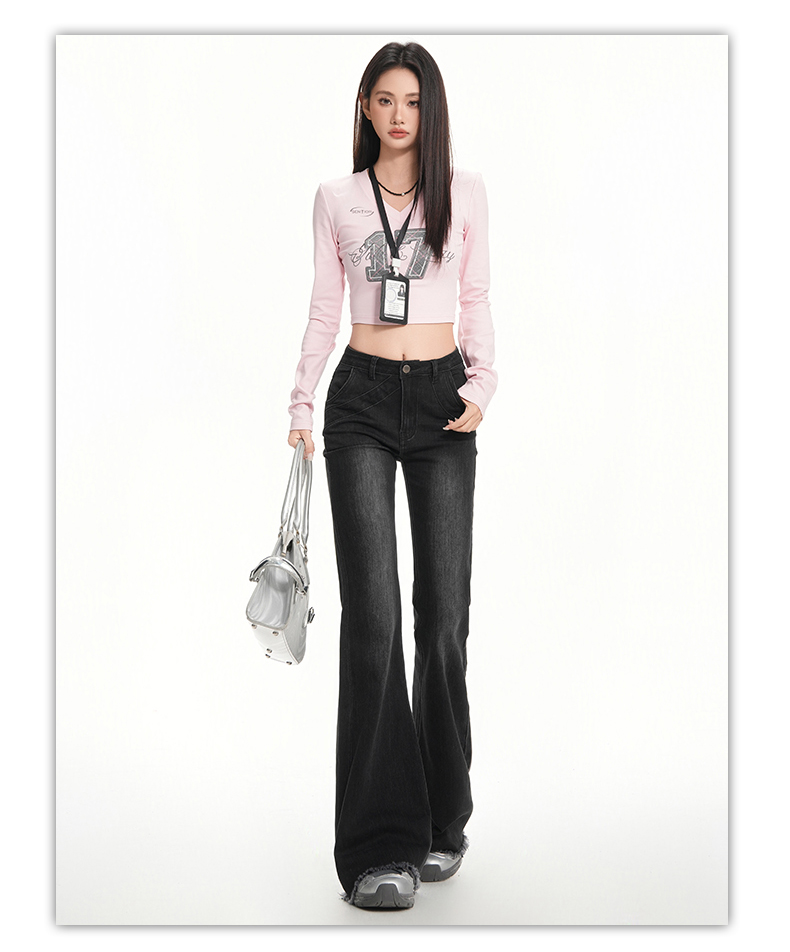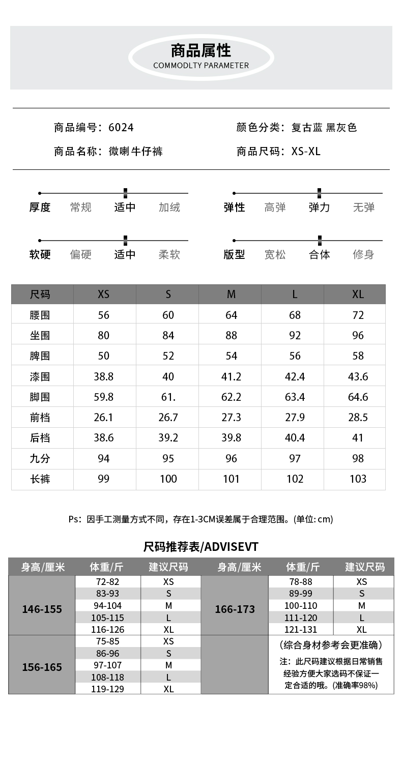 罗蒙秋冬女士复古牛仔裤浅色微喇修身马蹄喇叭高腰显瘦弹力拖地长裤
