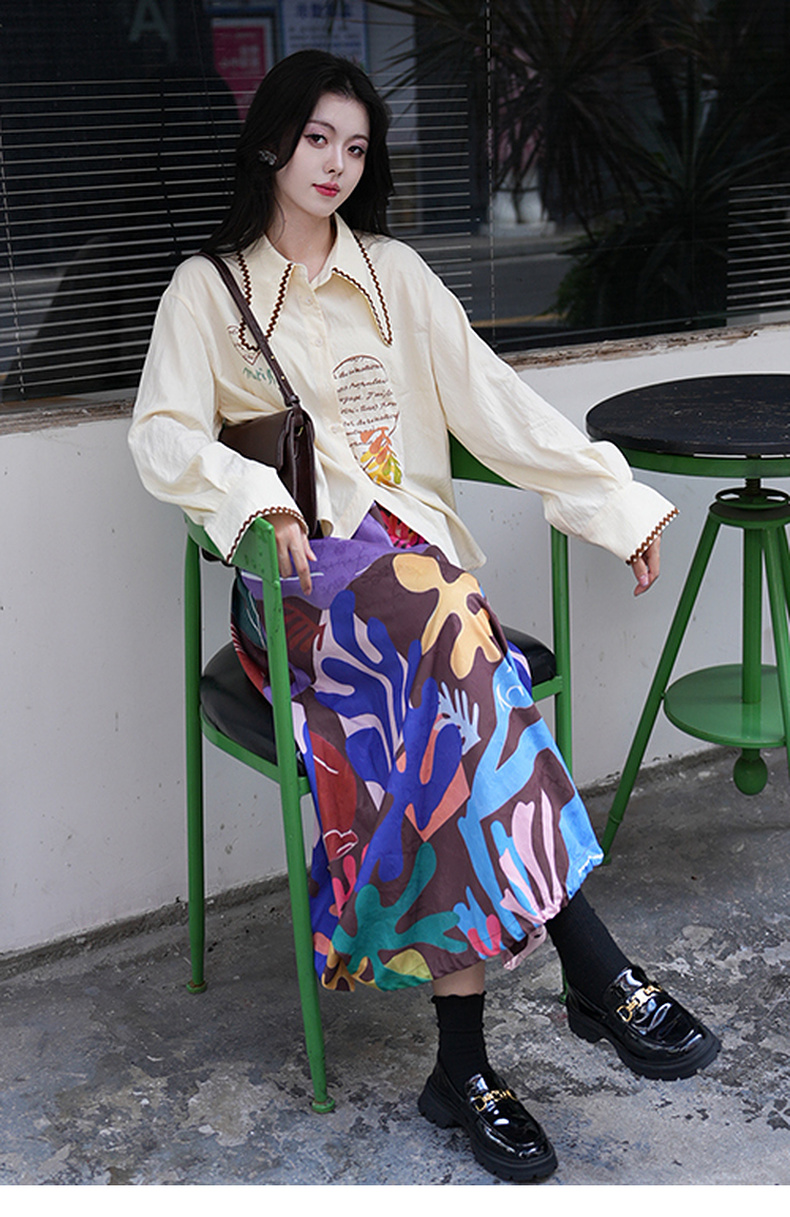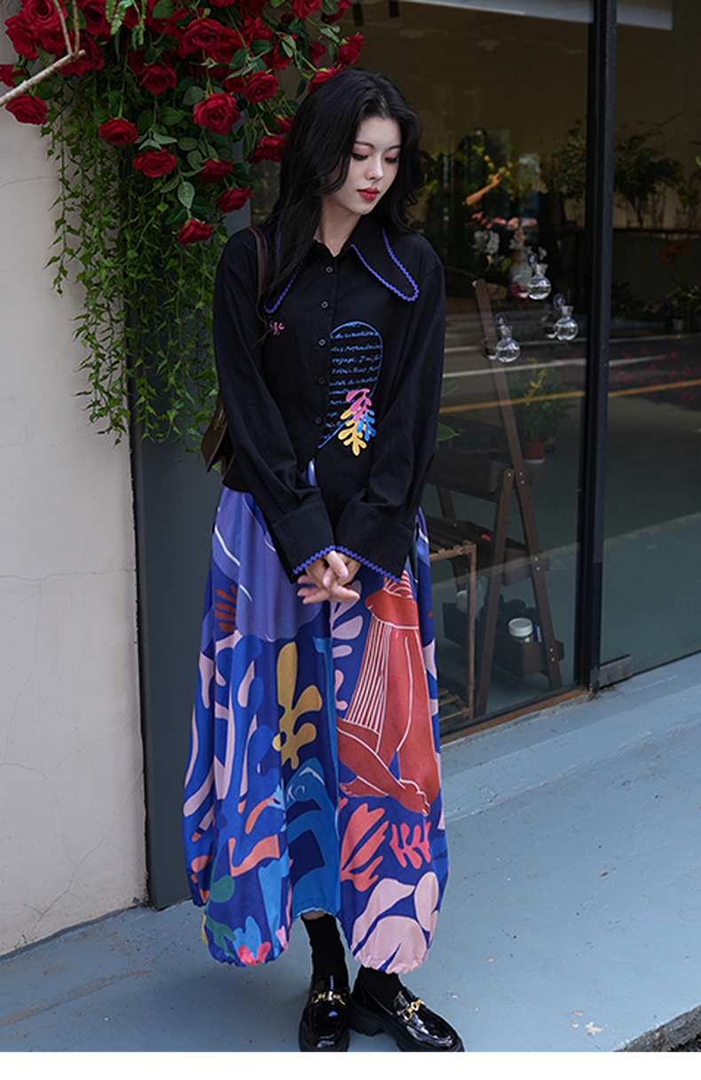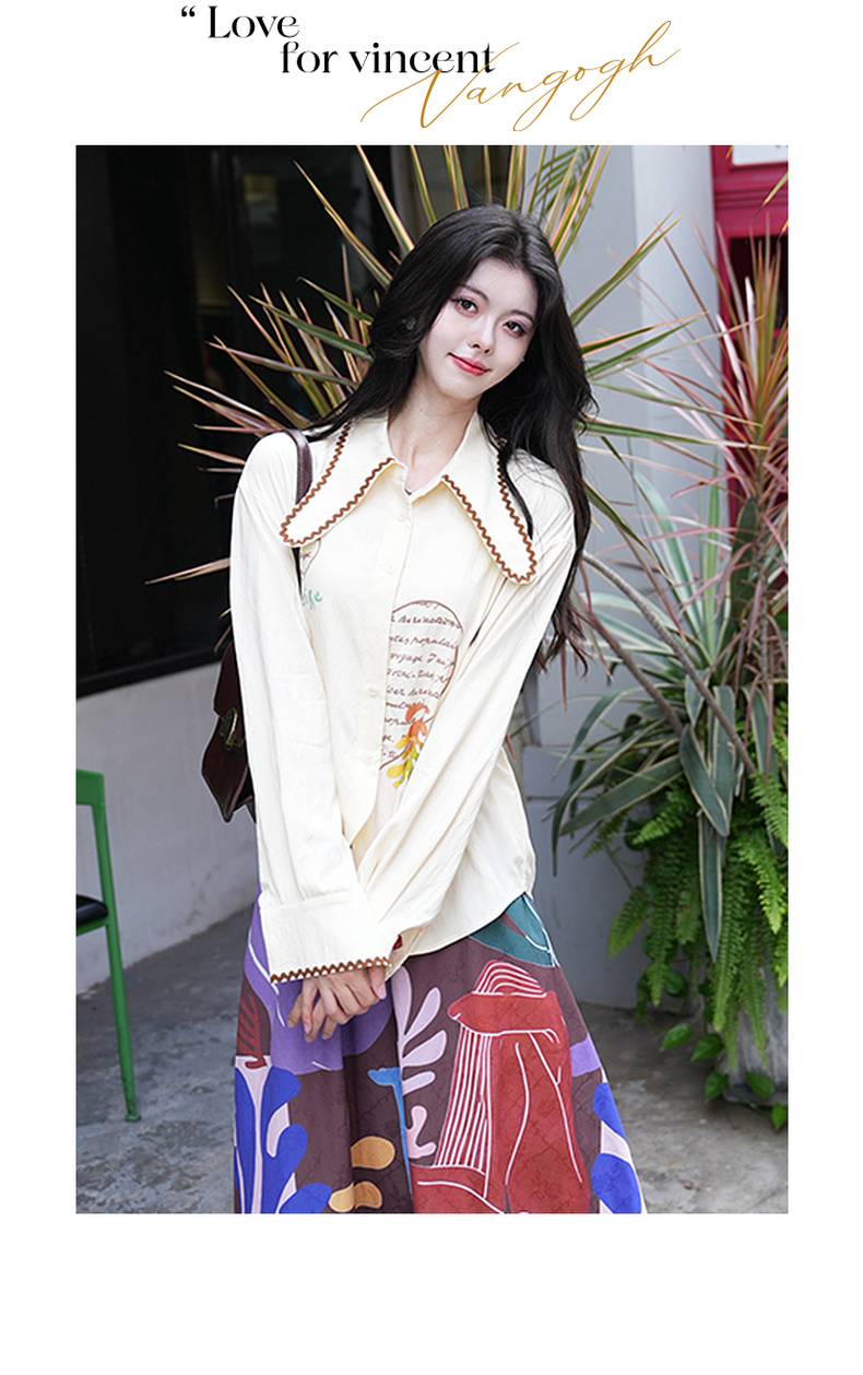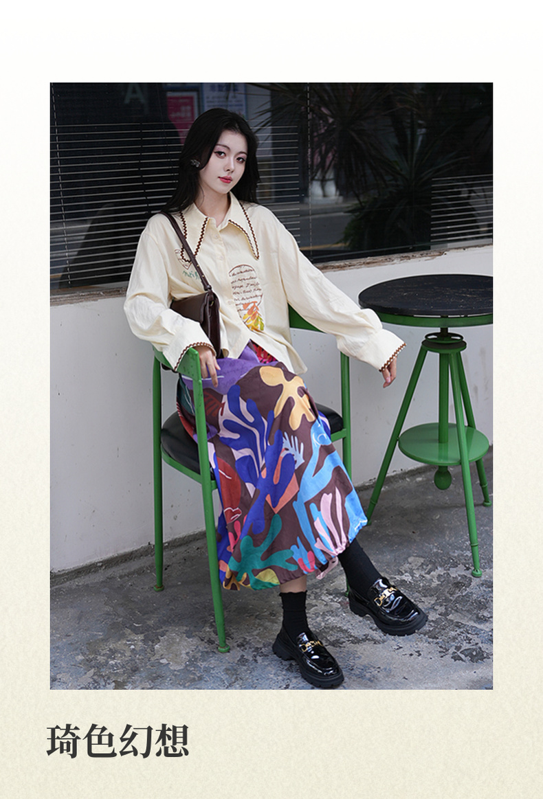 两三事梵高文艺琦色幻想2025秋季新款复古印花衬衫半身裙两件套女