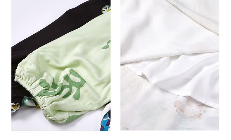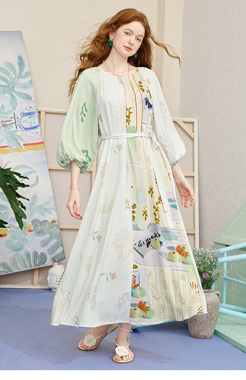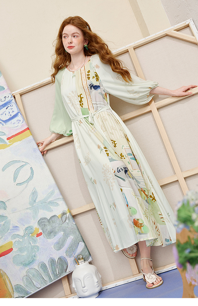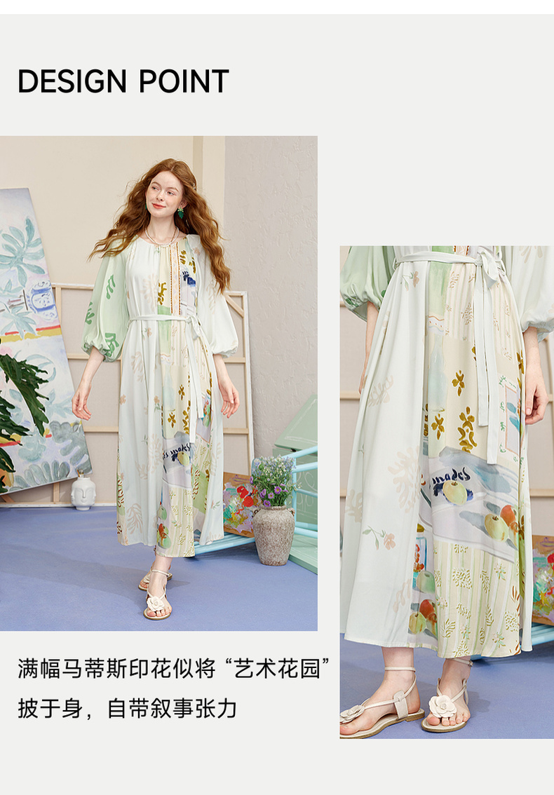 两三事 花影轻斜 2025夏季新品森女风印花布拼接绑带灯笼袖连衣裙