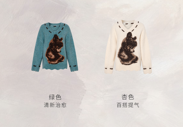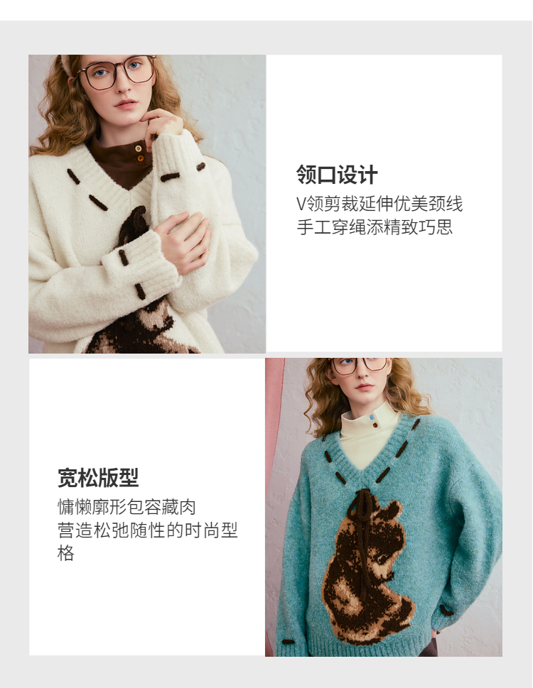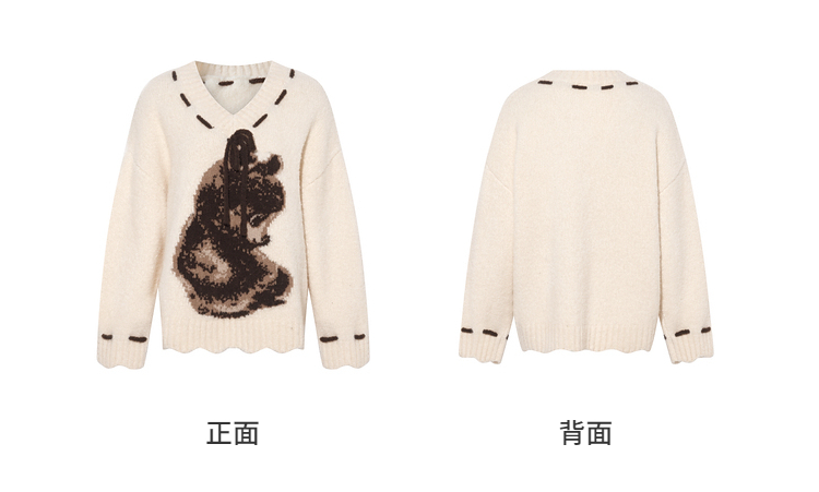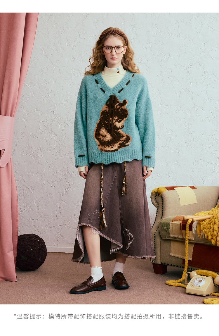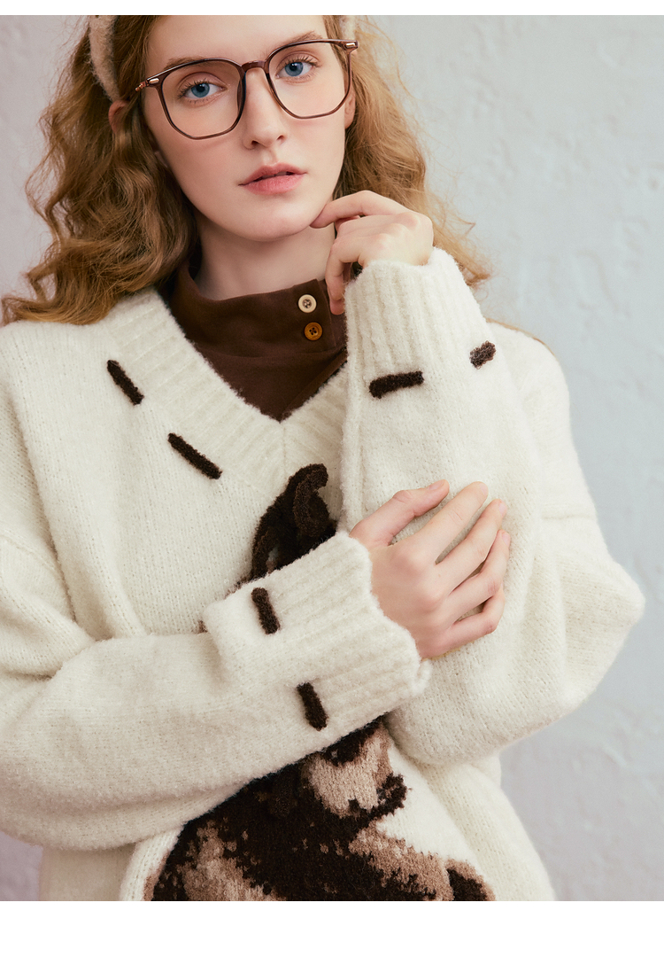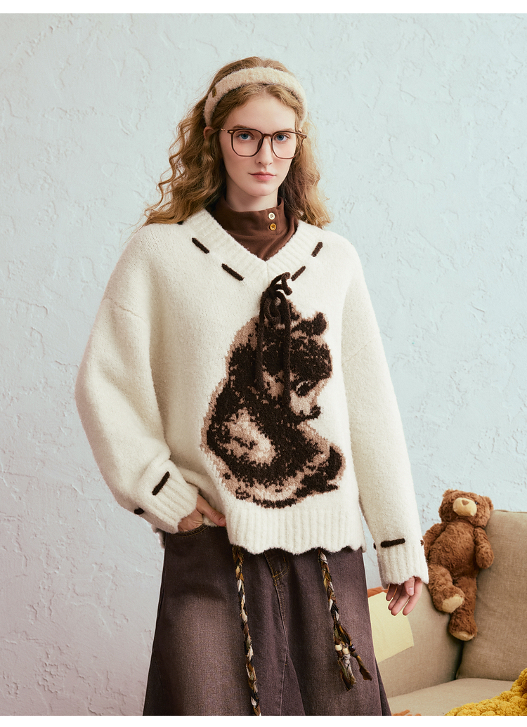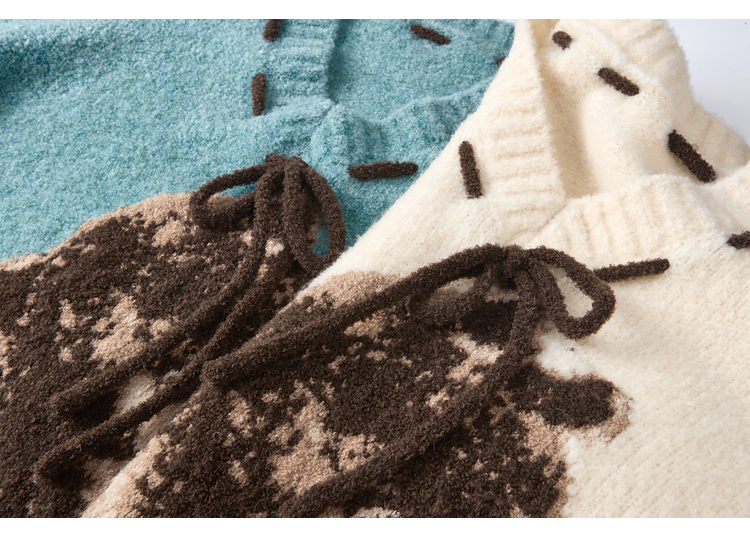 两三事 褪色诗篇 2025冬季新款抽象图案穿绳v领套头毛衣女宽松