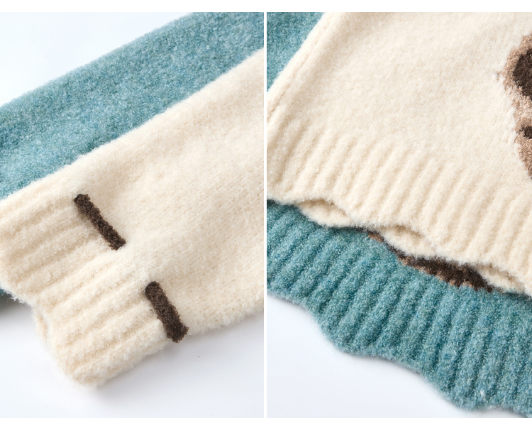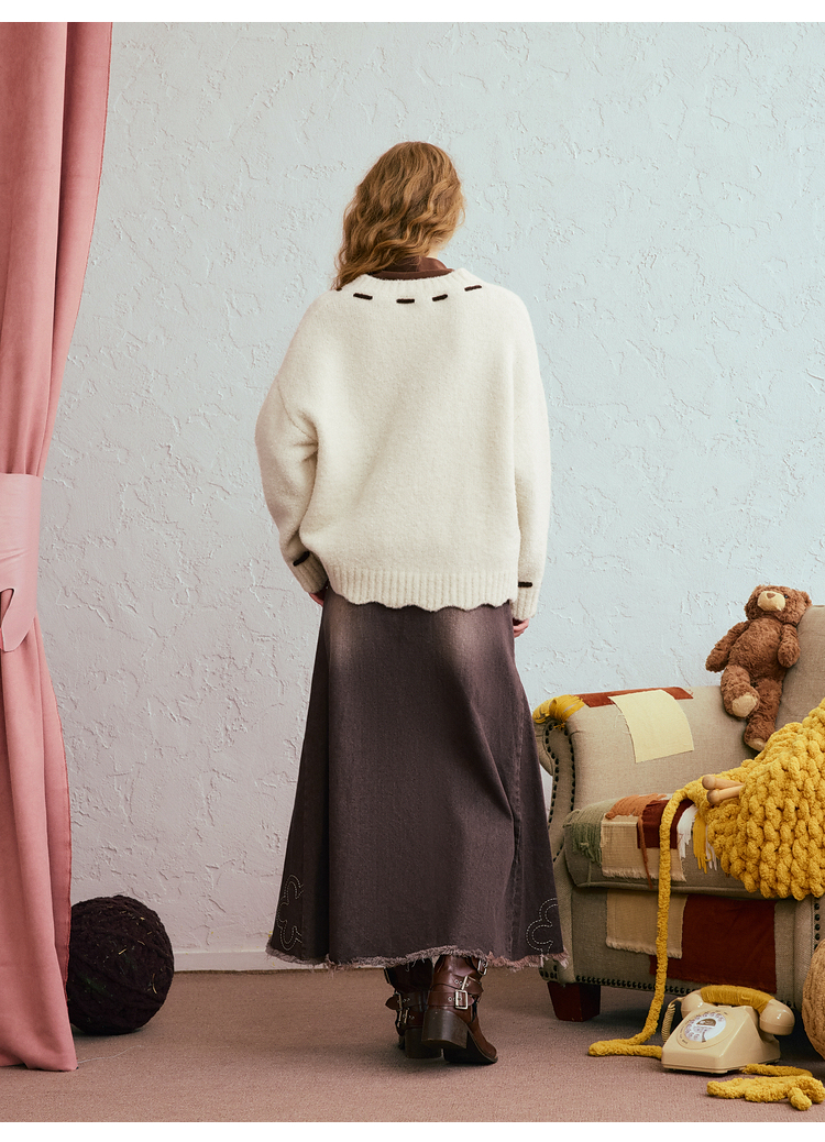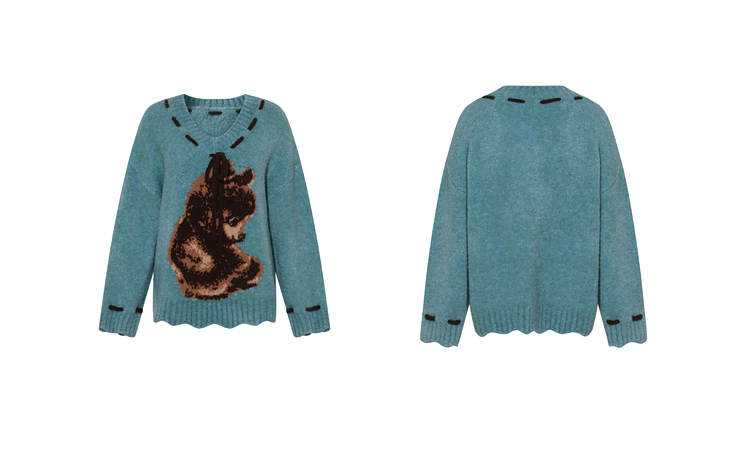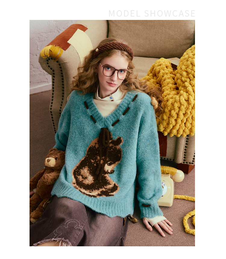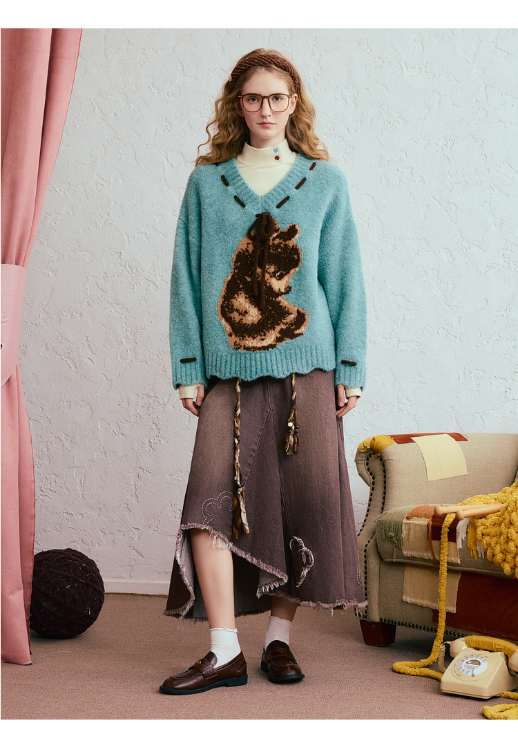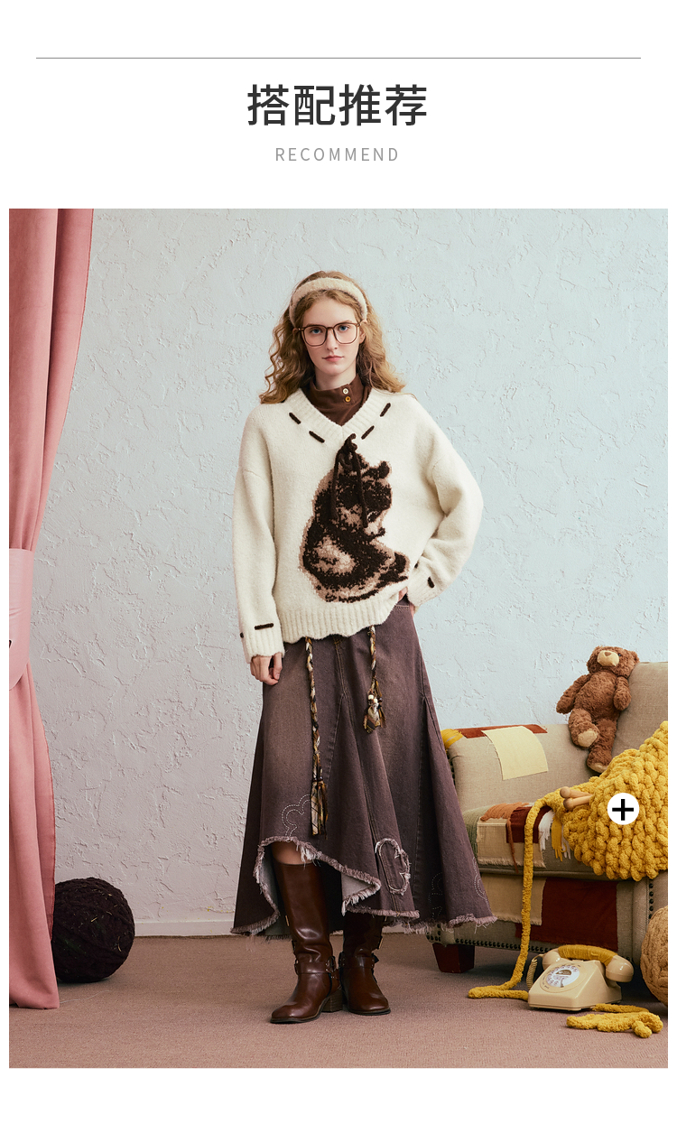 两三事 褪色诗篇 2025冬季新款抽象图案穿绳v领套头毛衣女宽松