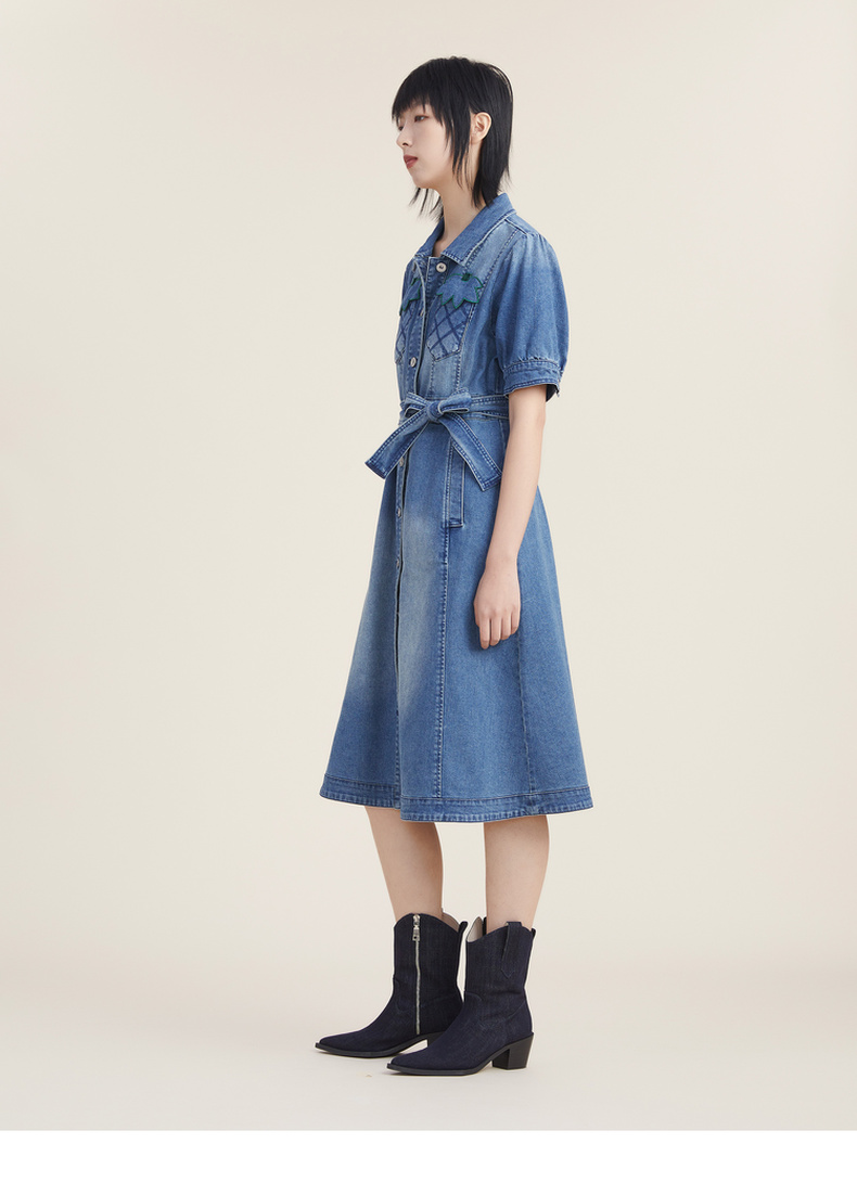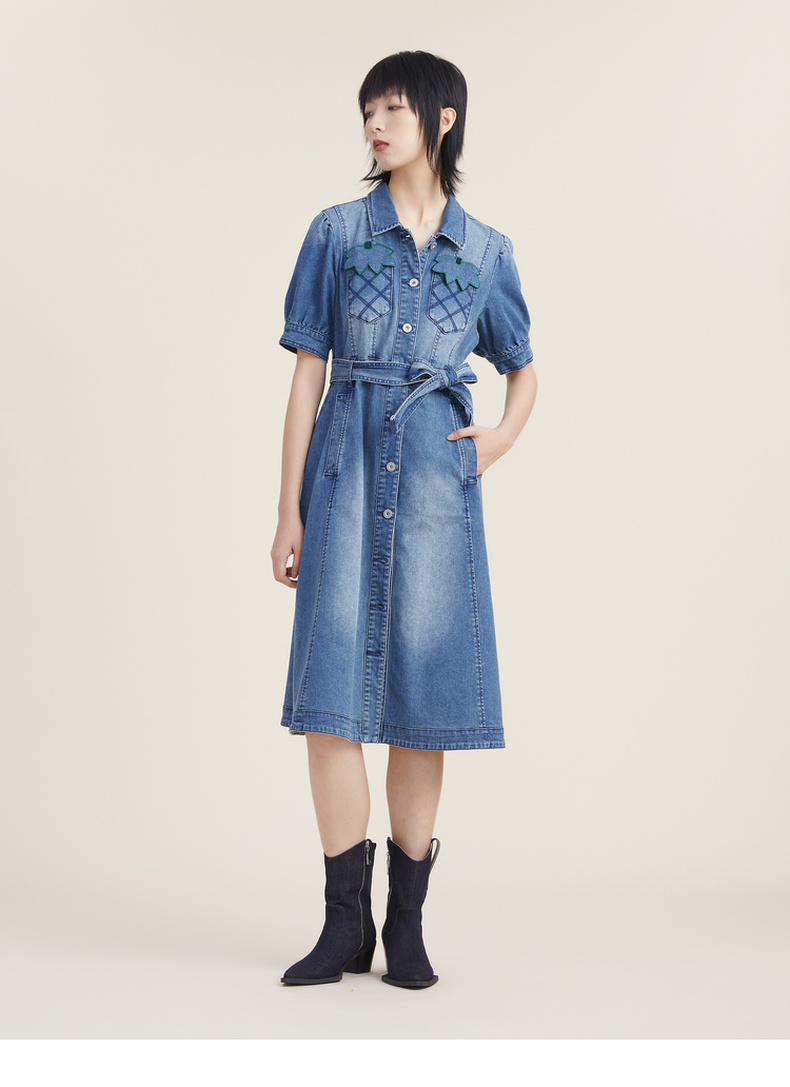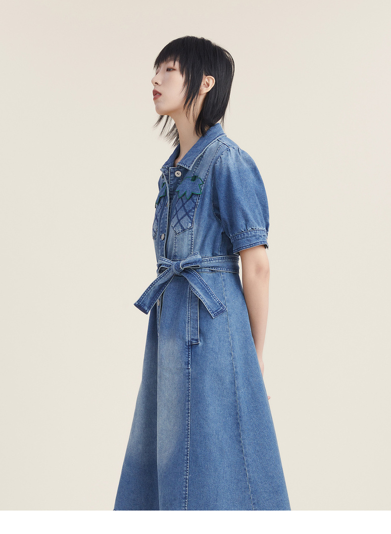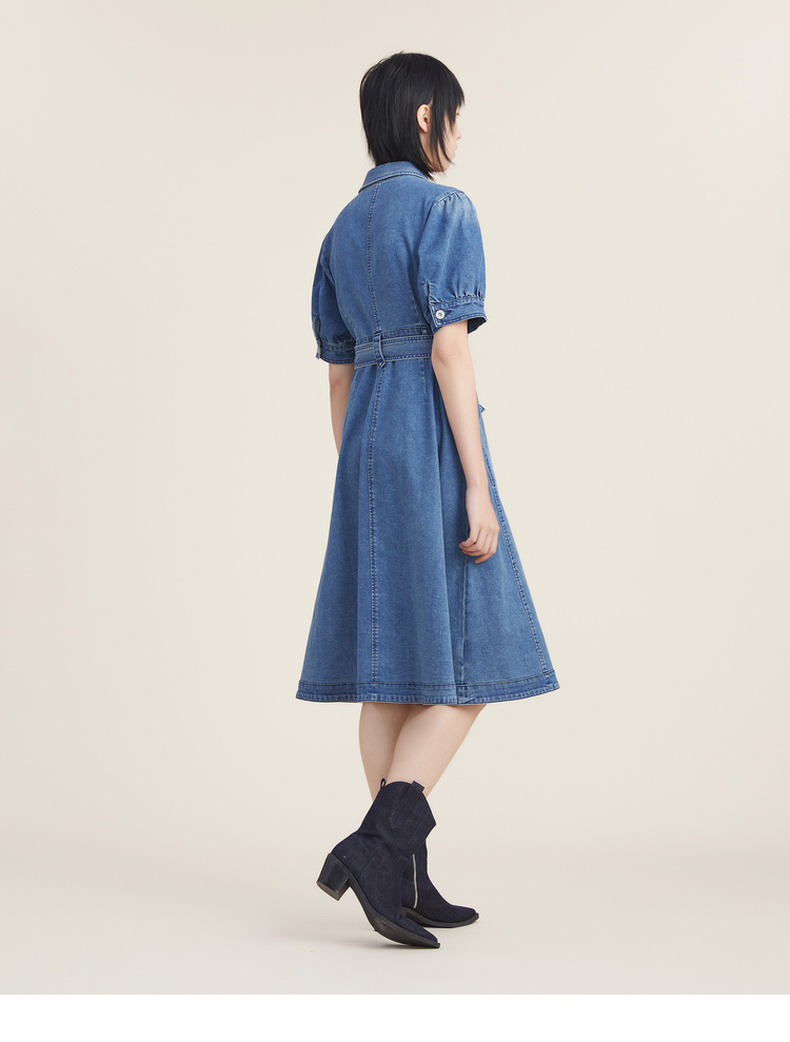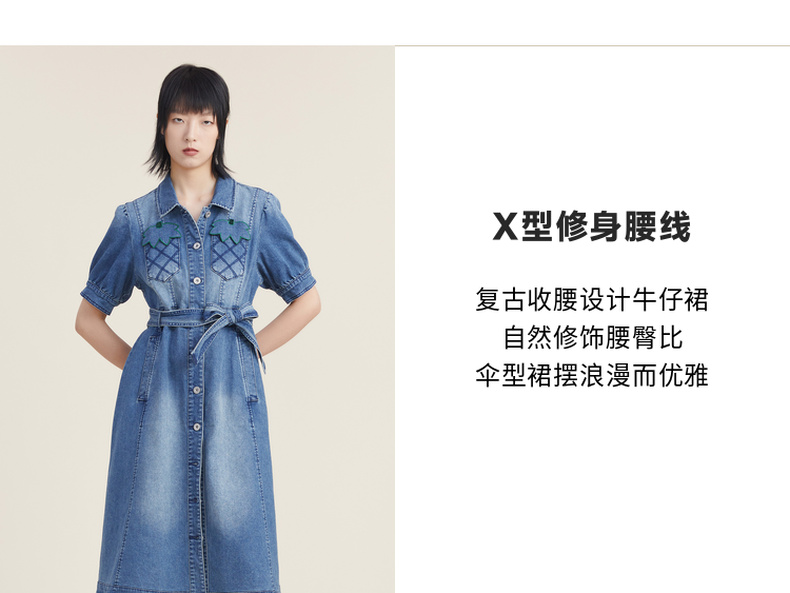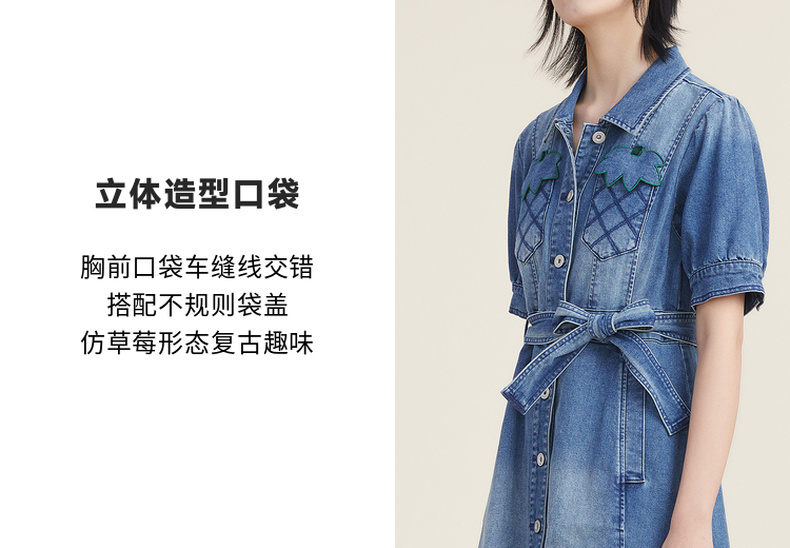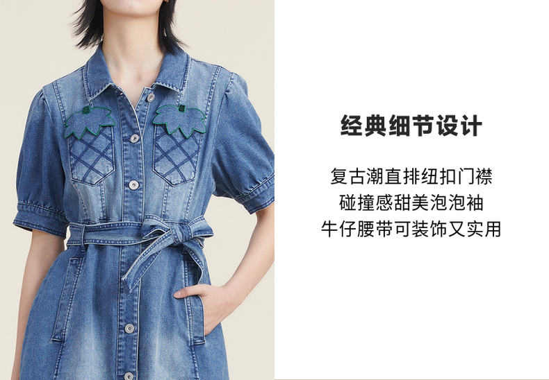 谜底2022秋新品收腰单排扣翻领短袖短袖牛仔连衣裙女223ML1020