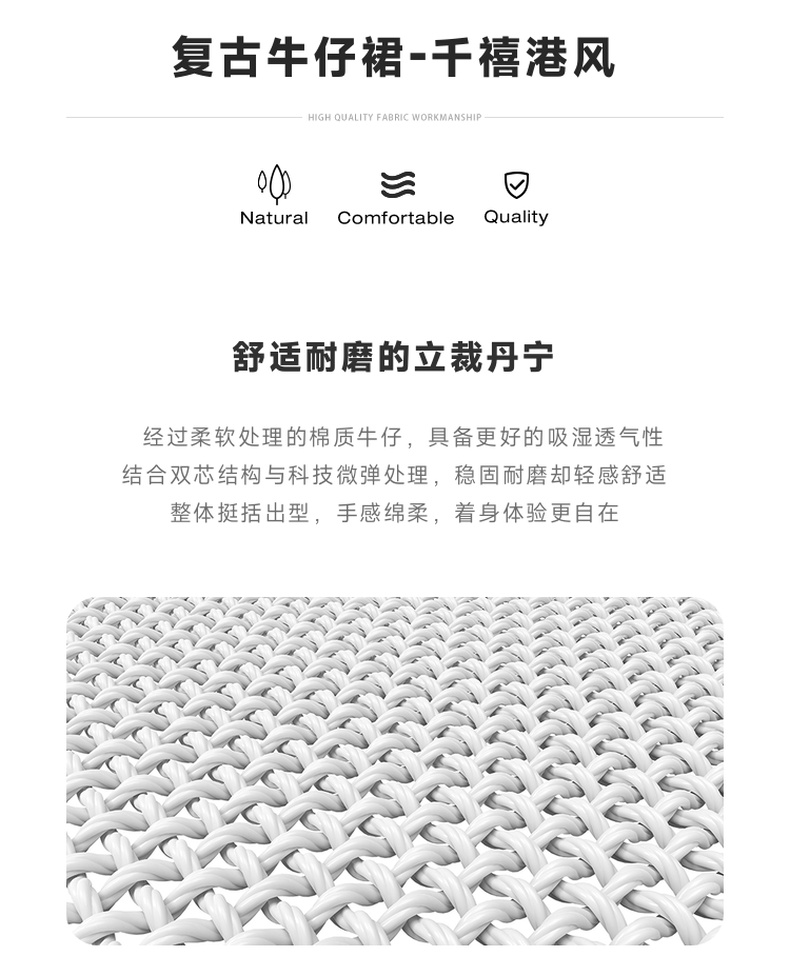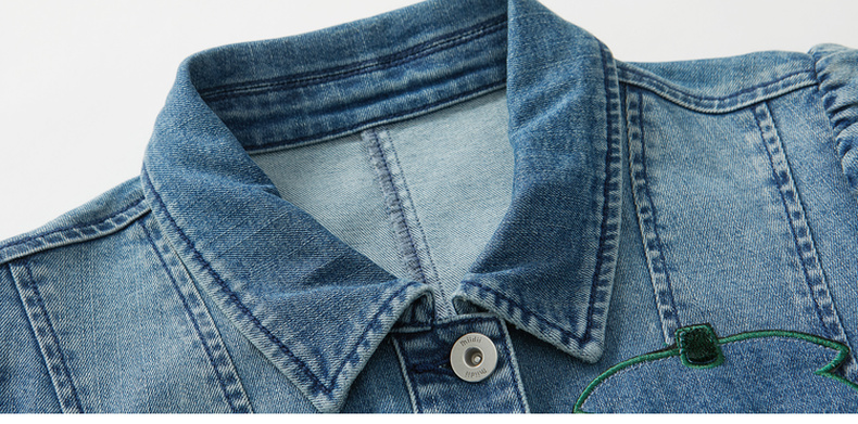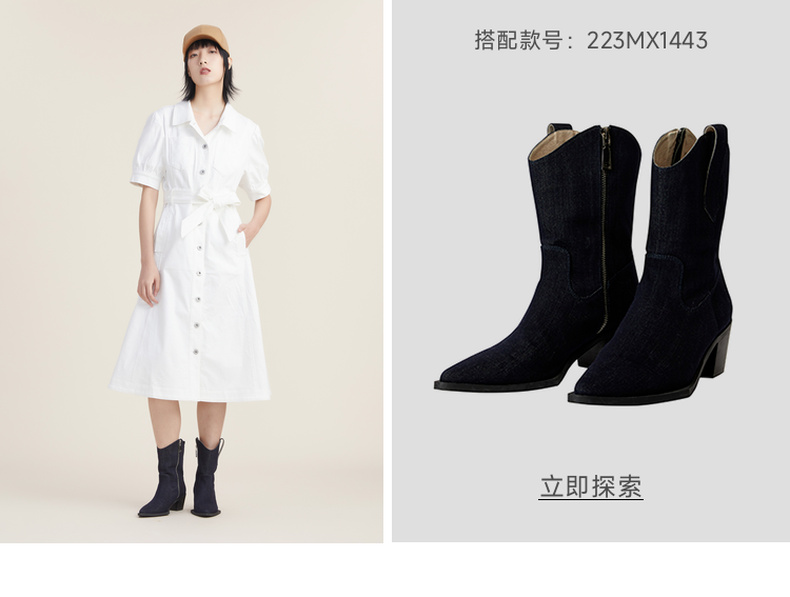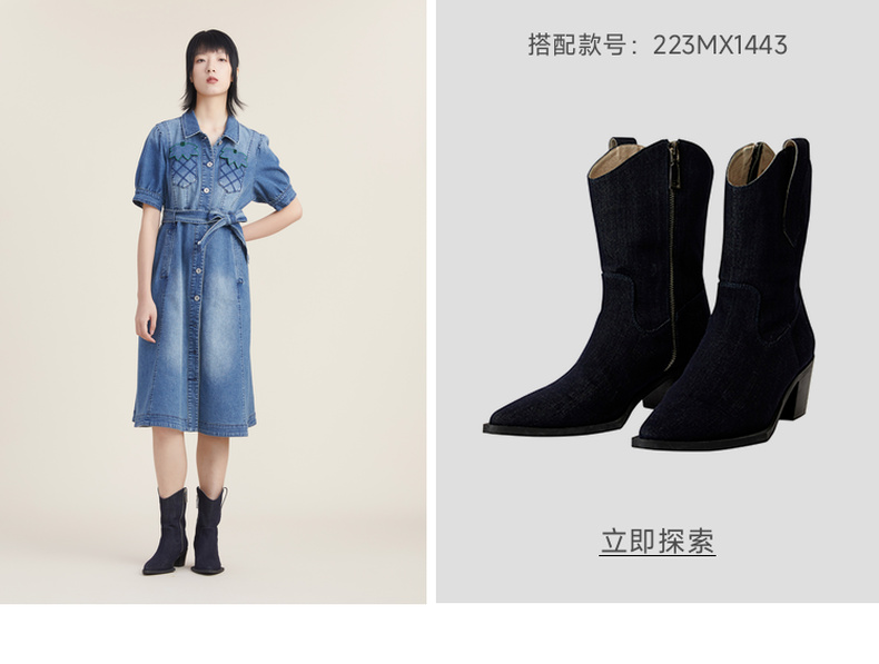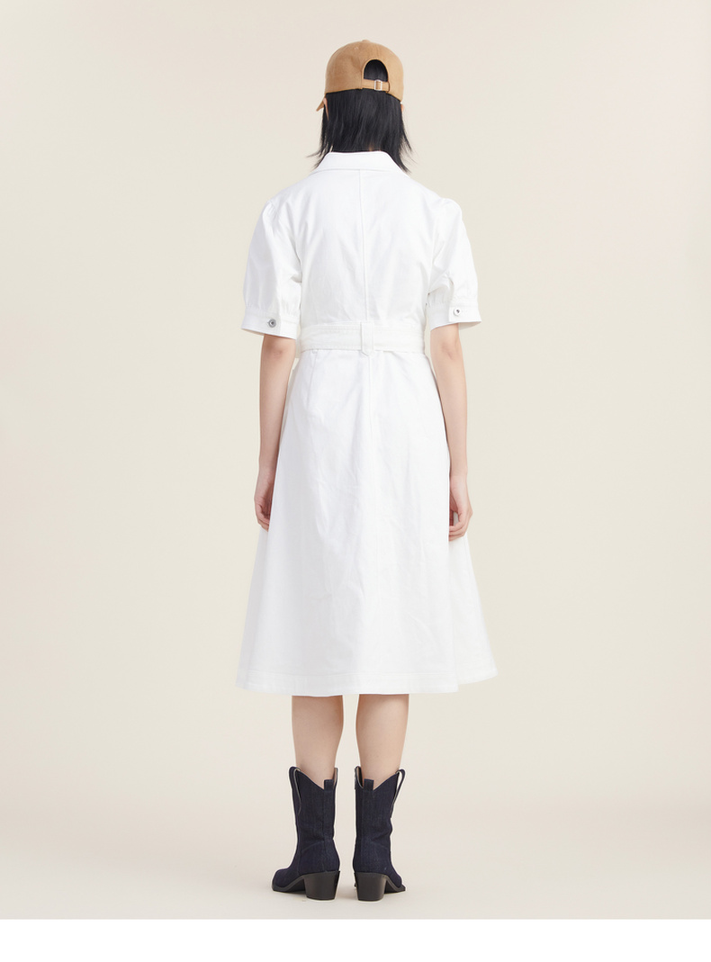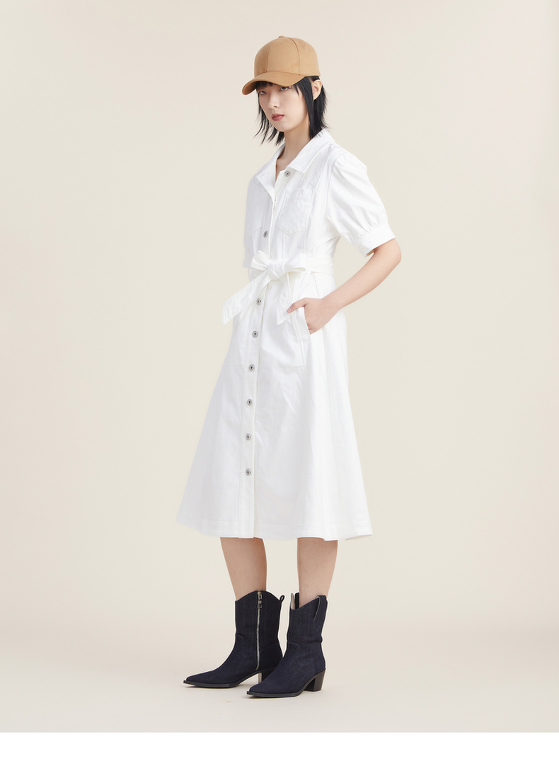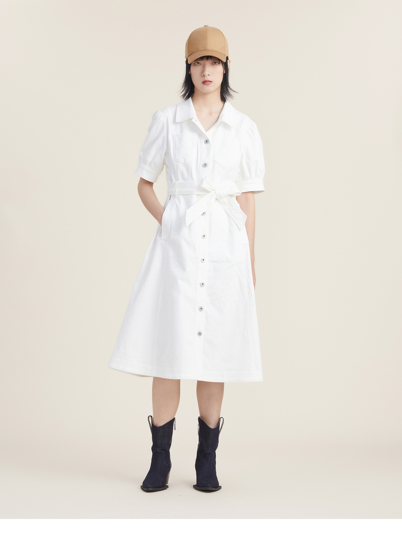 谜底2022秋新品收腰单排扣翻领短袖短袖牛仔连衣裙女223ML1020