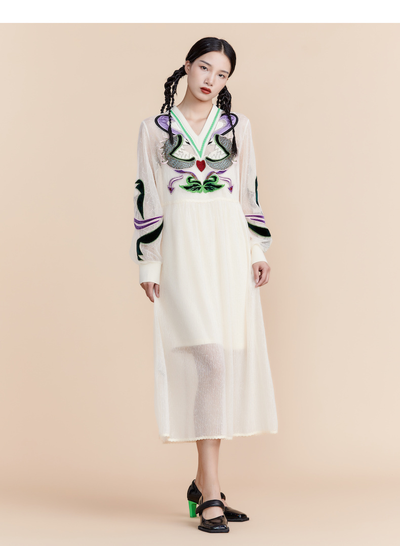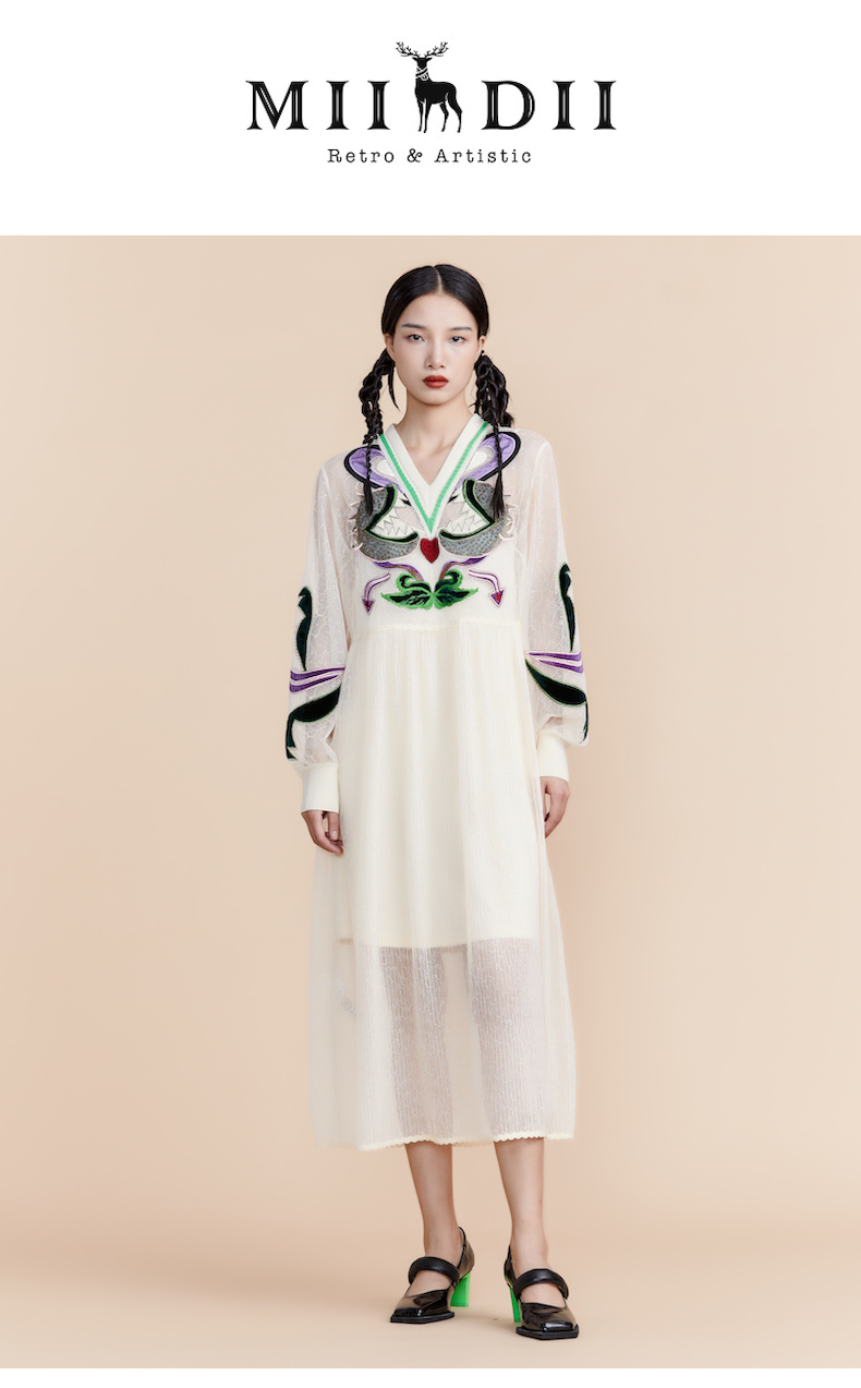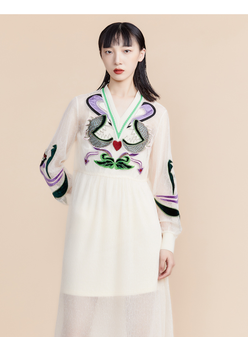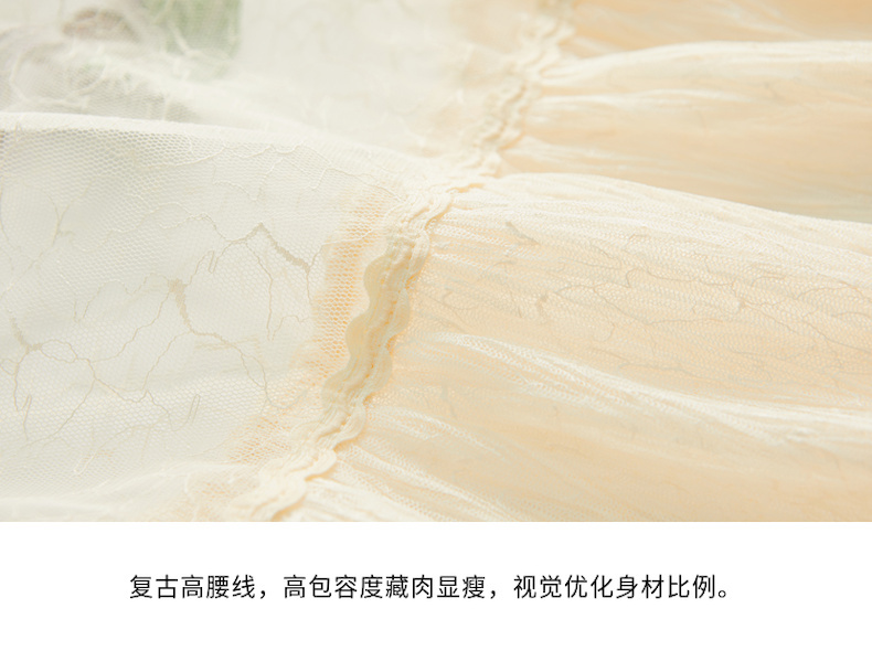 谜底2022春新款高订款晚礼裙复古V领蕾丝连衣裙221GL0095