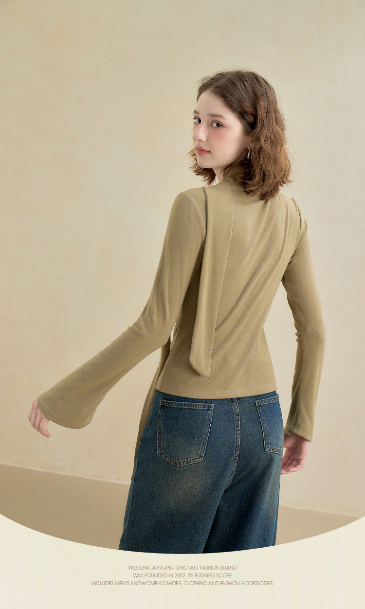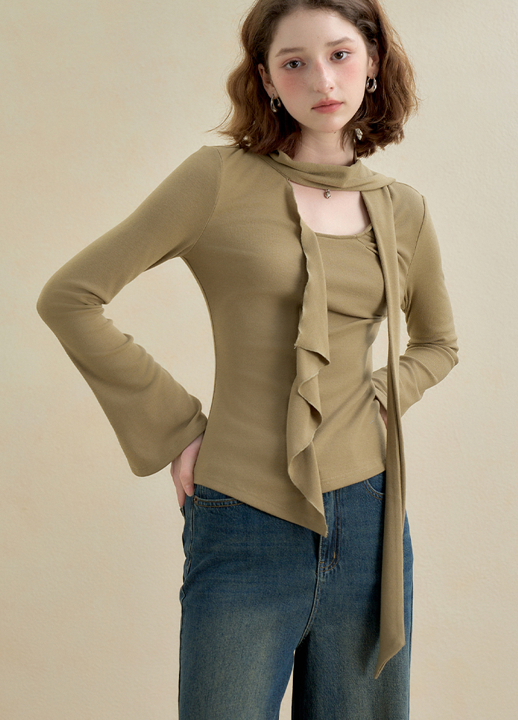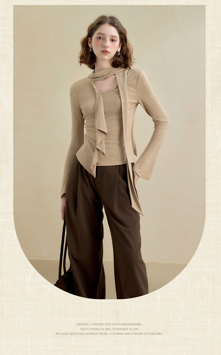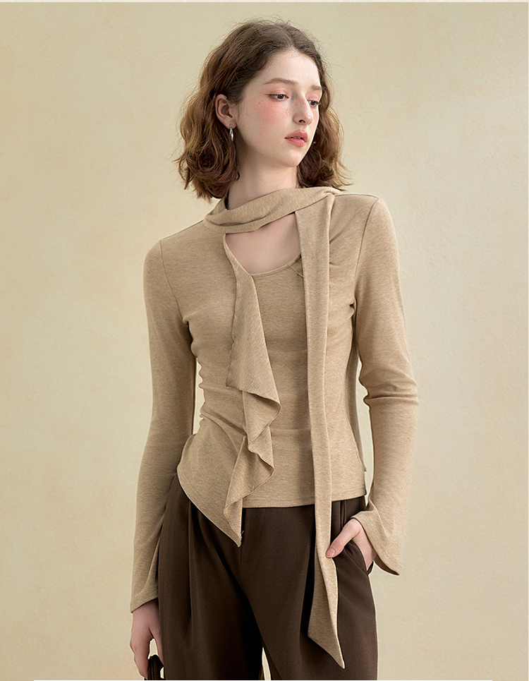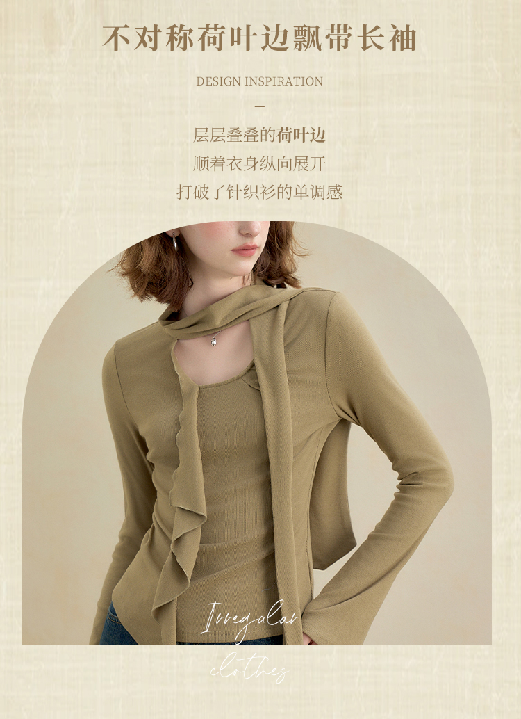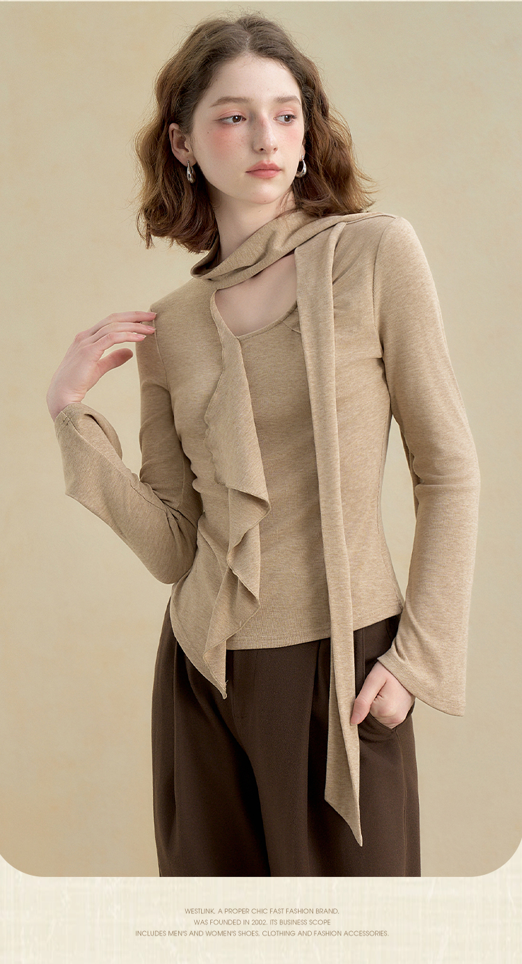 西遇不对称荷叶边飘带长袖T恤女秋季镂空修身打底针织衫V2851161