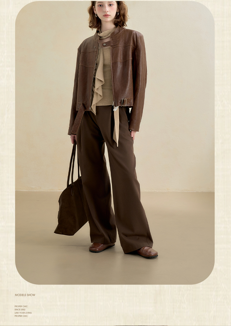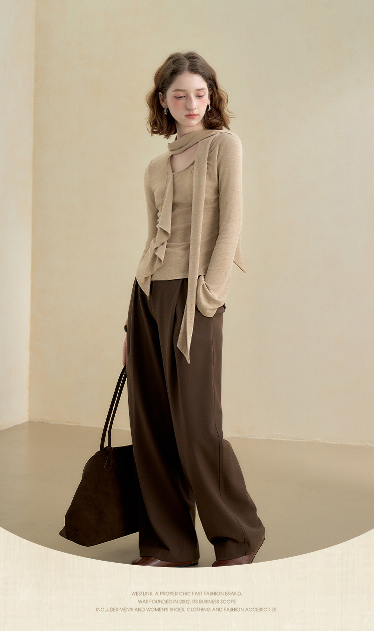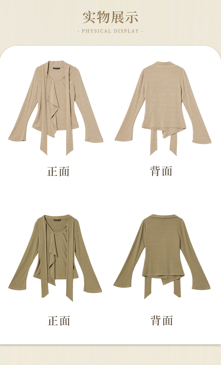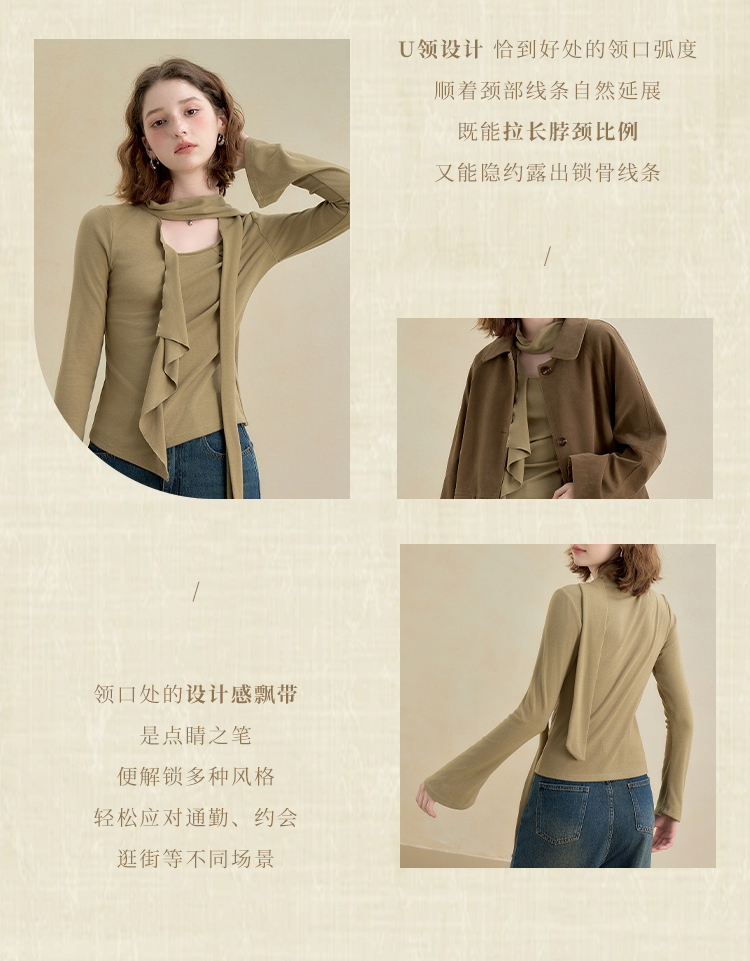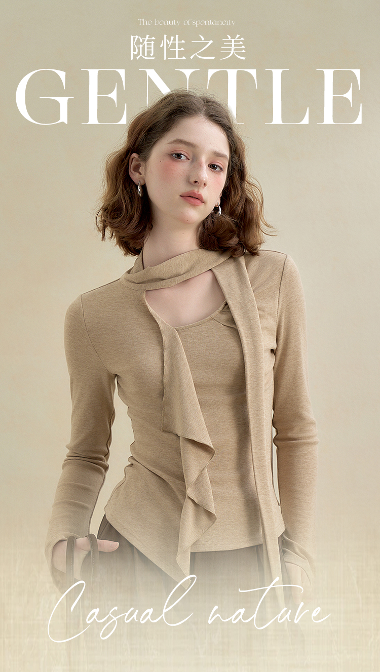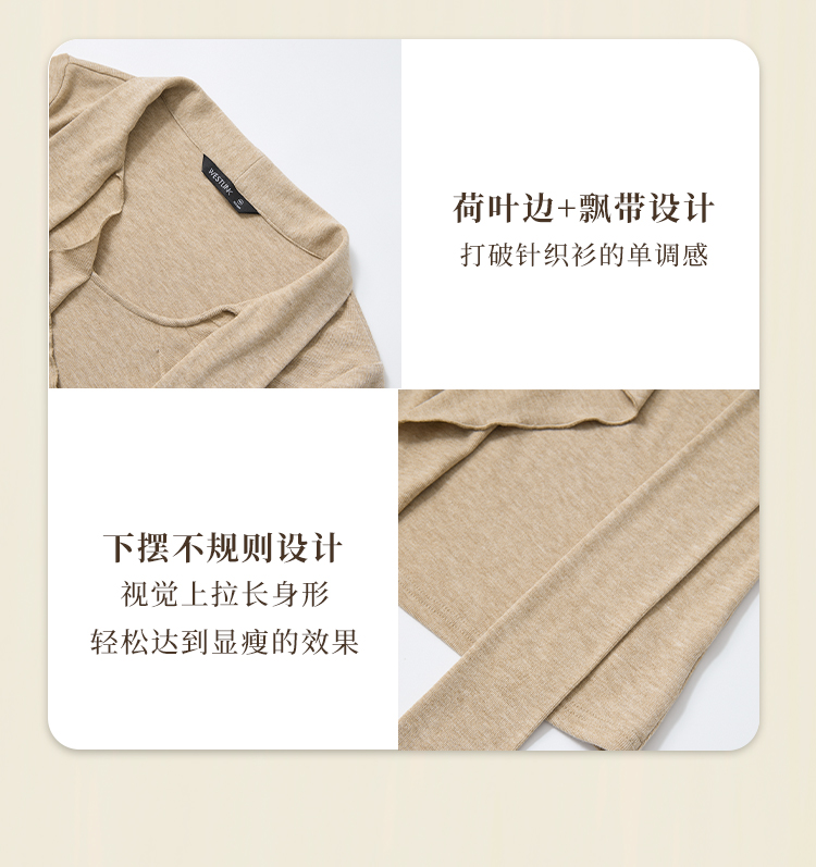 西遇不对称荷叶边飘带长袖T恤女秋季镂空修身打底针织衫V2851161