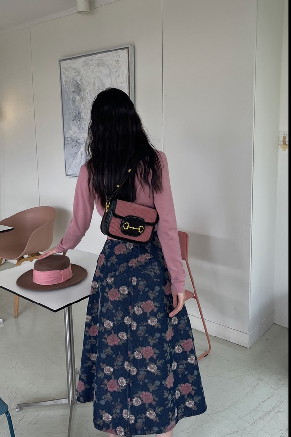 L.Fleuri 花朵图案高腰大A字牛仔半裙 17226