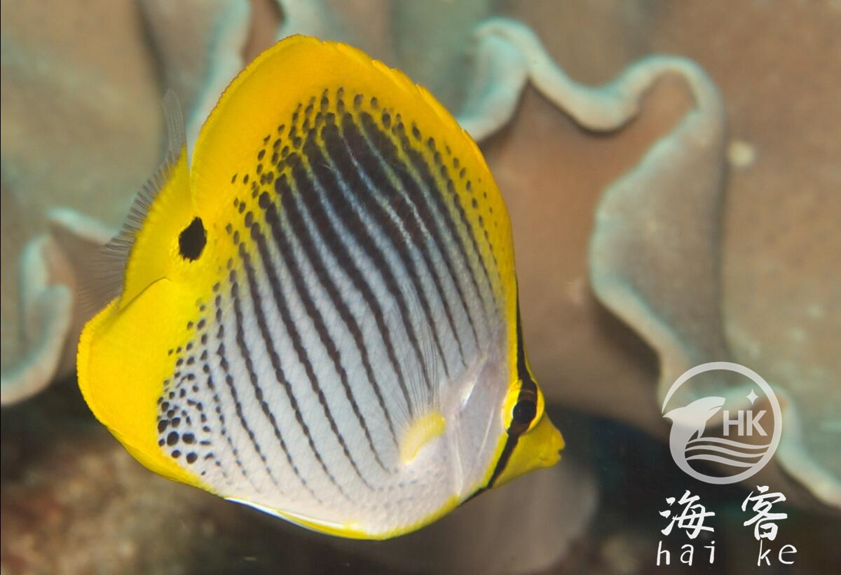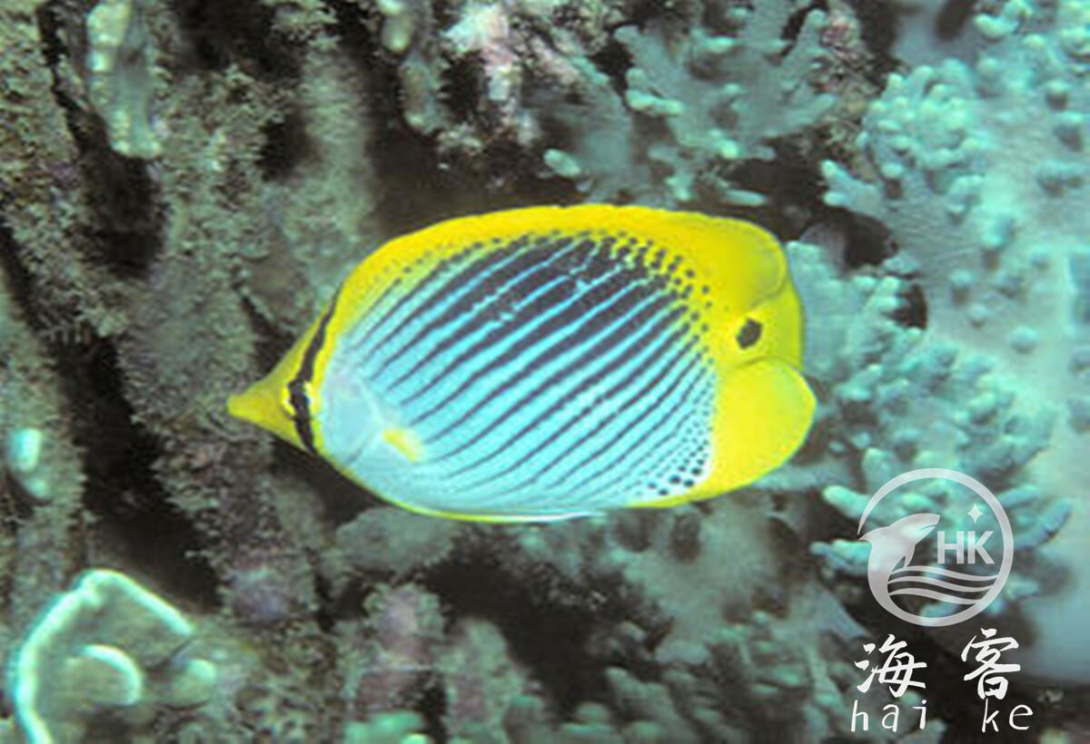 也叫尾点蝴蝶鱼。身体颜色为银白色,头部各鳍都是黄色,身上带有数条黑条纹。
