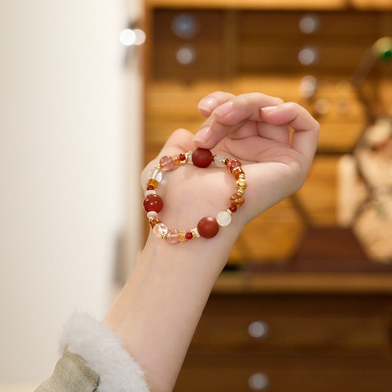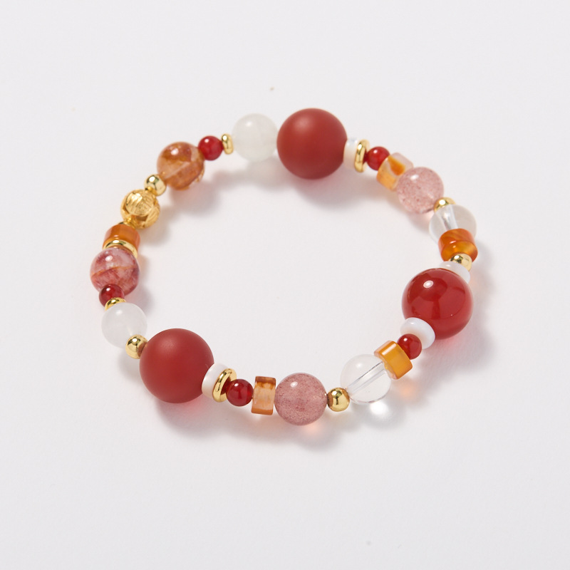 【材质】草莓晶、白水晶、红玛瑙、磨砂红玛瑙、白玉、红胶花水晶、铜镀金配件、白蝶贝